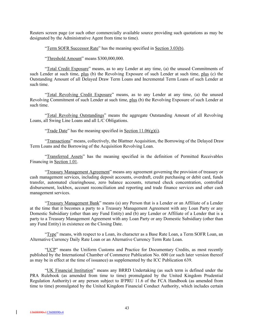 Reuters screen page (or such other commercially available source providing such quotations as may be designated by the Administrative Agent from time to time). “Term SOFR Successor Rate” has the meaning specified in Section 3.03(b). “Threshold Amount” means $300,000,000. “Total Credit Exposure” means, as to any Lender at any time, (a) the unused Commitments of such Lender at such time, plus (b) the Revolving Exposure of such Lender at such time, plus (c) the Outstanding Amount of all Delayed Draw Term Loans and Incremental Term Loans of such Lender at such time. “Total Revolving Credit Exposure” means, as to any Lender at any time, (a) the unused Revolving Commitment of such Lender at such time, plus (b) the Revolving Exposure of such Lender at such time. “Total Revolving Outstandings” means the aggregate Outstanding Amount of all Revolving Loans, all Swing Line Loans and all L/C Obligations. “Trade Date” has the meaning specified in Section 11.06(g)(i). “Transactions” means, collectively, the Blattner Acquisition, the Borrowing of the Delayed Draw Term Loans and the Borrowing of the Acquisition Revolving Loan. “Transferred Assets” has the meaning specified in the definition of Permitted Receivables Financing in Section 1.01. “Treasury Management Agreement” means any agreement governing the provision of treasury or cash management services, including deposit accounts, overdraft, credit purchasing or debit card, funds transfer, automated clearinghouse, zero balance accounts, returned check concentration, controlled disbursement, lockbox, account reconciliation and reporting and trade finance services and other cash management services. “Treasury Management Bank” means (a) any Person that is a Lender or an Affiliate of a Lender at the time that it becomes a party to a Treasury Management Agreement with any Loan Party or any Domestic Subsidiary (other than any Fund Entity) and (b) any Lender or Affiliate of a Lender that is a party to a Treasury Management Agreement with any Loan Party or any Domestic Subsidiary (other than any Fund Entity) in existence on the Closing Date. “Type” means, with respect to a Loan, its character as a Base Rate Loan, a Term SOFR Loan, an Alternative Currency Daily Rate Loan or an Alternative Currency Term Rate Loan. “UCP” means the Uniform Customs and Practice for Documentary Credits, as most recently published by the International Chamber of Commerce Publication No. 600 (or such later version thereof as may be in effect at the time of issuance) as supplemented by the ICC Publication 639. “UK Financial Institution” means any BRRD Undertaking (as such term is defined under the PRA Rulebook (as amended from time to time) promulgated by the United Kingdom Prudential Regulation Authority) or any person subject to IFPRU 11.6 of the FCA Handbook (as amended from time to time) promulgated by the United Kingdom Financial Conduct Authority, which includes certain 43 13608890v113608890v4