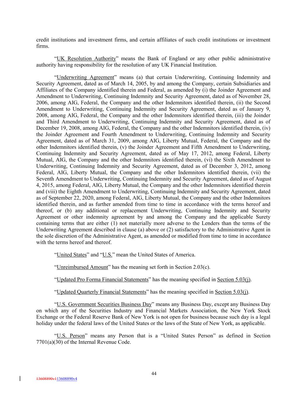 credit institutions and investment firms, and certain affiliates of such credit institutions or investment firms. “UK Resolution Authority” means the Bank of England or any other public administrative authority having responsibility for the resolution of any UK Financial Institution. “Underwriting Agreement” means (a) that certain Underwriting, Continuing Indemnity and Security Agreement, dated as of March 14, 2005, by and among the Company, certain Subsidiaries and Affiliates of the Company identified therein and Federal, as amended by (i) the Joinder Agreement and Amendment to Underwriting, Continuing Indemnity and Security Agreement, dated as of November 28, 2006, among AIG, Federal, the Company and the other Indemnitors identified therein, (ii) the Second Amendment to Underwriting, Continuing Indemnity and Security Agreement, dated as of January 9, 2008, among AIG, Federal, the Company and the other Indemnitors identified therein, (iii) the Joinder and Third Amendment to Underwriting, Continuing Indemnity and Security Agreement, dated as of December 19, 2008, among AIG, Federal, the Company and the other Indemnitors identified therein, (iv) the Joinder Agreement and Fourth Amendment to Underwriting, Continuing Indemnity and Security Agreement, dated as of March 31, 2009, among AIG, Liberty Mutual, Federal, the Company and the other Indemnitors identified therein, (v) the Joinder Agreement and Fifth Amendment to Underwriting, Continuing Indemnity and Security Agreement, dated as of May 17, 2012, among Federal, Liberty Mutual, AIG, the Company and the other Indemnitors identified therein, (vi) the Sixth Amendment to Underwriting, Continuing Indemnity and Security Agreement, dated as of December 3, 2012, among Federal, AIG, Liberty Mutual, the Company and the other Indemnitors identified therein, (vii) the Seventh Amendment to Underwriting, Continuing Indemnity and Security Agreement, dated as of August 4, 2015, among Federal, AIG, Liberty Mutual, the Company and the other Indemnitors identified therein and (viii) the Eighth Amendment to Underwriting, Continuing Indemnity and Security Agreement, dated as of September 22, 2020, among Federal, AIG, Liberty Mutual, the Company and the other Indemnitors identified therein, and as further amended from time to time in accordance with the terms hereof and thereof, or (b) any additional or replacement Underwriting, Continuing Indemnity and Security Agreement or other indemnity agreement by and among the Company and the applicable Surety containing terms that are either (1) not materially more adverse to the Lenders than the terms of the Underwriting Agreement described in clause (a) above or (2) satisfactory to the Administrative Agent in the sole discretion of the Administrative Agent, as amended or modified from time to time in accordance with the terms hereof and thereof. “United States” and “U.S.” mean the United States of America. “Unreimbursed Amount” has the meaning set forth in Section 2.03(c). “Updated Pro Forma Financial Statements” has the meaning specified in Section 5.03(j). “Updated Quarterly Financial Statements” has the meaning specified in Section 5.03(j). “U.S. Government Securities Business Day” means any Business Day, except any Business Day on which any of the Securities Industry and Financial Markets Association, the New York Stock Exchange or the Federal Reserve Bank of New York is not open for business because such day is a legal holiday under the federal laws of the United States or the laws of the State of New York, as applicable. “U.S. Person” means any Person that is a “United States Person” as defined in Section 7701(a)(30) of the Internal Revenue Code. 44 13608890v113608890v4