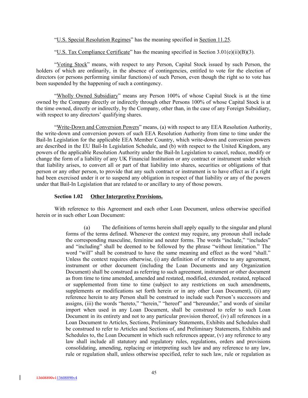“U.S. Special Resolution Regimes” has the meaning specified in Section 11.25. “U.S. Tax Compliance Certificate” has the meaning specified in Section 3.01(e)(ii)(B)(3). “Voting Stock” means, with respect to any Person, Capital Stock issued by such Person, the holders of which are ordinarily, in the absence of contingencies, entitled to vote for the election of directors (or persons performing similar functions) of such Person, even though the right so to vote has been suspended by the happening of such a contingency. “Wholly Owned Subsidiary” means any Person 100% of whose Capital Stock is at the time owned by the Company directly or indirectly through other Persons 100% of whose Capital Stock is at the time owned, directly or indirectly, by the Company, other than, in the case of any Foreign Subsidiary, with respect to any directors’ qualifying shares. “Write-Down and Conversion Powers” means, (a) with respect to any EEA Resolution Authority, the write-down and conversion powers of such EEA Resolution Authority from time to time under the Bail-In Legislation for the applicable EEA Member Country, which write-down and conversion powers are described in the EU Bail-In Legislation Schedule, and (b) with respect to the United Kingdom, any powers of the applicable Resolution Authority under the Bail-In Legislation to cancel, reduce, modify or change the form of a liability of any UK Financial Institution or any contract or instrument under which that liability arises, to convert all or part of that liability into shares, securities or obligations of that person or any other person, to provide that any such contract or instrument is to have effect as if a right had been exercised under it or to suspend any obligation in respect of that liability or any of the powers under that Bail-In Legislation that are related to or ancillary to any of those powers. Section 1.02 Other Interpretive Provisions. With reference to this Agreement and each other Loan Document, unless otherwise specified herein or in such other Loan Document: (a) The definitions of terms herein shall apply equally to the singular and plural forms of the terms defined. Whenever the context may require, any pronoun shall include the corresponding masculine, feminine and neuter forms. The words “include,” “includes” and “including” shall be deemed to be followed by the phrase “without limitation.” The word “will” shall be construed to have the same meaning and effect as the word “shall.” Unless the context requires otherwise, (i) any definition of or reference to any agreement, instrument or other document (including the Loan Documents and any Organization Document) shall be construed as referring to such agreement, instrument or other document as from time to time amended, amended and restated, modified, extended, restated, replaced or supplemented from time to time (subject to any restrictions on such amendments, supplements or modifications set forth herein or in any other Loan Document), (ii) any reference herein to any Person shall be construed to include such Person’s successors and assigns, (iii) the words “hereto,” “herein,” “hereof” and “hereunder,” and words of similar import when used in any Loan Document, shall be construed to refer to such Loan Document in its entirety and not to any particular provision thereof, (iv) all references in a Loan Document to Articles, Sections, Preliminary Statements, Exhibits and Schedules shall be construed to refer to Articles and Sections of, and Preliminary Statements, Exhibits and Schedules to, the Loan Document in which such references appear, (v) any reference to any law shall include all statutory and regulatory rules, regulations, orders and provisions consolidating, amending, replacing or interpreting such law and any reference to any law, rule or regulation shall, unless otherwise specified, refer to such law, rule or regulation as 45 13608890v113608890v4