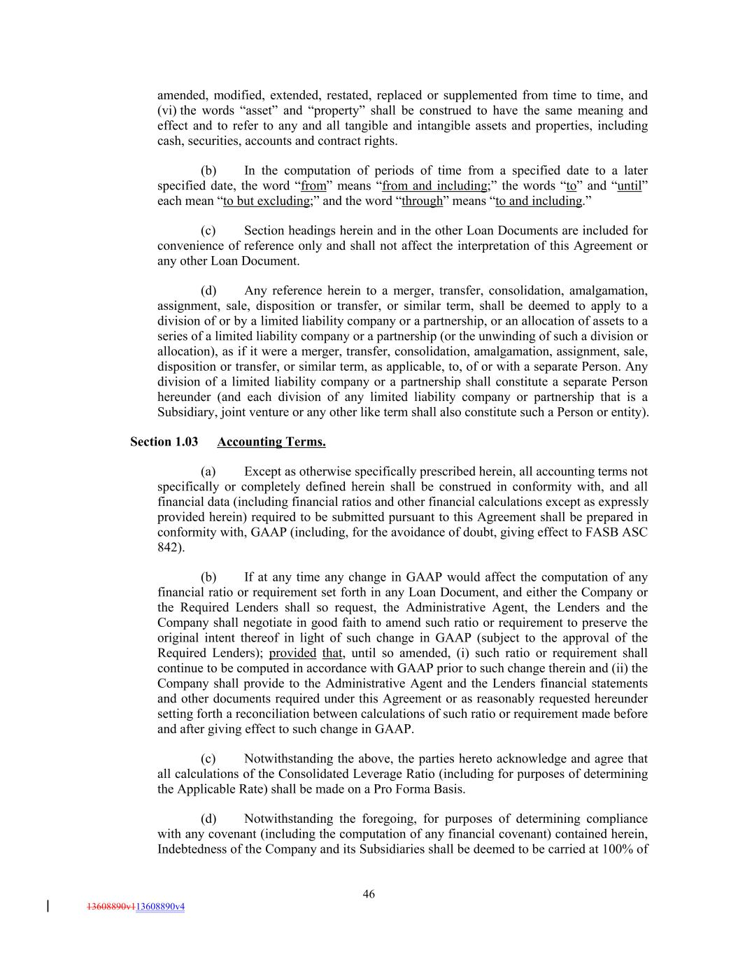 amended, modified, extended, restated, replaced or supplemented from time to time, and (vi) the words “asset” and “property” shall be construed to have the same meaning and effect and to refer to any and all tangible and intangible assets and properties, including cash, securities, accounts and contract rights. (b) In the computation of periods of time from a specified date to a later specified date, the word “from” means “from and including;” the words “to” and “until” each mean “to but excluding;” and the word “through” means “to and including.” (c) Section headings herein and in the other Loan Documents are included for convenience of reference only and shall not affect the interpretation of this Agreement or any other Loan Document. (d) Any reference herein to a merger, transfer, consolidation, amalgamation, assignment, sale, disposition or transfer, or similar term, shall be deemed to apply to a division of or by a limited liability company or a partnership, or an allocation of assets to a series of a limited liability company or a partnership (or the unwinding of such a division or allocation), as if it were a merger, transfer, consolidation, amalgamation, assignment, sale, disposition or transfer, or similar term, as applicable, to, of or with a separate Person. Any division of a limited liability company or a partnership shall constitute a separate Person hereunder (and each division of any limited liability company or partnership that is a Subsidiary, joint venture or any other like term shall also constitute such a Person or entity). Section 1.03 Accounting Terms. (a) Except as otherwise specifically prescribed herein, all accounting terms not specifically or completely defined herein shall be construed in conformity with, and all financial data (including financial ratios and other financial calculations except as expressly provided herein) required to be submitted pursuant to this Agreement shall be prepared in conformity with, GAAP (including, for the avoidance of doubt, giving effect to FASB ASC 842). (b) If at any time any change in GAAP would affect the computation of any financial ratio or requirement set forth in any Loan Document, and either the Company or the Required Lenders shall so request, the Administrative Agent, the Lenders and the Company shall negotiate in good faith to amend such ratio or requirement to preserve the original intent thereof in light of such change in GAAP (subject to the approval of the Required Lenders); provided that, until so amended, (i) such ratio or requirement shall continue to be computed in accordance with GAAP prior to such change therein and (ii) the Company shall provide to the Administrative Agent and the Lenders financial statements and other documents required under this Agreement or as reasonably requested hereunder setting forth a reconciliation between calculations of such ratio or requirement made before and after giving effect to such change in GAAP. (c) Notwithstanding the above, the parties hereto acknowledge and agree that all calculations of the Consolidated Leverage Ratio (including for purposes of determining the Applicable Rate) shall be made on a Pro Forma Basis. (d) Notwithstanding the foregoing, for purposes of determining compliance with any covenant (including the computation of any financial covenant) contained herein, Indebtedness of the Company and its Subsidiaries shall be deemed to be carried at 100% of 46 13608890v113608890v4