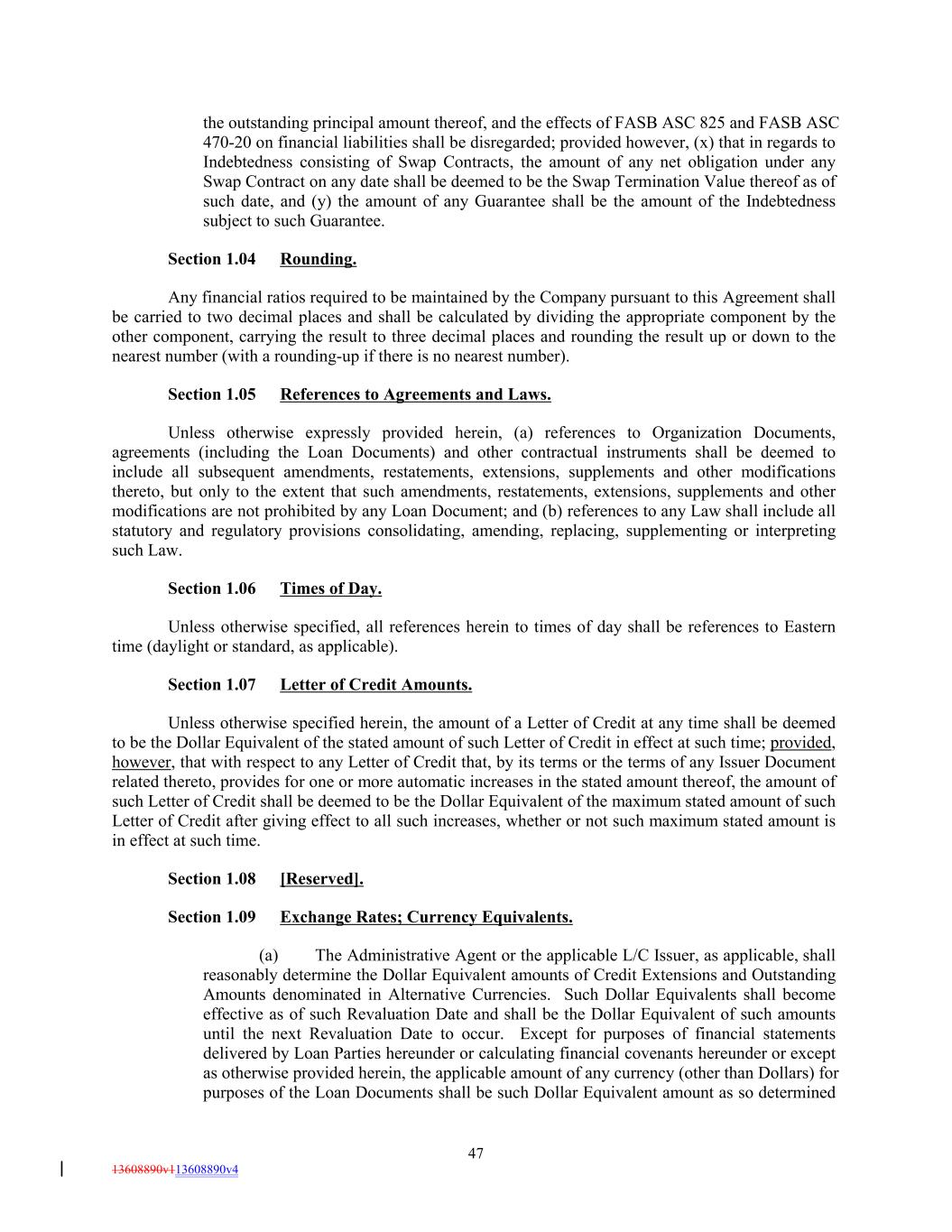 the outstanding principal amount thereof, and the effects of FASB ASC 825 and FASB ASC 470-20 on financial liabilities shall be disregarded; provided however, (x) that in regards to Indebtedness consisting of Swap Contracts, the amount of any net obligation under any Swap Contract on any date shall be deemed to be the Swap Termination Value thereof as of such date, and (y) the amount of any Guarantee shall be the amount of the Indebtedness subject to such Guarantee. Section 1.04 Rounding. Any financial ratios required to be maintained by the Company pursuant to this Agreement shall be carried to two decimal places and shall be calculated by dividing the appropriate component by the other component, carrying the result to three decimal places and rounding the result up or down to the nearest number (with a rounding-up if there is no nearest number). Section 1.05 References to Agreements and Laws. Unless otherwise expressly provided herein, (a) references to Organization Documents, agreements (including the Loan Documents) and other contractual instruments shall be deemed to include all subsequent amendments, restatements, extensions, supplements and other modifications thereto, but only to the extent that such amendments, restatements, extensions, supplements and other modifications are not prohibited by any Loan Document; and (b) references to any Law shall include all statutory and regulatory provisions consolidating, amending, replacing, supplementing or interpreting such Law. Section 1.06 Times of Day. Unless otherwise specified, all references herein to times of day shall be references to Eastern time (daylight or standard, as applicable). Section 1.07 Letter of Credit Amounts. Unless otherwise specified herein, the amount of a Letter of Credit at any time shall be deemed to be the Dollar Equivalent of the stated amount of such Letter of Credit in effect at such time; provided, however, that with respect to any Letter of Credit that, by its terms or the terms of any Issuer Document related thereto, provides for one or more automatic increases in the stated amount thereof, the amount of such Letter of Credit shall be deemed to be the Dollar Equivalent of the maximum stated amount of such Letter of Credit after giving effect to all such increases, whether or not such maximum stated amount is in effect at such time. Section 1.08 [Reserved]. Section 1.09 Exchange Rates; Currency Equivalents. (a) The Administrative Agent or the applicable L/C Issuer, as applicable, shall reasonably determine the Dollar Equivalent amounts of Credit Extensions and Outstanding Amounts denominated in Alternative Currencies. Such Dollar Equivalents shall become effective as of such Revaluation Date and shall be the Dollar Equivalent of such amounts until the next Revaluation Date to occur. Except for purposes of financial statements delivered by Loan Parties hereunder or calculating financial covenants hereunder or except as otherwise provided herein, the applicable amount of any currency (other than Dollars) for purposes of the Loan Documents shall be such Dollar Equivalent amount as so determined 47 13608890v113608890v4