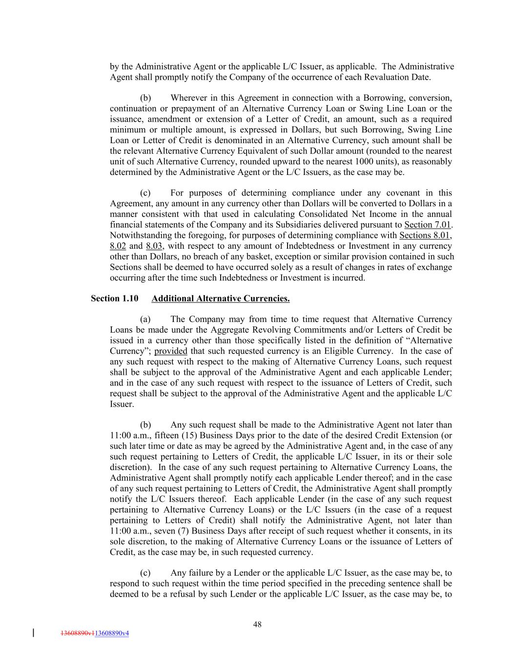 by the Administrative Agent or the applicable L/C Issuer, as applicable. The Administrative Agent shall promptly notify the Company of the occurrence of each Revaluation Date. (b) Wherever in this Agreement in connection with a Borrowing, conversion, continuation or prepayment of an Alternative Currency Loan or Swing Line Loan or the issuance, amendment or extension of a Letter of Credit, an amount, such as a required minimum or multiple amount, is expressed in Dollars, but such Borrowing, Swing Line Loan or Letter of Credit is denominated in an Alternative Currency, such amount shall be the relevant Alternative Currency Equivalent of such Dollar amount (rounded to the nearest unit of such Alternative Currency, rounded upward to the nearest 1000 units), as reasonably determined by the Administrative Agent or the L/C Issuers, as the case may be. (c) For purposes of determining compliance under any covenant in this Agreement, any amount in any currency other than Dollars will be converted to Dollars in a manner consistent with that used in calculating Consolidated Net Income in the annual financial statements of the Company and its Subsidiaries delivered pursuant to Section 7.01. Notwithstanding the foregoing, for purposes of determining compliance with Sections 8.01, 8.02 and 8.03, with respect to any amount of Indebtedness or Investment in any currency other than Dollars, no breach of any basket, exception or similar provision contained in such Sections shall be deemed to have occurred solely as a result of changes in rates of exchange occurring after the time such Indebtedness or Investment is incurred. Section 1.10 Additional Alternative Currencies. (a) The Company may from time to time request that Alternative Currency Loans be made under the Aggregate Revolving Commitments and/or Letters of Credit be issued in a currency other than those specifically listed in the definition of “Alternative Currency”; provided that such requested currency is an Eligible Currency. In the case of any such request with respect to the making of Alternative Currency Loans, such request shall be subject to the approval of the Administrative Agent and each applicable Lender; and in the case of any such request with respect to the issuance of Letters of Credit, such request shall be subject to the approval of the Administrative Agent and the applicable L/C Issuer. (b) Any such request shall be made to the Administrative Agent not later than 11:00 a.m., fifteen (15) Business Days prior to the date of the desired Credit Extension (or such later time or date as may be agreed by the Administrative Agent and, in the case of any such request pertaining to Letters of Credit, the applicable L/C Issuer, in its or their sole discretion). In the case of any such request pertaining to Alternative Currency Loans, the Administrative Agent shall promptly notify each applicable Lender thereof; and in the case of any such request pertaining to Letters of Credit, the Administrative Agent shall promptly notify the L/C Issuers thereof. Each applicable Lender (in the case of any such request pertaining to Alternative Currency Loans) or the L/C Issuers (in the case of a request pertaining to Letters of Credit) shall notify the Administrative Agent, not later than 11:00 a.m., seven (7) Business Days after receipt of such request whether it consents, in its sole discretion, to the making of Alternative Currency Loans or the issuance of Letters of Credit, as the case may be, in such requested currency. (c) Any failure by a Lender or the applicable L/C Issuer, as the case may be, to respond to such request within the time period specified in the preceding sentence shall be deemed to be a refusal by such Lender or the applicable L/C Issuer, as the case may be, to 48 13608890v113608890v4