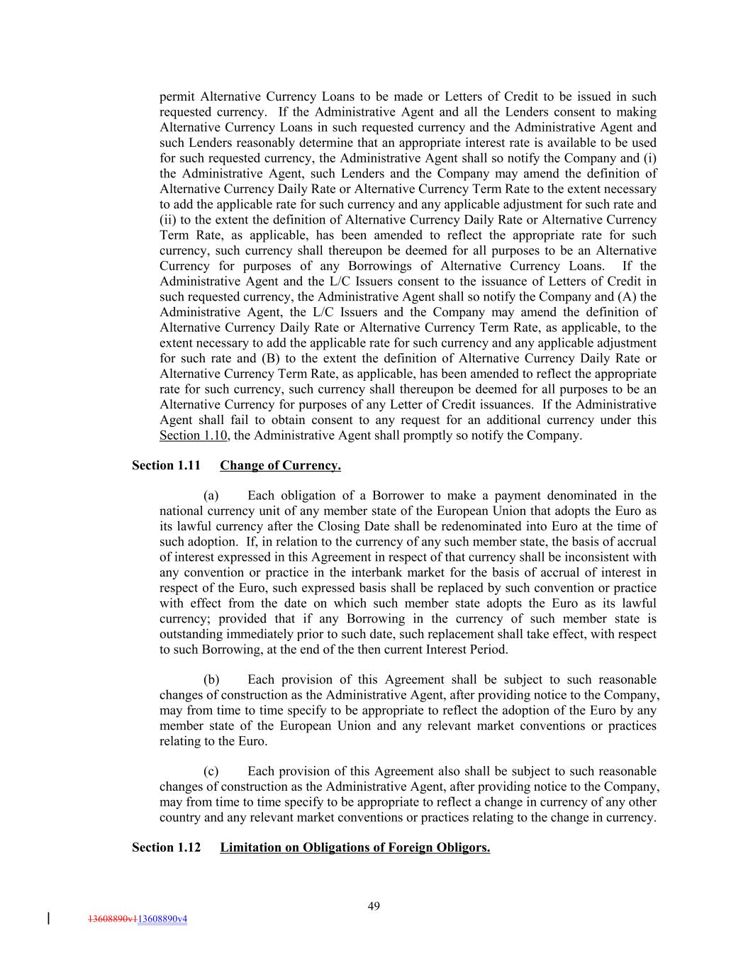 permit Alternative Currency Loans to be made or Letters of Credit to be issued in such requested currency. If the Administrative Agent and all the Lenders consent to making Alternative Currency Loans in such requested currency and the Administrative Agent and such Lenders reasonably determine that an appropriate interest rate is available to be used for such requested currency, the Administrative Agent shall so notify the Company and (i) the Administrative Agent, such Lenders and the Company may amend the definition of Alternative Currency Daily Rate or Alternative Currency Term Rate to the extent necessary to add the applicable rate for such currency and any applicable adjustment for such rate and (ii) to the extent the definition of Alternative Currency Daily Rate or Alternative Currency Term Rate, as applicable, has been amended to reflect the appropriate rate for such currency, such currency shall thereupon be deemed for all purposes to be an Alternative Currency for purposes of any Borrowings of Alternative Currency Loans. If the Administrative Agent and the L/C Issuers consent to the issuance of Letters of Credit in such requested currency, the Administrative Agent shall so notify the Company and (A) the Administrative Agent, the L/C Issuers and the Company may amend the definition of Alternative Currency Daily Rate or Alternative Currency Term Rate, as applicable, to the extent necessary to add the applicable rate for such currency and any applicable adjustment for such rate and (B) to the extent the definition of Alternative Currency Daily Rate or Alternative Currency Term Rate, as applicable, has been amended to reflect the appropriate rate for such currency, such currency shall thereupon be deemed for all purposes to be an Alternative Currency for purposes of any Letter of Credit issuances. If the Administrative Agent shall fail to obtain consent to any request for an additional currency under this Section 1.10, the Administrative Agent shall promptly so notify the Company. Section 1.11 Change of Currency. (a) Each obligation of a Borrower to make a payment denominated in the national currency unit of any member state of the European Union that adopts the Euro as its lawful currency after the Closing Date shall be redenominated into Euro at the time of such adoption. If, in relation to the currency of any such member state, the basis of accrual of interest expressed in this Agreement in respect of that currency shall be inconsistent with any convention or practice in the interbank market for the basis of accrual of interest in respect of the Euro, such expressed basis shall be replaced by such convention or practice with effect from the date on which such member state adopts the Euro as its lawful currency; provided that if any Borrowing in the currency of such member state is outstanding immediately prior to such date, such replacement shall take effect, with respect to such Borrowing, at the end of the then current Interest Period. (b) Each provision of this Agreement shall be subject to such reasonable changes of construction as the Administrative Agent, after providing notice to the Company, may from time to time specify to be appropriate to reflect the adoption of the Euro by any member state of the European Union and any relevant market conventions or practices relating to the Euro. (c) Each provision of this Agreement also shall be subject to such reasonable changes of construction as the Administrative Agent, after providing notice to the Company, may from time to time specify to be appropriate to reflect a change in currency of any other country and any relevant market conventions or practices relating to the change in currency. Section 1.12 Limitation on Obligations of Foreign Obligors. 49 13608890v113608890v4