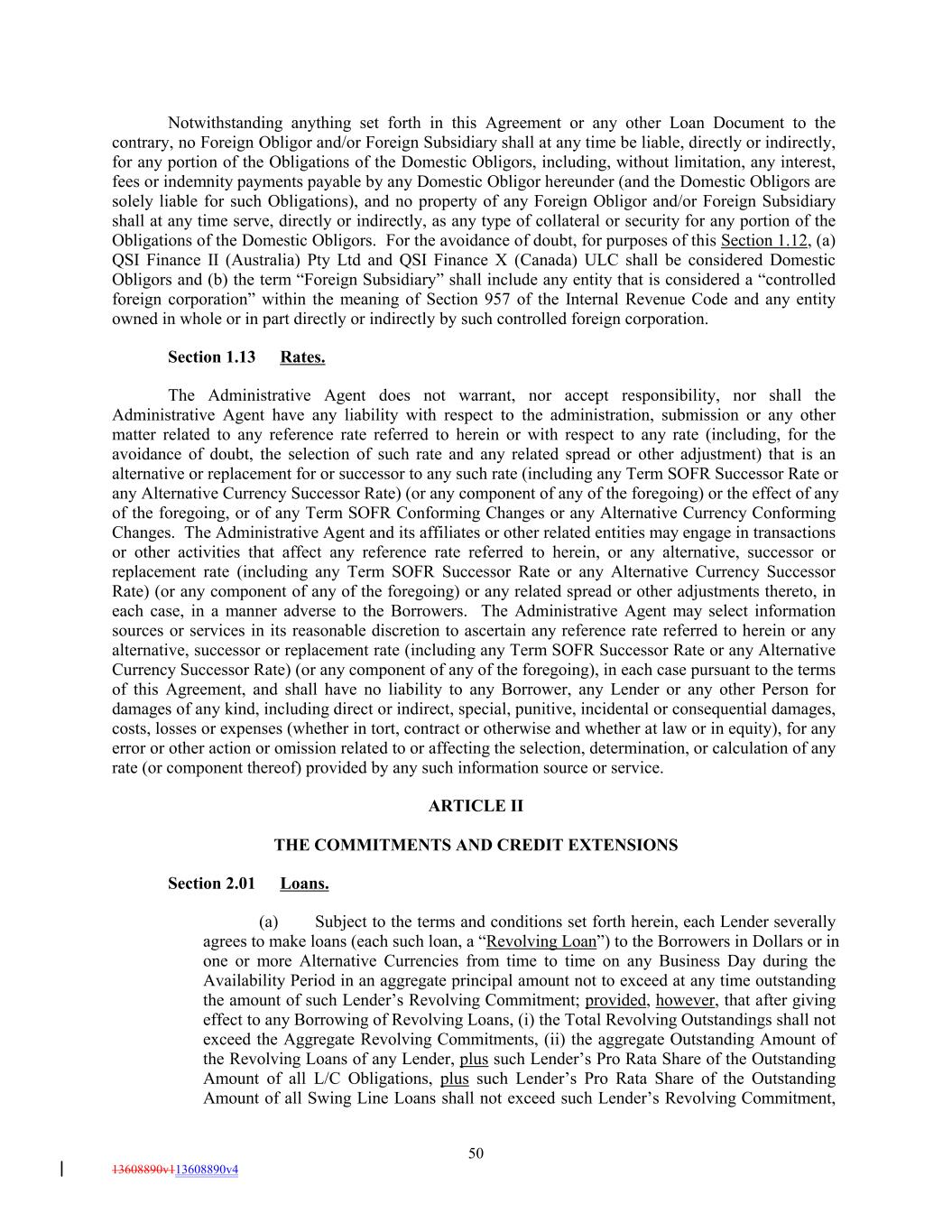 Notwithstanding anything set forth in this Agreement or any other Loan Document to the contrary, no Foreign Obligor and/or Foreign Subsidiary shall at any time be liable, directly or indirectly, for any portion of the Obligations of the Domestic Obligors, including, without limitation, any interest, fees or indemnity payments payable by any Domestic Obligor hereunder (and the Domestic Obligors are solely liable for such Obligations), and no property of any Foreign Obligor and/or Foreign Subsidiary shall at any time serve, directly or indirectly, as any type of collateral or security for any portion of the Obligations of the Domestic Obligors. For the avoidance of doubt, for purposes of this Section 1.12, (a) QSI Finance II (Australia) Pty Ltd and QSI Finance X (Canada) ULC shall be considered Domestic Obligors and (b) the term “Foreign Subsidiary” shall include any entity that is considered a “controlled foreign corporation” within the meaning of Section 957 of the Internal Revenue Code and any entity owned in whole or in part directly or indirectly by such controlled foreign corporation. Section 1.13 Rates. The Administrative Agent does not warrant, nor accept responsibility, nor shall the Administrative Agent have any liability with respect to the administration, submission or any other matter related to any reference rate referred to herein or with respect to any rate (including, for the avoidance of doubt, the selection of such rate and any related spread or other adjustment) that is an alternative or replacement for or successor to any such rate (including any Term SOFR Successor Rate or any Alternative Currency Successor Rate) (or any component of any of the foregoing) or the effect of any of the foregoing, or of any Term SOFR Conforming Changes or any Alternative Currency Conforming Changes. The Administrative Agent and its affiliates or other related entities may engage in transactions or other activities that affect any reference rate referred to herein, or any alternative, successor or replacement rate (including any Term SOFR Successor Rate or any Alternative Currency Successor Rate) (or any component of any of the foregoing) or any related spread or other adjustments thereto, in each case, in a manner adverse to the Borrowers. The Administrative Agent may select information sources or services in its reasonable discretion to ascertain any reference rate referred to herein or any alternative, successor or replacement rate (including any Term SOFR Successor Rate or any Alternative Currency Successor Rate) (or any component of any of the foregoing), in each case pursuant to the terms of this Agreement, and shall have no liability to any Borrower, any Lender or any other Person for damages of any kind, including direct or indirect, special, punitive, incidental or consequential damages, costs, losses or expenses (whether in tort, contract or otherwise and whether at law or in equity), for any error or other action or omission related to or affecting the selection, determination, or calculation of any rate (or component thereof) provided by any such information source or service. ARTICLE II THE COMMITMENTS AND CREDIT EXTENSIONS Section 2.01 Loans. (a) Subject to the terms and conditions set forth herein, each Lender severally agrees to make loans (each such loan, a “Revolving Loan”) to the Borrowers in Dollars or in one or more Alternative Currencies from time to time on any Business Day during the Availability Period in an aggregate principal amount not to exceed at any time outstanding the amount of such Lender’s Revolving Commitment; provided, however, that after giving effect to any Borrowing of Revolving Loans, (i) the Total Revolving Outstandings shall not exceed the Aggregate Revolving Commitments, (ii) the aggregate Outstanding Amount of the Revolving Loans of any Lender, plus such Lender’s Pro Rata Share of the Outstanding Amount of all L/C Obligations, plus such Lender’s Pro Rata Share of the Outstanding Amount of all Swing Line Loans shall not exceed such Lender’s Revolving Commitment, 50 13608890v113608890v4
