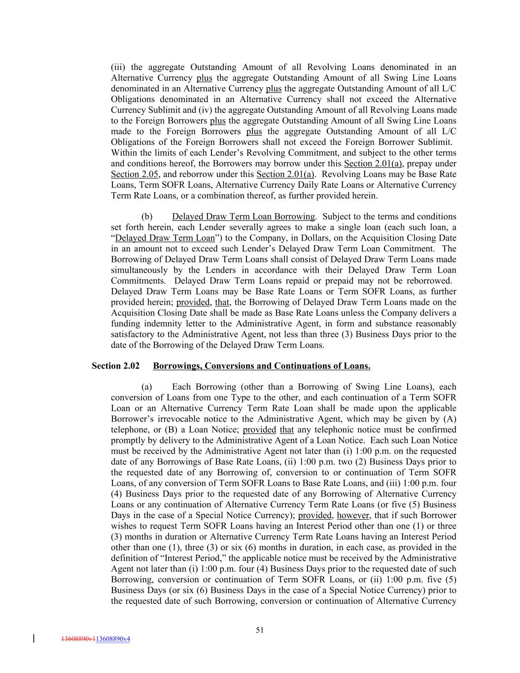 (iii) the aggregate Outstanding Amount of all Revolving Loans denominated in an Alternative Currency plus the aggregate Outstanding Amount of all Swing Line Loans denominated in an Alternative Currency plus the aggregate Outstanding Amount of all L/C Obligations denominated in an Alternative Currency shall not exceed the Alternative Currency Sublimit and (iv) the aggregate Outstanding Amount of all Revolving Loans made to the Foreign Borrowers plus the aggregate Outstanding Amount of all Swing Line Loans made to the Foreign Borrowers plus the aggregate Outstanding Amount of all L/C Obligations of the Foreign Borrowers shall not exceed the Foreign Borrower Sublimit. Within the limits of each Lender’s Revolving Commitment, and subject to the other terms and conditions hereof, the Borrowers may borrow under this Section 2.01(a), prepay under Section 2.05, and reborrow under this Section 2.01(a). Revolving Loans may be Base Rate Loans, Term SOFR Loans, Alternative Currency Daily Rate Loans or Alternative Currency Term Rate Loans, or a combination thereof, as further provided herein. (b) Delayed Draw Term Loan Borrowing. Subject to the terms and conditions set forth herein, each Lender severally agrees to make a single loan (each such loan, a “Delayed Draw Term Loan”) to the Company, in Dollars, on the Acquisition Closing Date in an amount not to exceed such Lender’s Delayed Draw Term Loan Commitment. The Borrowing of Delayed Draw Term Loans shall consist of Delayed Draw Term Loans made simultaneously by the Lenders in accordance with their Delayed Draw Term Loan Commitments. Delayed Draw Term Loans repaid or prepaid may not be reborrowed. Delayed Draw Term Loans may be Base Rate Loans or Term SOFR Loans, as further provided herein; provided, that, the Borrowing of Delayed Draw Term Loans made on the Acquisition Closing Date shall be made as Base Rate Loans unless the Company delivers a funding indemnity letter to the Administrative Agent, in form and substance reasonably satisfactory to the Administrative Agent, not less than three (3) Business Days prior to the date of the Borrowing of the Delayed Draw Term Loans. Section 2.02 Borrowings, Conversions and Continuations of Loans. (a) Each Borrowing (other than a Borrowing of Swing Line Loans), each conversion of Loans from one Type to the other, and each continuation of a Term SOFR Loan or an Alternative Currency Term Rate Loan shall be made upon the applicable Borrower’s irrevocable notice to the Administrative Agent, which may be given by (A) telephone, or (B) a Loan Notice; provided that any telephonic notice must be confirmed promptly by delivery to the Administrative Agent of a Loan Notice. Each such Loan Notice must be received by the Administrative Agent not later than (i) 1:00 p.m. on the requested date of any Borrowings of Base Rate Loans, (ii) 1:00 p.m. two (2) Business Days prior to the requested date of any Borrowing of, conversion to or continuation of Term SOFR Loans, of any conversion of Term SOFR Loans to Base Rate Loans, and (iii) 1:00 p.m. four (4) Business Days prior to the requested date of any Borrowing of Alternative Currency Loans or any continuation of Alternative Currency Term Rate Loans (or five (5) Business Days in the case of a Special Notice Currency); provided, however, that if such Borrower wishes to request Term SOFR Loans having an Interest Period other than one (1) or three (3) months in duration or Alternative Currency Term Rate Loans having an Interest Period other than one (1), three (3) or six (6) months in duration, in each case, as provided in the definition of “Interest Period,” the applicable notice must be received by the Administrative Agent not later than (i) 1:00 p.m. four (4) Business Days prior to the requested date of such Borrowing, conversion or continuation of Term SOFR Loans, or (ii) 1:00 p.m. five (5) Business Days (or six (6) Business Days in the case of a Special Notice Currency) prior to the requested date of such Borrowing, conversion or continuation of Alternative Currency 51 13608890v113608890v4