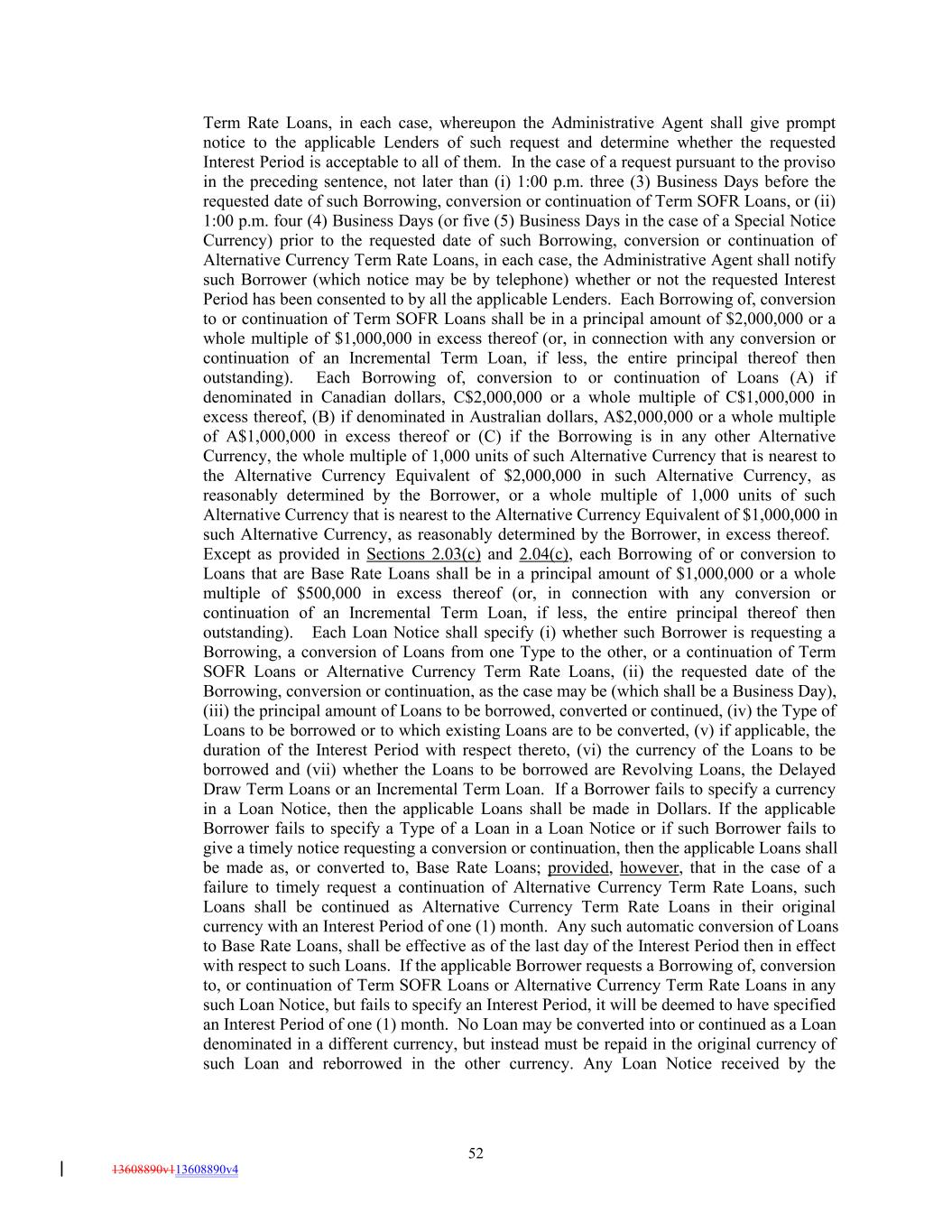 Term Rate Loans, in each case, whereupon the Administrative Agent shall give prompt notice to the applicable Lenders of such request and determine whether the requested Interest Period is acceptable to all of them. In the case of a request pursuant to the proviso in the preceding sentence, not later than (i) 1:00 p.m. three (3) Business Days before the requested date of such Borrowing, conversion or continuation of Term SOFR Loans, or (ii) 1:00 p.m. four (4) Business Days (or five (5) Business Days in the case of a Special Notice Currency) prior to the requested date of such Borrowing, conversion or continuation of Alternative Currency Term Rate Loans, in each case, the Administrative Agent shall notify such Borrower (which notice may be by telephone) whether or not the requested Interest Period has been consented to by all the applicable Lenders. Each Borrowing of, conversion to or continuation of Term SOFR Loans shall be in a principal amount of $2,000,000 or a whole multiple of $1,000,000 in excess thereof (or, in connection with any conversion or continuation of an Incremental Term Loan, if less, the entire principal thereof then outstanding). Each Borrowing of, conversion to or continuation of Loans (A) if denominated in Canadian dollars, C$2,000,000 or a whole multiple of C$1,000,000 in excess thereof, (B) if denominated in Australian dollars, A$2,000,000 or a whole multiple of A$1,000,000 in excess thereof or (C) if the Borrowing is in any other Alternative Currency, the whole multiple of 1,000 units of such Alternative Currency that is nearest to the Alternative Currency Equivalent of $2,000,000 in such Alternative Currency, as reasonably determined by the Borrower, or a whole multiple of 1,000 units of such Alternative Currency that is nearest to the Alternative Currency Equivalent of $1,000,000 in such Alternative Currency, as reasonably determined by the Borrower, in excess thereof. Except as provided in Sections 2.03(c) and 2.04(c), each Borrowing of or conversion to Loans that are Base Rate Loans shall be in a principal amount of $1,000,000 or a whole multiple of $500,000 in excess thereof (or, in connection with any conversion or continuation of an Incremental Term Loan, if less, the entire principal thereof then outstanding). Each Loan Notice shall specify (i) whether such Borrower is requesting a Borrowing, a conversion of Loans from one Type to the other, or a continuation of Term SOFR Loans or Alternative Currency Term Rate Loans, (ii) the requested date of the Borrowing, conversion or continuation, as the case may be (which shall be a Business Day), (iii) the principal amount of Loans to be borrowed, converted or continued, (iv) the Type of Loans to be borrowed or to which existing Loans are to be converted, (v) if applicable, the duration of the Interest Period with respect thereto, (vi) the currency of the Loans to be borrowed and (vii) whether the Loans to be borrowed are Revolving Loans, the Delayed Draw Term Loans or an Incremental Term Loan. If a Borrower fails to specify a currency in a Loan Notice, then the applicable Loans shall be made in Dollars. If the applicable Borrower fails to specify a Type of a Loan in a Loan Notice or if such Borrower fails to give a timely notice requesting a conversion or continuation, then the applicable Loans shall be made as, or converted to, Base Rate Loans; provided, however, that in the case of a failure to timely request a continuation of Alternative Currency Term Rate Loans, such Loans shall be continued as Alternative Currency Term Rate Loans in their original currency with an Interest Period of one (1) month. Any such automatic conversion of Loans to Base Rate Loans, shall be effective as of the last day of the Interest Period then in effect with respect to such Loans. If the applicable Borrower requests a Borrowing of, conversion to, or continuation of Term SOFR Loans or Alternative Currency Term Rate Loans in any such Loan Notice, but fails to specify an Interest Period, it will be deemed to have specified an Interest Period of one (1) month. No Loan may be converted into or continued as a Loan denominated in a different currency, but instead must be repaid in the original currency of such Loan and reborrowed in the other currency. Any Loan Notice received by the 52 13608890v113608890v4
