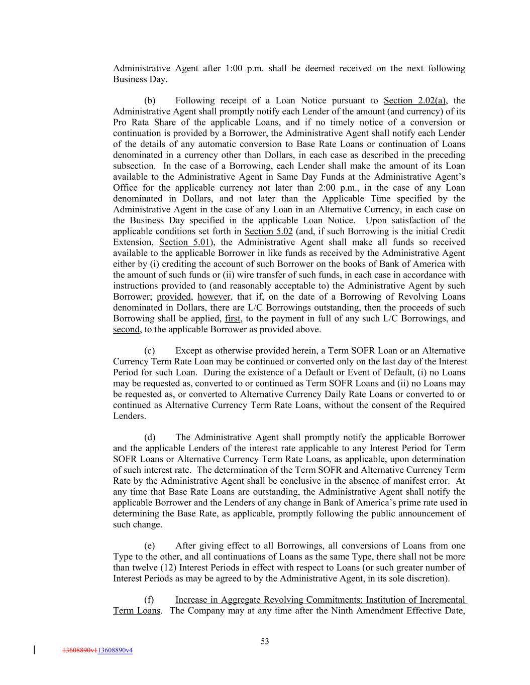 Administrative Agent after 1:00 p.m. shall be deemed received on the next following Business Day. (b) Following receipt of a Loan Notice pursuant to Section 2.02(a), the Administrative Agent shall promptly notify each Lender of the amount (and currency) of its Pro Rata Share of the applicable Loans, and if no timely notice of a conversion or continuation is provided by a Borrower, the Administrative Agent shall notify each Lender of the details of any automatic conversion to Base Rate Loans or continuation of Loans denominated in a currency other than Dollars, in each case as described in the preceding subsection. In the case of a Borrowing, each Lender shall make the amount of its Loan available to the Administrative Agent in Same Day Funds at the Administrative Agent’s Office for the applicable currency not later than 2:00 p.m., in the case of any Loan denominated in Dollars, and not later than the Applicable Time specified by the Administrative Agent in the case of any Loan in an Alternative Currency, in each case on the Business Day specified in the applicable Loan Notice. Upon satisfaction of the applicable conditions set forth in Section 5.02 (and, if such Borrowing is the initial Credit Extension, Section 5.01), the Administrative Agent shall make all funds so received available to the applicable Borrower in like funds as received by the Administrative Agent either by (i) crediting the account of such Borrower on the books of Bank of America with the amount of such funds or (ii) wire transfer of such funds, in each case in accordance with instructions provided to (and reasonably acceptable to) the Administrative Agent by such Borrower; provided, however, that if, on the date of a Borrowing of Revolving Loans denominated in Dollars, there are L/C Borrowings outstanding, then the proceeds of such Borrowing shall be applied, first, to the payment in full of any such L/C Borrowings, and second, to the applicable Borrower as provided above. (c) Except as otherwise provided herein, a Term SOFR Loan or an Alternative Currency Term Rate Loan may be continued or converted only on the last day of the Interest Period for such Loan. During the existence of a Default or Event of Default, (i) no Loans may be requested as, converted to or continued as Term SOFR Loans and (ii) no Loans may be requested as, or converted to Alternative Currency Daily Rate Loans or converted to or continued as Alternative Currency Term Rate Loans, without the consent of the Required Lenders. (d) The Administrative Agent shall promptly notify the applicable Borrower and the applicable Lenders of the interest rate applicable to any Interest Period for Term SOFR Loans or Alternative Currency Term Rate Loans, as applicable, upon determination of such interest rate. The determination of the Term SOFR and Alternative Currency Term Rate by the Administrative Agent shall be conclusive in the absence of manifest error. At any time that Base Rate Loans are outstanding, the Administrative Agent shall notify the applicable Borrower and the Lenders of any change in Bank of America’s prime rate used in determining the Base Rate, as applicable, promptly following the public announcement of such change. (e) After giving effect to all Borrowings, all conversions of Loans from one Type to the other, and all continuations of Loans as the same Type, there shall not be more than twelve (12) Interest Periods in effect with respect to Loans (or such greater number of Interest Periods as may be agreed to by the Administrative Agent, in its sole discretion). (f) Increase in Aggregate Revolving Commitments; Institution of Incremental Term Loans. The Company may at any time after the Ninth Amendment Effective Date, 53 13608890v113608890v4