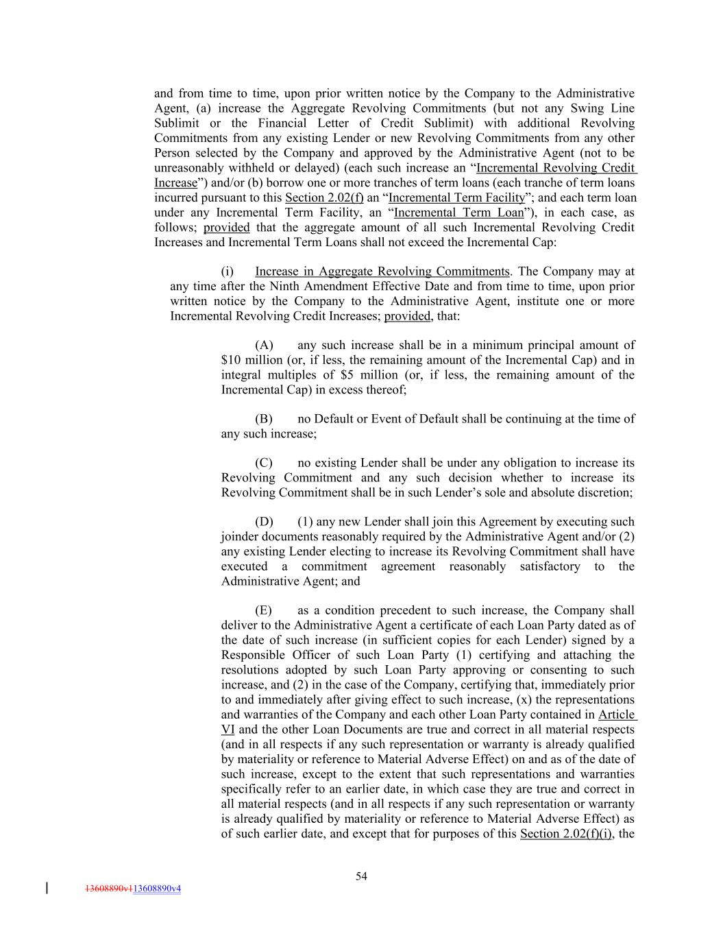 and from time to time, upon prior written notice by the Company to the Administrative Agent, (a) increase the Aggregate Revolving Commitments (but not any Swing Line Sublimit or the Financial Letter of Credit Sublimit) with additional Revolving Commitments from any existing Lender or new Revolving Commitments from any other Person selected by the Company and approved by the Administrative Agent (not to be unreasonably withheld or delayed) (each such increase an “Incremental Revolving Credit Increase”) and/or (b) borrow one or more tranches of term loans (each tranche of term loans incurred pursuant to this Section 2.02(f) an “Incremental Term Facility”; and each term loan under any Incremental Term Facility, an “Incremental Term Loan”), in each case, as follows; provided that the aggregate amount of all such Incremental Revolving Credit Increases and Incremental Term Loans shall not exceed the Incremental Cap: (i) Increase in Aggregate Revolving Commitments. The Company may at any time after the Ninth Amendment Effective Date and from time to time, upon prior written notice by the Company to the Administrative Agent, institute one or more Incremental Revolving Credit Increases; provided, that: (A) any such increase shall be in a minimum principal amount of $10 million (or, if less, the remaining amount of the Incremental Cap) and in integral multiples of $5 million (or, if less, the remaining amount of the Incremental Cap) in excess thereof; (B) no Default or Event of Default shall be continuing at the time of any such increase; (C) no existing Lender shall be under any obligation to increase its Revolving Commitment and any such decision whether to increase its Revolving Commitment shall be in such Lender’s sole and absolute discretion; (D) (1) any new Lender shall join this Agreement by executing such joinder documents reasonably required by the Administrative Agent and/or (2) any existing Lender electing to increase its Revolving Commitment shall have executed a commitment agreement reasonably satisfactory to the Administrative Agent; and (E) as a condition precedent to such increase, the Company shall deliver to the Administrative Agent a certificate of each Loan Party dated as of the date of such increase (in sufficient copies for each Lender) signed by a Responsible Officer of such Loan Party (1) certifying and attaching the resolutions adopted by such Loan Party approving or consenting to such increase, and (2) in the case of the Company, certifying that, immediately prior to and immediately after giving effect to such increase, (x) the representations and warranties of the Company and each other Loan Party contained in Article VI and the other Loan Documents are true and correct in all material respects (and in all respects if any such representation or warranty is already qualified by materiality or reference to Material Adverse Effect) on and as of the date of such increase, except to the extent that such representations and warranties specifically refer to an earlier date, in which case they are true and correct in all material respects (and in all respects if any such representation or warranty is already qualified by materiality or reference to Material Adverse Effect) as of such earlier date, and except that for purposes of this Section 2.02(f)(i), the 54 13608890v113608890v4