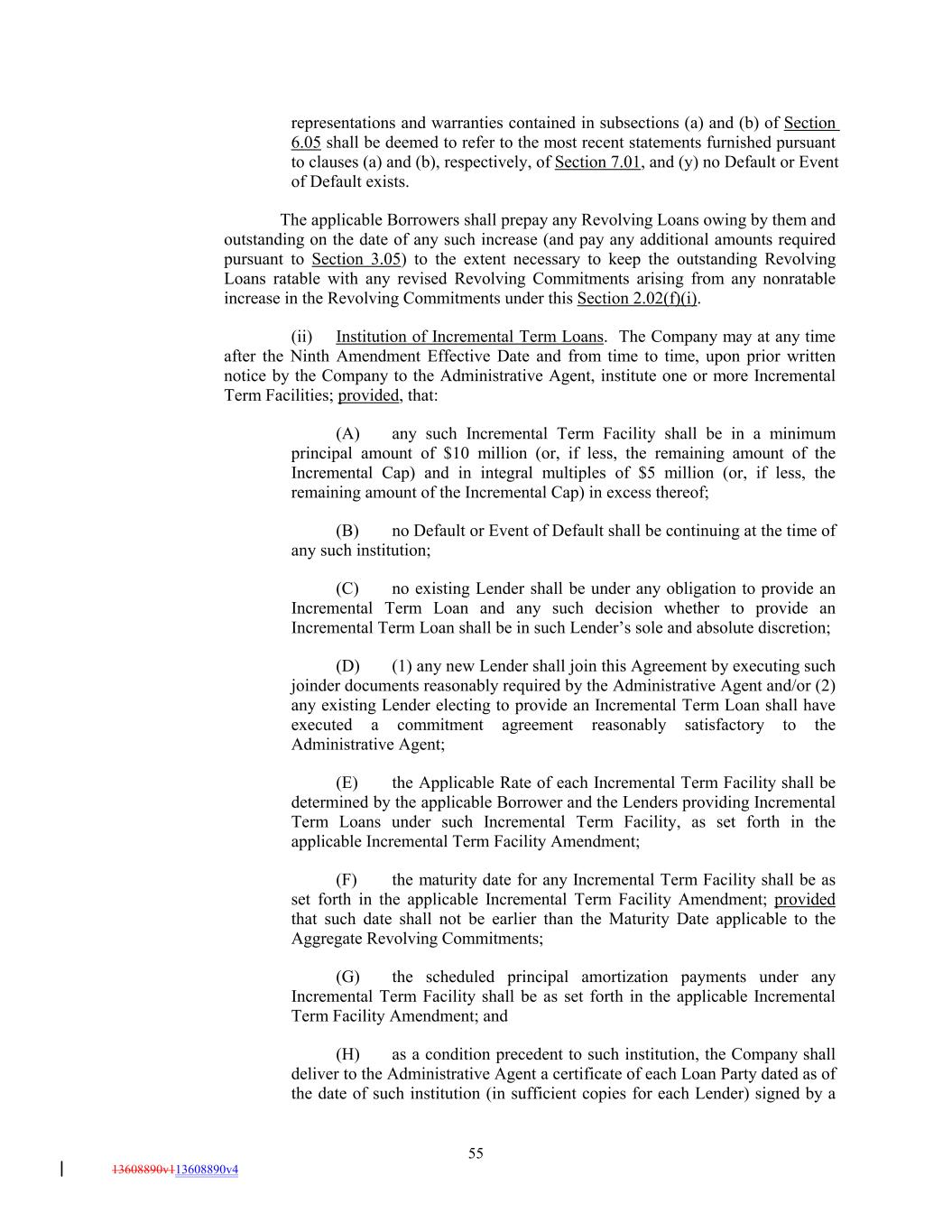 representations and warranties contained in subsections (a) and (b) of Section 6.05 shall be deemed to refer to the most recent statements furnished pursuant to clauses (a) and (b), respectively, of Section 7.01, and (y) no Default or Event of Default exists. The applicable Borrowers shall prepay any Revolving Loans owing by them and outstanding on the date of any such increase (and pay any additional amounts required pursuant to Section 3.05) to the extent necessary to keep the outstanding Revolving Loans ratable with any revised Revolving Commitments arising from any nonratable increase in the Revolving Commitments under this Section 2.02(f)(i). (ii) Institution of Incremental Term Loans. The Company may at any time after the Ninth Amendment Effective Date and from time to time, upon prior written notice by the Company to the Administrative Agent, institute one or more Incremental Term Facilities; provided, that: (A) any such Incremental Term Facility shall be in a minimum principal amount of $10 million (or, if less, the remaining amount of the Incremental Cap) and in integral multiples of $5 million (or, if less, the remaining amount of the Incremental Cap) in excess thereof; (B) no Default or Event of Default shall be continuing at the time of any such institution; (C) no existing Lender shall be under any obligation to provide an Incremental Term Loan and any such decision whether to provide an Incremental Term Loan shall be in such Lender’s sole and absolute discretion; (D) (1) any new Lender shall join this Agreement by executing such joinder documents reasonably required by the Administrative Agent and/or (2) any existing Lender electing to provide an Incremental Term Loan shall have executed a commitment agreement reasonably satisfactory to the Administrative Agent; (E) the Applicable Rate of each Incremental Term Facility shall be determined by the applicable Borrower and the Lenders providing Incremental Term Loans under such Incremental Term Facility, as set forth in the applicable Incremental Term Facility Amendment; (F) the maturity date for any Incremental Term Facility shall be as set forth in the applicable Incremental Term Facility Amendment; provided that such date shall not be earlier than the Maturity Date applicable to the Aggregate Revolving Commitments; (G) the scheduled principal amortization payments under any Incremental Term Facility shall be as set forth in the applicable Incremental Term Facility Amendment; and (H) as a condition precedent to such institution, the Company shall deliver to the Administrative Agent a certificate of each Loan Party dated as of the date of such institution (in sufficient copies for each Lender) signed by a 55 13608890v113608890v4