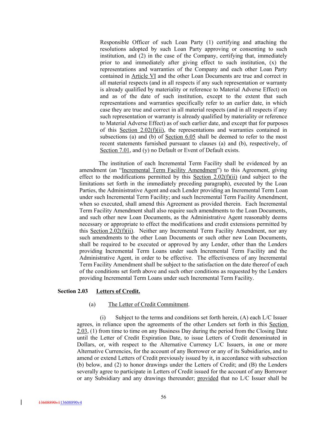 Responsible Officer of such Loan Party (1) certifying and attaching the resolutions adopted by such Loan Party approving or consenting to such institution, and (2) in the case of the Company, certifying that, immediately prior to and immediately after giving effect to such institution, (x) the representations and warranties of the Company and each other Loan Party contained in Article VI and the other Loan Documents are true and correct in all material respects (and in all respects if any such representation or warranty is already qualified by materiality or reference to Material Adverse Effect) on and as of the date of such institution, except to the extent that such representations and warranties specifically refer to an earlier date, in which case they are true and correct in all material respects (and in all respects if any such representation or warranty is already qualified by materiality or reference to Material Adverse Effect) as of such earlier date, and except that for purposes of this Section 2.02(f)(ii), the representations and warranties contained in subsections (a) and (b) of Section 6.05 shall be deemed to refer to the most recent statements furnished pursuant to clauses (a) and (b), respectively, of Section 7.01, and (y) no Default or Event of Default exists. The institution of each Incremental Term Facility shall be evidenced by an amendment (an “Incremental Term Facility Amendment”) to this Agreement, giving effect to the modifications permitted by this Section 2.02(f)(ii) (and subject to the limitations set forth in the immediately preceding paragraph), executed by the Loan Parties, the Administrative Agent and each Lender providing an Incremental Term Loan under such Incremental Term Facility; and such Incremental Term Facility Amendment, when so executed, shall amend this Agreement as provided therein. Each Incremental Term Facility Amendment shall also require such amendments to the Loan Documents, and such other new Loan Documents, as the Administrative Agent reasonably deems necessary or appropriate to effect the modifications and credit extensions permitted by this Section 2.02(f)(ii). Neither any Incremental Term Facility Amendment, nor any such amendments to the other Loan Documents or such other new Loan Documents, shall be required to be executed or approved by any Lender, other than the Lenders providing Incremental Term Loans under such Incremental Term Facility and the Administrative Agent, in order to be effective. The effectiveness of any Incremental Term Facility Amendment shall be subject to the satisfaction on the date thereof of each of the conditions set forth above and such other conditions as requested by the Lenders providing Incremental Term Loans under such Incremental Term Facility. Section 2.03 Letters of Credit. (a) The Letter of Credit Commitment. (i) Subject to the terms and conditions set forth herein, (A) each L/C Issuer agrees, in reliance upon the agreements of the other Lenders set forth in this Section 2.03, (1) from time to time on any Business Day during the period from the Closing Date until the Letter of Credit Expiration Date, to issue Letters of Credit denominated in Dollars, or, with respect to the Alternative Currency L/C Issuers, in one or more Alternative Currencies, for the account of any Borrower or any of its Subsidiaries, and to amend or extend Letters of Credit previously issued by it, in accordance with subsection (b) below, and (2) to honor drawings under the Letters of Credit; and (B) the Lenders severally agree to participate in Letters of Credit issued for the account of any Borrower or any Subsidiary and any drawings thereunder; provided that no L/C Issuer shall be 56 13608890v113608890v4