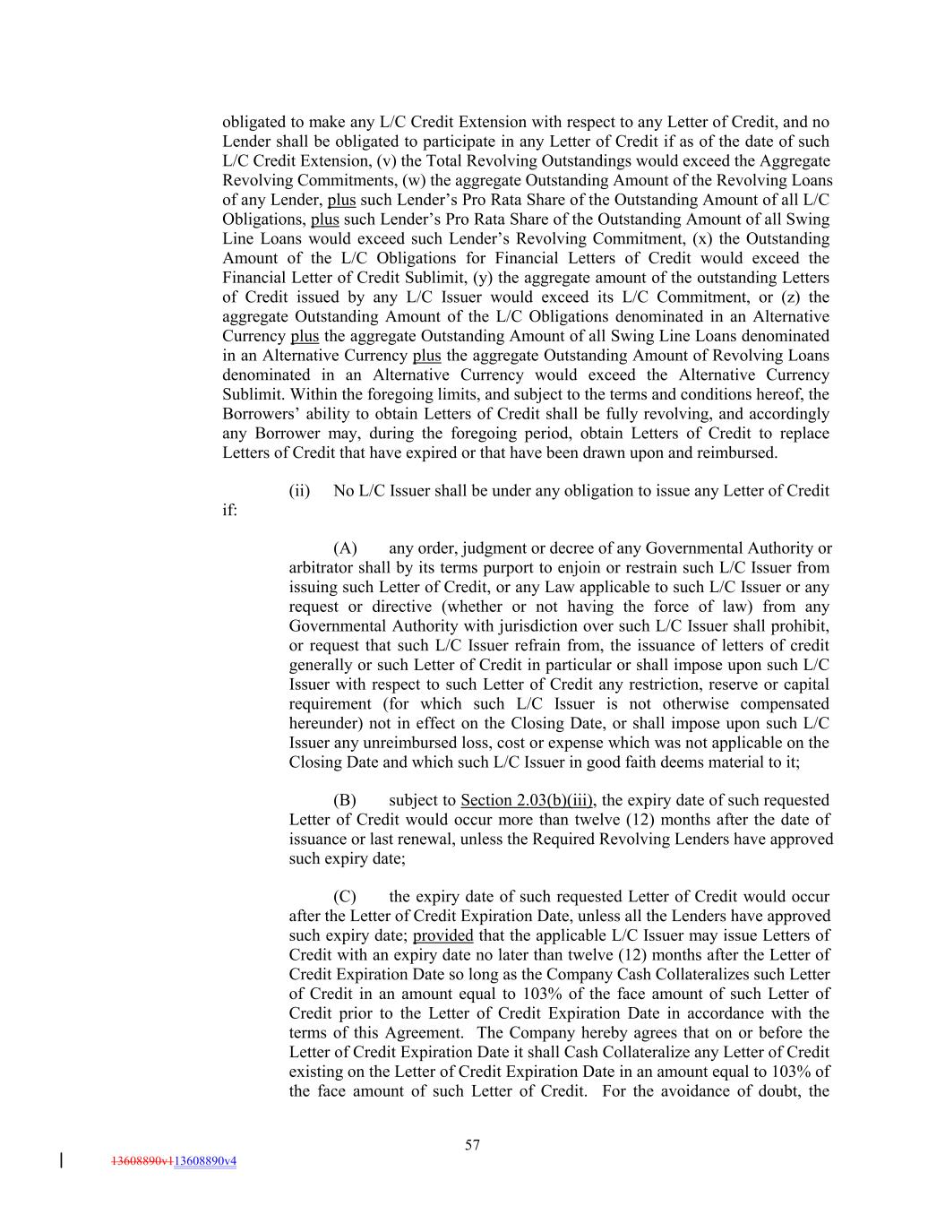 obligated to make any L/C Credit Extension with respect to any Letter of Credit, and no Lender shall be obligated to participate in any Letter of Credit if as of the date of such L/C Credit Extension, (v) the Total Revolving Outstandings would exceed the Aggregate Revolving Commitments, (w) the aggregate Outstanding Amount of the Revolving Loans of any Lender, plus such Lender’s Pro Rata Share of the Outstanding Amount of all L/C Obligations, plus such Lender’s Pro Rata Share of the Outstanding Amount of all Swing Line Loans would exceed such Lender’s Revolving Commitment, (x) the Outstanding Amount of the L/C Obligations for Financial Letters of Credit would exceed the Financial Letter of Credit Sublimit, (y) the aggregate amount of the outstanding Letters of Credit issued by any L/C Issuer would exceed its L/C Commitment, or (z) the aggregate Outstanding Amount of the L/C Obligations denominated in an Alternative Currency plus the aggregate Outstanding Amount of all Swing Line Loans denominated in an Alternative Currency plus the aggregate Outstanding Amount of Revolving Loans denominated in an Alternative Currency would exceed the Alternative Currency Sublimit. Within the foregoing limits, and subject to the terms and conditions hereof, the Borrowers’ ability to obtain Letters of Credit shall be fully revolving, and accordingly any Borrower may, during the foregoing period, obtain Letters of Credit to replace Letters of Credit that have expired or that have been drawn upon and reimbursed. (ii) No L/C Issuer shall be under any obligation to issue any Letter of Credit if: (A) any order, judgment or decree of any Governmental Authority or arbitrator shall by its terms purport to enjoin or restrain such L/C Issuer from issuing such Letter of Credit, or any Law applicable to such L/C Issuer or any request or directive (whether or not having the force of law) from any Governmental Authority with jurisdiction over such L/C Issuer shall prohibit, or request that such L/C Issuer refrain from, the issuance of letters of credit generally or such Letter of Credit in particular or shall impose upon such L/C Issuer with respect to such Letter of Credit any restriction, reserve or capital requirement (for which such L/C Issuer is not otherwise compensated hereunder) not in effect on the Closing Date, or shall impose upon such L/C Issuer any unreimbursed loss, cost or expense which was not applicable on the Closing Date and which such L/C Issuer in good faith deems material to it; (B) subject to Section 2.03(b)(iii), the expiry date of such requested Letter of Credit would occur more than twelve (12) months after the date of issuance or last renewal, unless the Required Revolving Lenders have approved such expiry date; (C) the expiry date of such requested Letter of Credit would occur after the Letter of Credit Expiration Date, unless all the Lenders have approved such expiry date; provided that the applicable L/C Issuer may issue Letters of Credit with an expiry date no later than twelve (12) months after the Letter of Credit Expiration Date so long as the Company Cash Collateralizes such Letter of Credit in an amount equal to 103% of the face amount of such Letter of Credit prior to the Letter of Credit Expiration Date in accordance with the terms of this Agreement. The Company hereby agrees that on or before the Letter of Credit Expiration Date it shall Cash Collateralize any Letter of Credit existing on the Letter of Credit Expiration Date in an amount equal to 103% of the face amount of such Letter of Credit. For the avoidance of doubt, the 57 13608890v113608890v4