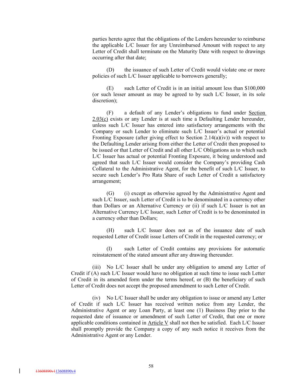 parties hereto agree that the obligations of the Lenders hereunder to reimburse the applicable L/C Issuer for any Unreimbursed Amount with respect to any Letter of Credit shall terminate on the Maturity Date with respect to drawings occurring after that date; (D) the issuance of such Letter of Credit would violate one or more policies of such L/C Issuer applicable to borrowers generally; (E) such Letter of Credit is in an initial amount less than $100,000 (or such lesser amount as may be agreed to by such L/C Issuer, in its sole discretion); (F) a default of any Lender’s obligations to fund under Section 2.03(c) exists or any Lender is at such time a Defaulting Lender hereunder, unless such L/C Issuer has entered into satisfactory arrangements with the Company or such Lender to eliminate such L/C Issuer’s actual or potential Fronting Exposure (after giving effect to Section 2.14(a)(iv)) with respect to the Defaulting Lender arising from either the Letter of Credit then proposed to be issued or that Letter of Credit and all other L/C Obligations as to which such L/C Issuer has actual or potential Fronting Exposure, it being understood and agreed that such L/C Issuer would consider the Company’s providing Cash Collateral to the Administrative Agent, for the benefit of such L/C Issuer, to secure such Lender’s Pro Rata Share of such Letter of Credit a satisfactory arrangement; (G) (i) except as otherwise agreed by the Administrative Agent and such L/C Issuer, such Letter of Credit is to be denominated in a currency other than Dollars or an Alternative Currency or (ii) if such L/C Issuer is not an Alternative Currency L/C Issuer, such Letter of Credit is to be denominated in a currency other than Dollars; (H) such L/C Issuer does not as of the issuance date of such requested Letter of Credit issue Letters of Credit in the requested currency; or (I) such Letter of Credit contains any provisions for automatic reinstatement of the stated amount after any drawing thereunder. (iii) No L/C Issuer shall be under any obligation to amend any Letter of Credit if (A) such L/C Issuer would have no obligation at such time to issue such Letter of Credit in its amended form under the terms hereof, or (B) the beneficiary of such Letter of Credit does not accept the proposed amendment to such Letter of Credit. (iv) No L/C Issuer shall be under any obligation to issue or amend any Letter of Credit if such L/C Issuer has received written notice from any Lender, the Administrative Agent or any Loan Party, at least one (1) Business Day prior to the requested date of issuance or amendment of such Letter of Credit, that one or more applicable conditions contained in Article V shall not then be satisfied. Each L/C Issuer shall promptly provide the Company a copy of any such notice it receives from the Administrative Agent or any Lender. 58 13608890v113608890v4
