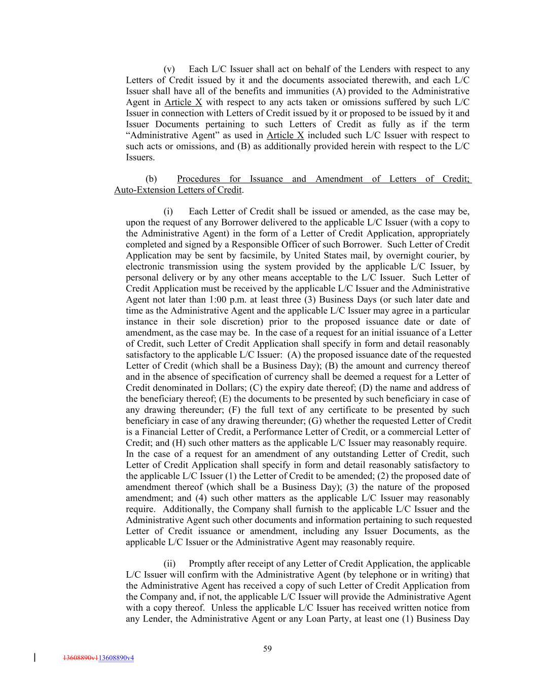 (v) Each L/C Issuer shall act on behalf of the Lenders with respect to any Letters of Credit issued by it and the documents associated therewith, and each L/C Issuer shall have all of the benefits and immunities (A) provided to the Administrative Agent in Article X with respect to any acts taken or omissions suffered by such L/C Issuer in connection with Letters of Credit issued by it or proposed to be issued by it and Issuer Documents pertaining to such Letters of Credit as fully as if the term “Administrative Agent” as used in Article X included such L/C Issuer with respect to such acts or omissions, and (B) as additionally provided herein with respect to the L/C Issuers. (b) Procedures for Issuance and Amendment of Letters of Credit; Auto-Extension Letters of Credit. (i) Each Letter of Credit shall be issued or amended, as the case may be, upon the request of any Borrower delivered to the applicable L/C Issuer (with a copy to the Administrative Agent) in the form of a Letter of Credit Application, appropriately completed and signed by a Responsible Officer of such Borrower. Such Letter of Credit Application may be sent by facsimile, by United States mail, by overnight courier, by electronic transmission using the system provided by the applicable L/C Issuer, by personal delivery or by any other means acceptable to the L/C Issuer. Such Letter of Credit Application must be received by the applicable L/C Issuer and the Administrative Agent not later than 1:00 p.m. at least three (3) Business Days (or such later date and time as the Administrative Agent and the applicable L/C Issuer may agree in a particular instance in their sole discretion) prior to the proposed issuance date or date of amendment, as the case may be. In the case of a request for an initial issuance of a Letter of Credit, such Letter of Credit Application shall specify in form and detail reasonably satisfactory to the applicable L/C Issuer: (A) the proposed issuance date of the requested Letter of Credit (which shall be a Business Day); (B) the amount and currency thereof and in the absence of specification of currency shall be deemed a request for a Letter of Credit denominated in Dollars; (C) the expiry date thereof; (D) the name and address of the beneficiary thereof; (E) the documents to be presented by such beneficiary in case of any drawing thereunder; (F) the full text of any certificate to be presented by such beneficiary in case of any drawing thereunder; (G) whether the requested Letter of Credit is a Financial Letter of Credit, a Performance Letter of Credit, or a commercial Letter of Credit; and (H) such other matters as the applicable L/C Issuer may reasonably require. In the case of a request for an amendment of any outstanding Letter of Credit, such Letter of Credit Application shall specify in form and detail reasonably satisfactory to the applicable L/C Issuer (1) the Letter of Credit to be amended; (2) the proposed date of amendment thereof (which shall be a Business Day); (3) the nature of the proposed amendment; and (4) such other matters as the applicable L/C Issuer may reasonably require. Additionally, the Company shall furnish to the applicable L/C Issuer and the Administrative Agent such other documents and information pertaining to such requested Letter of Credit issuance or amendment, including any Issuer Documents, as the applicable L/C Issuer or the Administrative Agent may reasonably require. (ii) Promptly after receipt of any Letter of Credit Application, the applicable L/C Issuer will confirm with the Administrative Agent (by telephone or in writing) that the Administrative Agent has received a copy of such Letter of Credit Application from the Company and, if not, the applicable L/C Issuer will provide the Administrative Agent with a copy thereof. Unless the applicable L/C Issuer has received written notice from any Lender, the Administrative Agent or any Loan Party, at least one (1) Business Day 59 13608890v113608890v4