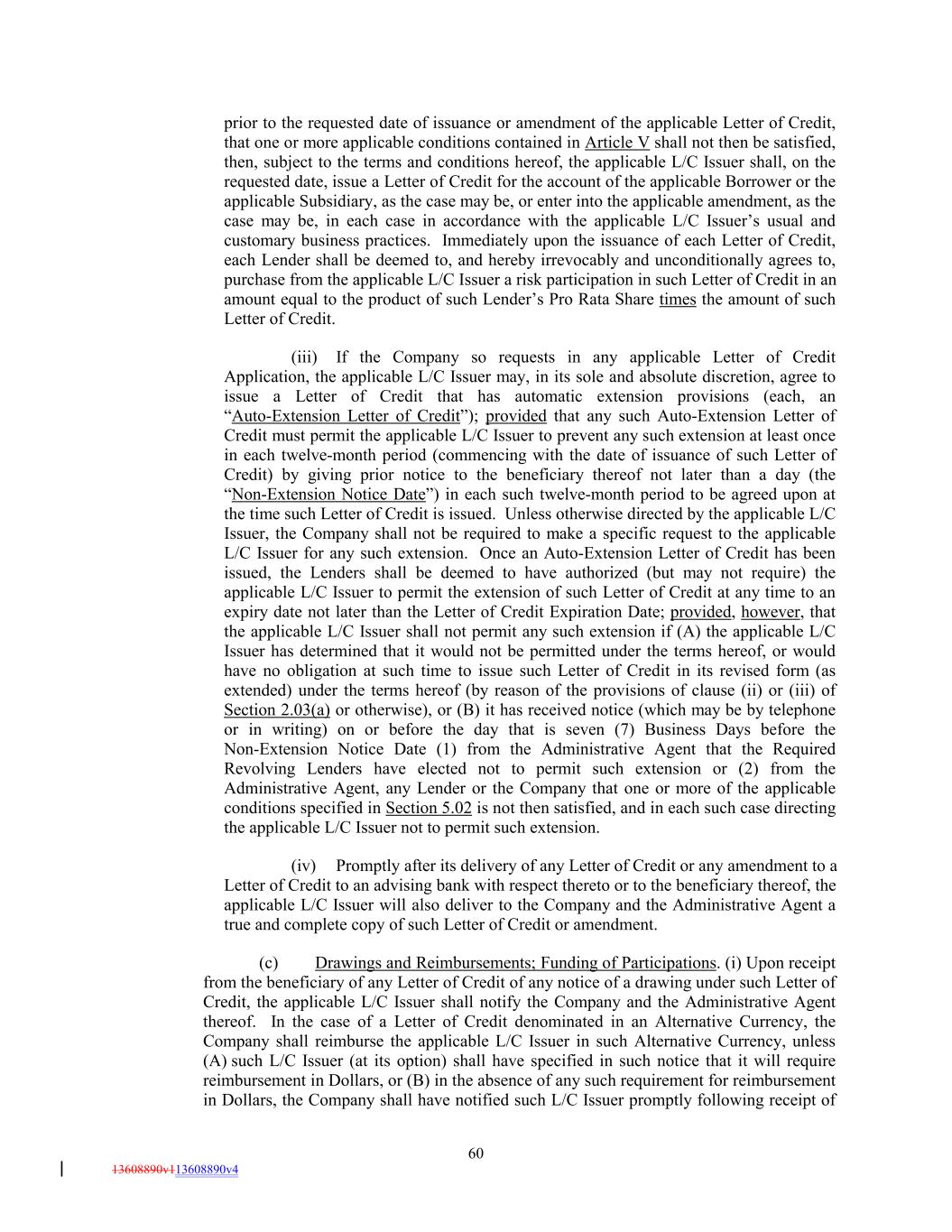 prior to the requested date of issuance or amendment of the applicable Letter of Credit, that one or more applicable conditions contained in Article V shall not then be satisfied, then, subject to the terms and conditions hereof, the applicable L/C Issuer shall, on the requested date, issue a Letter of Credit for the account of the applicable Borrower or the applicable Subsidiary, as the case may be, or enter into the applicable amendment, as the case may be, in each case in accordance with the applicable L/C Issuer’s usual and customary business practices. Immediately upon the issuance of each Letter of Credit, each Lender shall be deemed to, and hereby irrevocably and unconditionally agrees to, purchase from the applicable L/C Issuer a risk participation in such Letter of Credit in an amount equal to the product of such Lender’s Pro Rata Share times the amount of such Letter of Credit. (iii) If the Company so requests in any applicable Letter of Credit Application, the applicable L/C Issuer may, in its sole and absolute discretion, agree to issue a Letter of Credit that has automatic extension provisions (each, an “Auto-Extension Letter of Credit”); provided that any such Auto-Extension Letter of Credit must permit the applicable L/C Issuer to prevent any such extension at least once in each twelve-month period (commencing with the date of issuance of such Letter of Credit) by giving prior notice to the beneficiary thereof not later than a day (the “Non-Extension Notice Date”) in each such twelve-month period to be agreed upon at the time such Letter of Credit is issued. Unless otherwise directed by the applicable L/C Issuer, the Company shall not be required to make a specific request to the applicable L/C Issuer for any such extension. Once an Auto-Extension Letter of Credit has been issued, the Lenders shall be deemed to have authorized (but may not require) the applicable L/C Issuer to permit the extension of such Letter of Credit at any time to an expiry date not later than the Letter of Credit Expiration Date; provided, however, that the applicable L/C Issuer shall not permit any such extension if (A) the applicable L/C Issuer has determined that it would not be permitted under the terms hereof, or would have no obligation at such time to issue such Letter of Credit in its revised form (as extended) under the terms hereof (by reason of the provisions of clause (ii) or (iii) of Section 2.03(a) or otherwise), or (B) it has received notice (which may be by telephone or in writing) on or before the day that is seven (7) Business Days before the Non-Extension Notice Date (1) from the Administrative Agent that the Required Revolving Lenders have elected not to permit such extension or (2) from the Administrative Agent, any Lender or the Company that one or more of the applicable conditions specified in Section 5.02 is not then satisfied, and in each such case directing the applicable L/C Issuer not to permit such extension. (iv) Promptly after its delivery of any Letter of Credit or any amendment to a Letter of Credit to an advising bank with respect thereto or to the beneficiary thereof, the applicable L/C Issuer will also deliver to the Company and the Administrative Agent a true and complete copy of such Letter of Credit or amendment. (c) Drawings and Reimbursements; Funding of Participations. (i) Upon receipt from the beneficiary of any Letter of Credit of any notice of a drawing under such Letter of Credit, the applicable L/C Issuer shall notify the Company and the Administrative Agent thereof. In the case of a Letter of Credit denominated in an Alternative Currency, the Company shall reimburse the applicable L/C Issuer in such Alternative Currency, unless (A) such L/C Issuer (at its option) shall have specified in such notice that it will require reimbursement in Dollars, or (B) in the absence of any such requirement for reimbursement in Dollars, the Company shall have notified such L/C Issuer promptly following receipt of 60 13608890v113608890v4