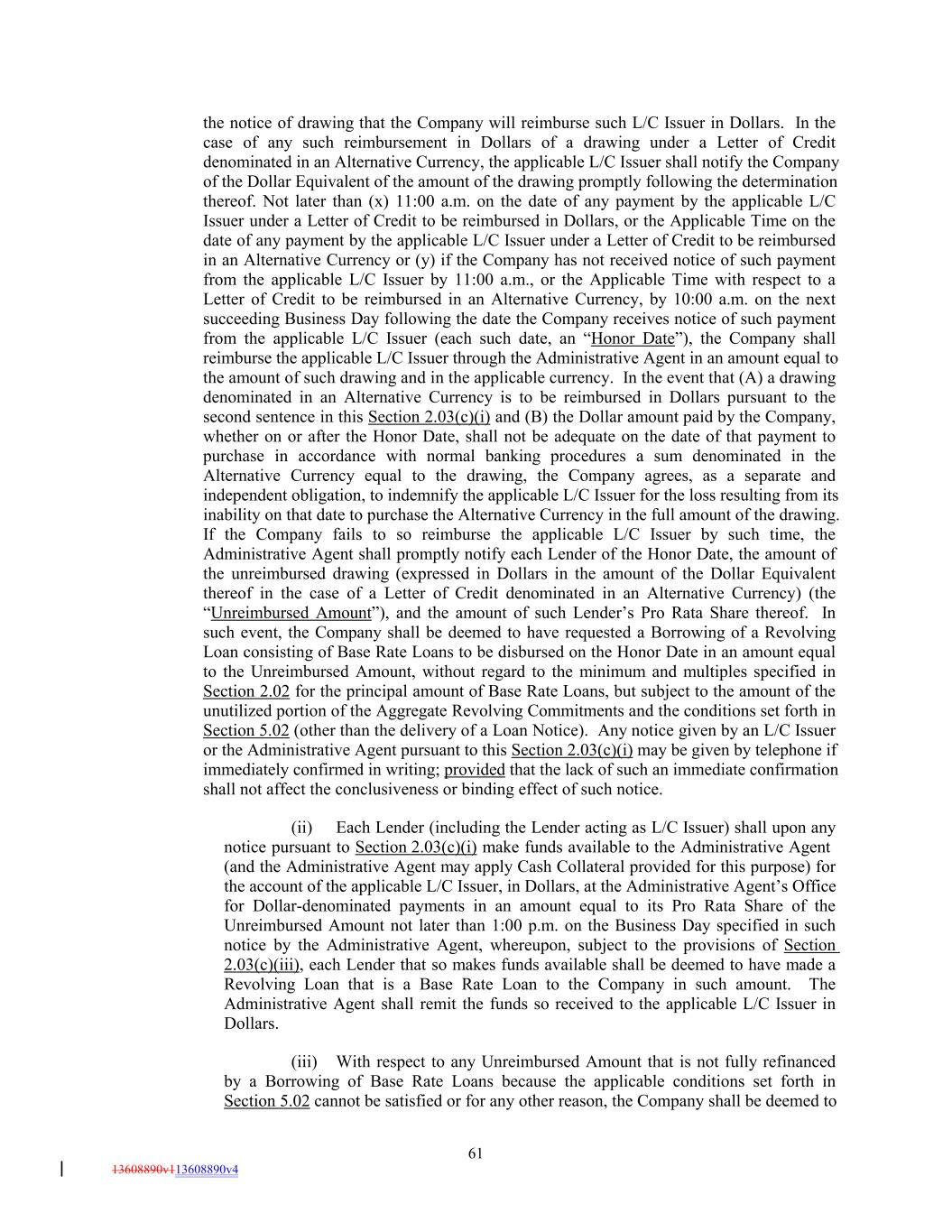 the notice of drawing that the Company will reimburse such L/C Issuer in Dollars. In the case of any such reimbursement in Dollars of a drawing under a Letter of Credit denominated in an Alternative Currency, the applicable L/C Issuer shall notify the Company of the Dollar Equivalent of the amount of the drawing promptly following the determination thereof. Not later than (x) 11:00 a.m. on the date of any payment by the applicable L/C Issuer under a Letter of Credit to be reimbursed in Dollars, or the Applicable Time on the date of any payment by the applicable L/C Issuer under a Letter of Credit to be reimbursed in an Alternative Currency or (y) if the Company has not received notice of such payment from the applicable L/C Issuer by 11:00 a.m., or the Applicable Time with respect to a Letter of Credit to be reimbursed in an Alternative Currency, by 10:00 a.m. on the next succeeding Business Day following the date the Company receives notice of such payment from the applicable L/C Issuer (each such date, an “Honor Date”), the Company shall reimburse the applicable L/C Issuer through the Administrative Agent in an amount equal to the amount of such drawing and in the applicable currency. In the event that (A) a drawing denominated in an Alternative Currency is to be reimbursed in Dollars pursuant to the second sentence in this Section 2.03(c)(i) and (B) the Dollar amount paid by the Company, whether on or after the Honor Date, shall not be adequate on the date of that payment to purchase in accordance with normal banking procedures a sum denominated in the Alternative Currency equal to the drawing, the Company agrees, as a separate and independent obligation, to indemnify the applicable L/C Issuer for the loss resulting from its inability on that date to purchase the Alternative Currency in the full amount of the drawing. If the Company fails to so reimburse the applicable L/C Issuer by such time, the Administrative Agent shall promptly notify each Lender of the Honor Date, the amount of the unreimbursed drawing (expressed in Dollars in the amount of the Dollar Equivalent thereof in the case of a Letter of Credit denominated in an Alternative Currency) (the “Unreimbursed Amount”), and the amount of such Lender’s Pro Rata Share thereof. In such event, the Company shall be deemed to have requested a Borrowing of a Revolving Loan consisting of Base Rate Loans to be disbursed on the Honor Date in an amount equal to the Unreimbursed Amount, without regard to the minimum and multiples specified in Section 2.02 for the principal amount of Base Rate Loans, but subject to the amount of the unutilized portion of the Aggregate Revolving Commitments and the conditions set forth in Section 5.02 (other than the delivery of a Loan Notice). Any notice given by an L/C Issuer or the Administrative Agent pursuant to this Section 2.03(c)(i) may be given by telephone if immediately confirmed in writing; provided that the lack of such an immediate confirmation shall not affect the conclusiveness or binding effect of such notice. (ii) Each Lender (including the Lender acting as L/C Issuer) shall upon any notice pursuant to Section 2.03(c)(i) make funds available to the Administrative Agent (and the Administrative Agent may apply Cash Collateral provided for this purpose) for the account of the applicable L/C Issuer, in Dollars, at the Administrative Agent’s Office for Dollar-denominated payments in an amount equal to its Pro Rata Share of the Unreimbursed Amount not later than 1:00 p.m. on the Business Day specified in such notice by the Administrative Agent, whereupon, subject to the provisions of Section 2.03(c)(iii), each Lender that so makes funds available shall be deemed to have made a Revolving Loan that is a Base Rate Loan to the Company in such amount. The Administrative Agent shall remit the funds so received to the applicable L/C Issuer in Dollars. (iii) With respect to any Unreimbursed Amount that is not fully refinanced by a Borrowing of Base Rate Loans because the applicable conditions set forth in Section 5.02 cannot be satisfied or for any other reason, the Company shall be deemed to 61 13608890v113608890v4