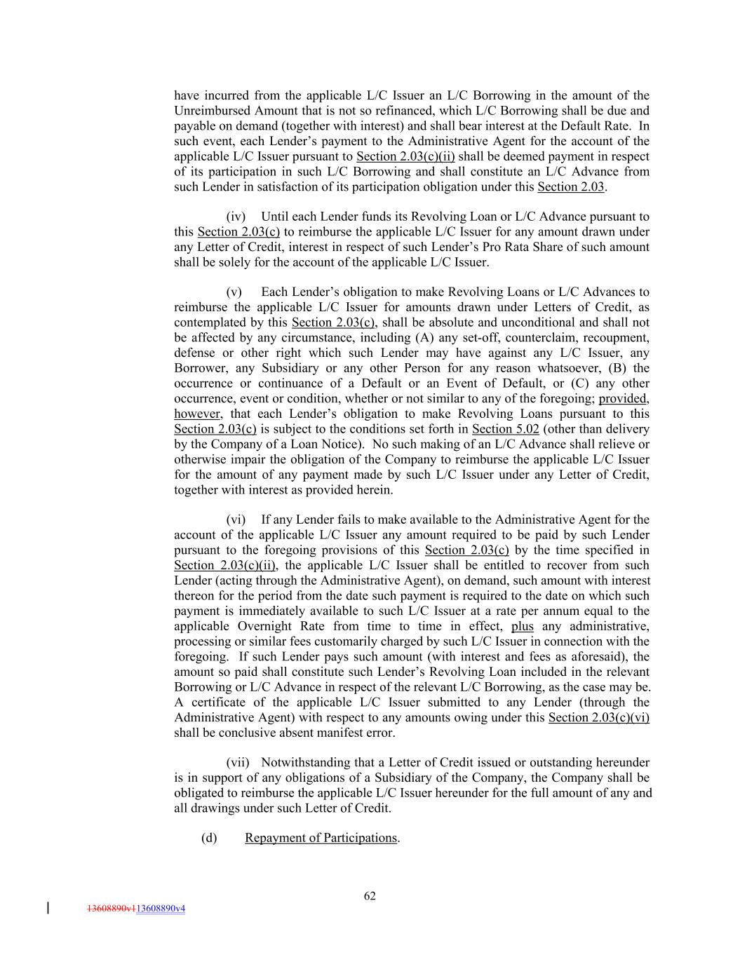 have incurred from the applicable L/C Issuer an L/C Borrowing in the amount of the Unreimbursed Amount that is not so refinanced, which L/C Borrowing shall be due and payable on demand (together with interest) and shall bear interest at the Default Rate. In such event, each Lender’s payment to the Administrative Agent for the account of the applicable L/C Issuer pursuant to Section 2.03(c)(ii) shall be deemed payment in respect of its participation in such L/C Borrowing and shall constitute an L/C Advance from such Lender in satisfaction of its participation obligation under this Section 2.03. (iv) Until each Lender funds its Revolving Loan or L/C Advance pursuant to this Section 2.03(c) to reimburse the applicable L/C Issuer for any amount drawn under any Letter of Credit, interest in respect of such Lender’s Pro Rata Share of such amount shall be solely for the account of the applicable L/C Issuer. (v) Each Lender’s obligation to make Revolving Loans or L/C Advances to reimburse the applicable L/C Issuer for amounts drawn under Letters of Credit, as contemplated by this Section 2.03(c), shall be absolute and unconditional and shall not be affected by any circumstance, including (A) any set-off, counterclaim, recoupment, defense or other right which such Lender may have against any L/C Issuer, any Borrower, any Subsidiary or any other Person for any reason whatsoever, (B) the occurrence or continuance of a Default or an Event of Default, or (C) any other occurrence, event or condition, whether or not similar to any of the foregoing; provided, however, that each Lender’s obligation to make Revolving Loans pursuant to this Section 2.03(c) is subject to the conditions set forth in Section 5.02 (other than delivery by the Company of a Loan Notice). No such making of an L/C Advance shall relieve or otherwise impair the obligation of the Company to reimburse the applicable L/C Issuer for the amount of any payment made by such L/C Issuer under any Letter of Credit, together with interest as provided herein. (vi) If any Lender fails to make available to the Administrative Agent for the account of the applicable L/C Issuer any amount required to be paid by such Lender pursuant to the foregoing provisions of this Section 2.03(c) by the time specified in Section 2.03(c)(ii), the applicable L/C Issuer shall be entitled to recover from such Lender (acting through the Administrative Agent), on demand, such amount with interest thereon for the period from the date such payment is required to the date on which such payment is immediately available to such L/C Issuer at a rate per annum equal to the applicable Overnight Rate from time to time in effect, plus any administrative, processing or similar fees customarily charged by such L/C Issuer in connection with the foregoing. If such Lender pays such amount (with interest and fees as aforesaid), the amount so paid shall constitute such Lender’s Revolving Loan included in the relevant Borrowing or L/C Advance in respect of the relevant L/C Borrowing, as the case may be. A certificate of the applicable L/C Issuer submitted to any Lender (through the Administrative Agent) with respect to any amounts owing under this Section 2.03(c)(vi) shall be conclusive absent manifest error. (vii) Notwithstanding that a Letter of Credit issued or outstanding hereunder is in support of any obligations of a Subsidiary of the Company, the Company shall be obligated to reimburse the applicable L/C Issuer hereunder for the full amount of any and all drawings under such Letter of Credit. (d) Repayment of Participations. 62 13608890v113608890v4
