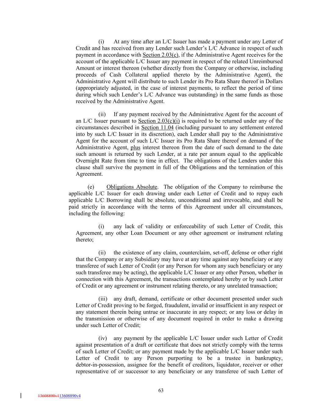 (i) At any time after an L/C Issuer has made a payment under any Letter of Credit and has received from any Lender such Lender’s L/C Advance in respect of such payment in accordance with Section 2.03(c), if the Administrative Agent receives for the account of the applicable L/C Issuer any payment in respect of the related Unreimbursed Amount or interest thereon (whether directly from the Company or otherwise, including proceeds of Cash Collateral applied thereto by the Administrative Agent), the Administrative Agent will distribute to such Lender its Pro Rata Share thereof in Dollars (appropriately adjusted, in the case of interest payments, to reflect the period of time during which such Lender’s L/C Advance was outstanding) in the same funds as those received by the Administrative Agent. (ii) If any payment received by the Administrative Agent for the account of an L/C Issuer pursuant to Section 2.03(c)(i) is required to be returned under any of the circumstances described in Section 11.04 (including pursuant to any settlement entered into by such L/C Issuer in its discretion), each Lender shall pay to the Administrative Agent for the account of such L/C Issuer its Pro Rata Share thereof on demand of the Administrative Agent, plus interest thereon from the date of such demand to the date such amount is returned by such Lender, at a rate per annum equal to the applicable Overnight Rate from time to time in effect. The obligations of the Lenders under this clause shall survive the payment in full of the Obligations and the termination of this Agreement. (e) Obligations Absolute. The obligation of the Company to reimburse the applicable L/C Issuer for each drawing under each Letter of Credit and to repay each applicable L/C Borrowing shall be absolute, unconditional and irrevocable, and shall be paid strictly in accordance with the terms of this Agreement under all circumstances, including the following: (i) any lack of validity or enforceability of such Letter of Credit, this Agreement, any other Loan Document or any other agreement or instrument relating thereto; (ii) the existence of any claim, counterclaim, set-off, defense or other right that the Company or any Subsidiary may have at any time against any beneficiary or any transferee of such Letter of Credit (or any Person for whom any such beneficiary or any such transferee may be acting), the applicable L/C Issuer or any other Person, whether in connection with this Agreement, the transactions contemplated hereby or by such Letter of Credit or any agreement or instrument relating thereto, or any unrelated transaction; (iii) any draft, demand, certificate or other document presented under such Letter of Credit proving to be forged, fraudulent, invalid or insufficient in any respect or any statement therein being untrue or inaccurate in any respect; or any loss or delay in the transmission or otherwise of any document required in order to make a drawing under such Letter of Credit; (iv) any payment by the applicable L/C Issuer under such Letter of Credit against presentation of a draft or certificate that does not strictly comply with the terms of such Letter of Credit; or any payment made by the applicable L/C Issuer under such Letter of Credit to any Person purporting to be a trustee in bankruptcy, debtor-in-possession, assignee for the benefit of creditors, liquidator, receiver or other representative of or successor to any beneficiary or any transferee of such Letter of 63 13608890v113608890v4