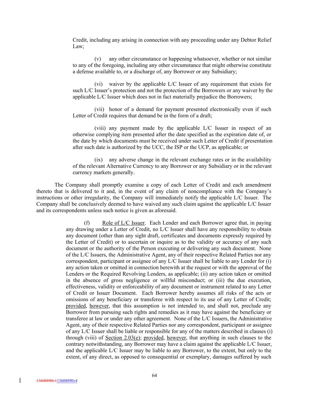 Credit, including any arising in connection with any proceeding under any Debtor Relief Law; (v) any other circumstance or happening whatsoever, whether or not similar to any of the foregoing, including any other circumstance that might otherwise constitute a defense available to, or a discharge of, any Borrower or any Subsidiary; (vi) waiver by the applicable L/C Issuer of any requirement that exists for such L/C Issuer’s protection and not the protection of the Borrowers or any waiver by the applicable L/C Issuer which does not in fact materially prejudice the Borrowers; (vii) honor of a demand for payment presented electronically even if such Letter of Credit requires that demand be in the form of a draft; (viii) any payment made by the applicable L/C Issuer in respect of an otherwise complying item presented after the date specified as the expiration date of, or the date by which documents must be received under such Letter of Credit if presentation after such date is authorized by the UCC, the ISP or the UCP, as applicable; or (ix) any adverse change in the relevant exchange rates or in the availability of the relevant Alternative Currency to any Borrower or any Subsidiary or in the relevant currency markets generally. The Company shall promptly examine a copy of each Letter of Credit and each amendment thereto that is delivered to it and, in the event of any claim of noncompliance with the Company’s instructions or other irregularity, the Company will immediately notify the applicable L/C Issuer. The Company shall be conclusively deemed to have waived any such claim against the applicable L/C Issuer and its correspondents unless such notice is given as aforesaid. (f) Role of L/C Issuer. Each Lender and each Borrower agree that, in paying any drawing under a Letter of Credit, no L/C Issuer shall have any responsibility to obtain any document (other than any sight draft, certificates and documents expressly required by the Letter of Credit) or to ascertain or inquire as to the validity or accuracy of any such document or the authority of the Person executing or delivering any such document. None of the L/C Issuers, the Administrative Agent, any of their respective Related Parties nor any correspondent, participant or assignee of any L/C Issuer shall be liable to any Lender for (i) any action taken or omitted in connection herewith at the request or with the approval of the Lenders or the Required Revolving Lenders, as applicable; (ii) any action taken or omitted in the absence of gross negligence or willful misconduct; or (iii) the due execution, effectiveness, validity or enforceability of any document or instrument related to any Letter of Credit or Issuer Document. Each Borrower hereby assumes all risks of the acts or omissions of any beneficiary or transferee with respect to its use of any Letter of Credit; provided, however, that this assumption is not intended to, and shall not, preclude any Borrower from pursuing such rights and remedies as it may have against the beneficiary or transferee at law or under any other agreement. None of the L/C Issuers, the Administrative Agent, any of their respective Related Parties nor any correspondent, participant or assignee of any L/C Issuer shall be liable or responsible for any of the matters described in clauses (i) through (viii) of Section 2.03(e); provided, however, that anything in such clauses to the contrary notwithstanding, any Borrower may have a claim against the applicable L/C Issuer, and the applicable L/C Issuer may be liable to any Borrower, to the extent, but only to the extent, of any direct, as opposed to consequential or exemplary, damages suffered by such 64 13608890v113608890v4