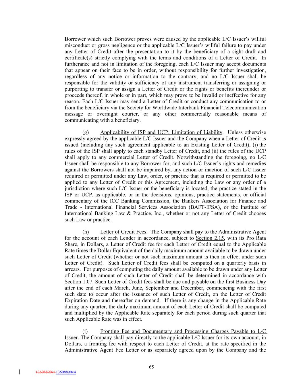 Borrower which such Borrower proves were caused by the applicable L/C Issuer’s willful misconduct or gross negligence or the applicable L/C Issuer’s willful failure to pay under any Letter of Credit after the presentation to it by the beneficiary of a sight draft and certificate(s) strictly complying with the terms and conditions of a Letter of Credit. In furtherance and not in limitation of the foregoing, each L/C Issuer may accept documents that appear on their face to be in order, without responsibility for further investigation, regardless of any notice or information to the contrary, and no L/C Issuer shall be responsible for the validity or sufficiency of any instrument transferring or assigning or purporting to transfer or assign a Letter of Credit or the rights or benefits thereunder or proceeds thereof, in whole or in part, which may prove to be invalid or ineffective for any reason. Each L/C Issuer may send a Letter of Credit or conduct any communication to or from the beneficiary via the Society for Worldwide Interbank Financial Telecommunication message or overnight courier, or any other commercially reasonable means of communicating with a beneficiary. (g) Applicability of ISP and UCP; Limitation of Liability. Unless otherwise expressly agreed by the applicable L/C Issuer and the Company when a Letter of Credit is issued (including any such agreement applicable to an Existing Letter of Credit), (i) the rules of the ISP shall apply to each standby Letter of Credit, and (ii) the rules of the UCP shall apply to any commercial Letter of Credit. Notwithstanding the foregoing, no L/C Issuer shall be responsible to any Borrower for, and such L/C Issuer’s rights and remedies against the Borrowers shall not be impaired by, any action or inaction of such L/C Issuer required or permitted under any Law, order, or practice that is required or permitted to be applied to any Letter of Credit or this Agreement, including the Law or any order of a jurisdiction where such L/C Issuer or the beneficiary is located, the practice stated in the ISP or UCP, as applicable, or in the decisions, opinions, practice statements, or official commentary of the ICC Banking Commission, the Bankers Association for Finance and Trade - International Financial Services Association (BAFT-IFSA), or the Institute of International Banking Law & Practice, Inc., whether or not any Letter of Credit chooses such Law or practice. (h) Letter of Credit Fees. The Company shall pay to the Administrative Agent for the account of each Lender in accordance, subject to Section 2.15, with its Pro Rata Share, in Dollars, a Letter of Credit fee for each Letter of Credit equal to the Applicable Rate times the Dollar Equivalent of the daily maximum amount available to be drawn under such Letter of Credit (whether or not such maximum amount is then in effect under such Letter of Credit). Such Letter of Credit fees shall be computed on a quarterly basis in arrears. For purposes of computing the daily amount available to be drawn under any Letter of Credit, the amount of such Letter of Credit shall be determined in accordance with Section 1.07. Such Letter of Credit fees shall be due and payable on the first Business Day after the end of each March, June, September and December, commencing with the first such date to occur after the issuance of such Letter of Credit, on the Letter of Credit Expiration Date and thereafter on demand. If there is any change in the Applicable Rate during any quarter, the daily maximum amount of each Letter of Credit shall be computed and multiplied by the Applicable Rate separately for each period during such quarter that such Applicable Rate was in effect. (i) Fronting Fee and Documentary and Processing Charges Payable to L/C Issuer. The Company shall pay directly to the applicable L/C Issuer for its own account, in Dollars, a fronting fee with respect to each Letter of Credit, at the rate specified in the Administrative Agent Fee Letter or as separately agreed upon by the Company and the 65 13608890v113608890v4