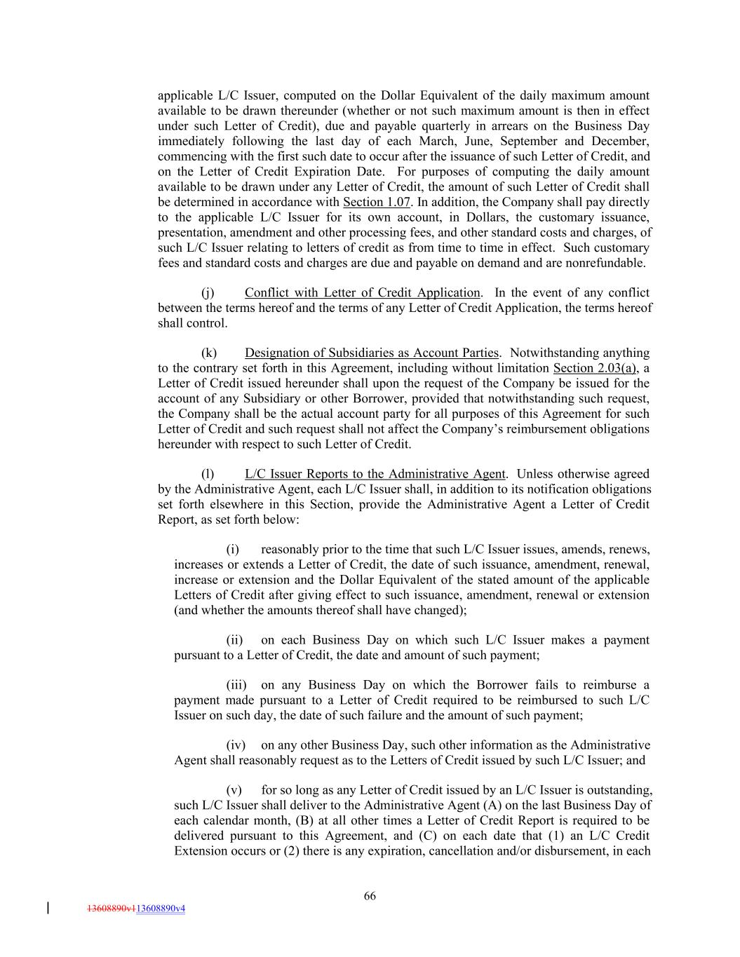 applicable L/C Issuer, computed on the Dollar Equivalent of the daily maximum amount available to be drawn thereunder (whether or not such maximum amount is then in effect under such Letter of Credit), due and payable quarterly in arrears on the Business Day immediately following the last day of each March, June, September and December, commencing with the first such date to occur after the issuance of such Letter of Credit, and on the Letter of Credit Expiration Date. For purposes of computing the daily amount available to be drawn under any Letter of Credit, the amount of such Letter of Credit shall be determined in accordance with Section 1.07. In addition, the Company shall pay directly to the applicable L/C Issuer for its own account, in Dollars, the customary issuance, presentation, amendment and other processing fees, and other standard costs and charges, of such L/C Issuer relating to letters of credit as from time to time in effect. Such customary fees and standard costs and charges are due and payable on demand and are nonrefundable. (j) Conflict with Letter of Credit Application. In the event of any conflict between the terms hereof and the terms of any Letter of Credit Application, the terms hereof shall control. (k) Designation of Subsidiaries as Account Parties. Notwithstanding anything to the contrary set forth in this Agreement, including without limitation Section 2.03(a), a Letter of Credit issued hereunder shall upon the request of the Company be issued for the account of any Subsidiary or other Borrower, provided that notwithstanding such request, the Company shall be the actual account party for all purposes of this Agreement for such Letter of Credit and such request shall not affect the Company’s reimbursement obligations hereunder with respect to such Letter of Credit. (l) L/C Issuer Reports to the Administrative Agent. Unless otherwise agreed by the Administrative Agent, each L/C Issuer shall, in addition to its notification obligations set forth elsewhere in this Section, provide the Administrative Agent a Letter of Credit Report, as set forth below: (i) reasonably prior to the time that such L/C Issuer issues, amends, renews, increases or extends a Letter of Credit, the date of such issuance, amendment, renewal, increase or extension and the Dollar Equivalent of the stated amount of the applicable Letters of Credit after giving effect to such issuance, amendment, renewal or extension (and whether the amounts thereof shall have changed); (ii) on each Business Day on which such L/C Issuer makes a payment pursuant to a Letter of Credit, the date and amount of such payment; (iii) on any Business Day on which the Borrower fails to reimburse a payment made pursuant to a Letter of Credit required to be reimbursed to such L/C Issuer on such day, the date of such failure and the amount of such payment; (iv) on any other Business Day, such other information as the Administrative Agent shall reasonably request as to the Letters of Credit issued by such L/C Issuer; and (v) for so long as any Letter of Credit issued by an L/C Issuer is outstanding, such L/C Issuer shall deliver to the Administrative Agent (A) on the last Business Day of each calendar month, (B) at all other times a Letter of Credit Report is required to be delivered pursuant to this Agreement, and (C) on each date that (1) an L/C Credit Extension occurs or (2) there is any expiration, cancellation and/or disbursement, in each 66 13608890v113608890v4