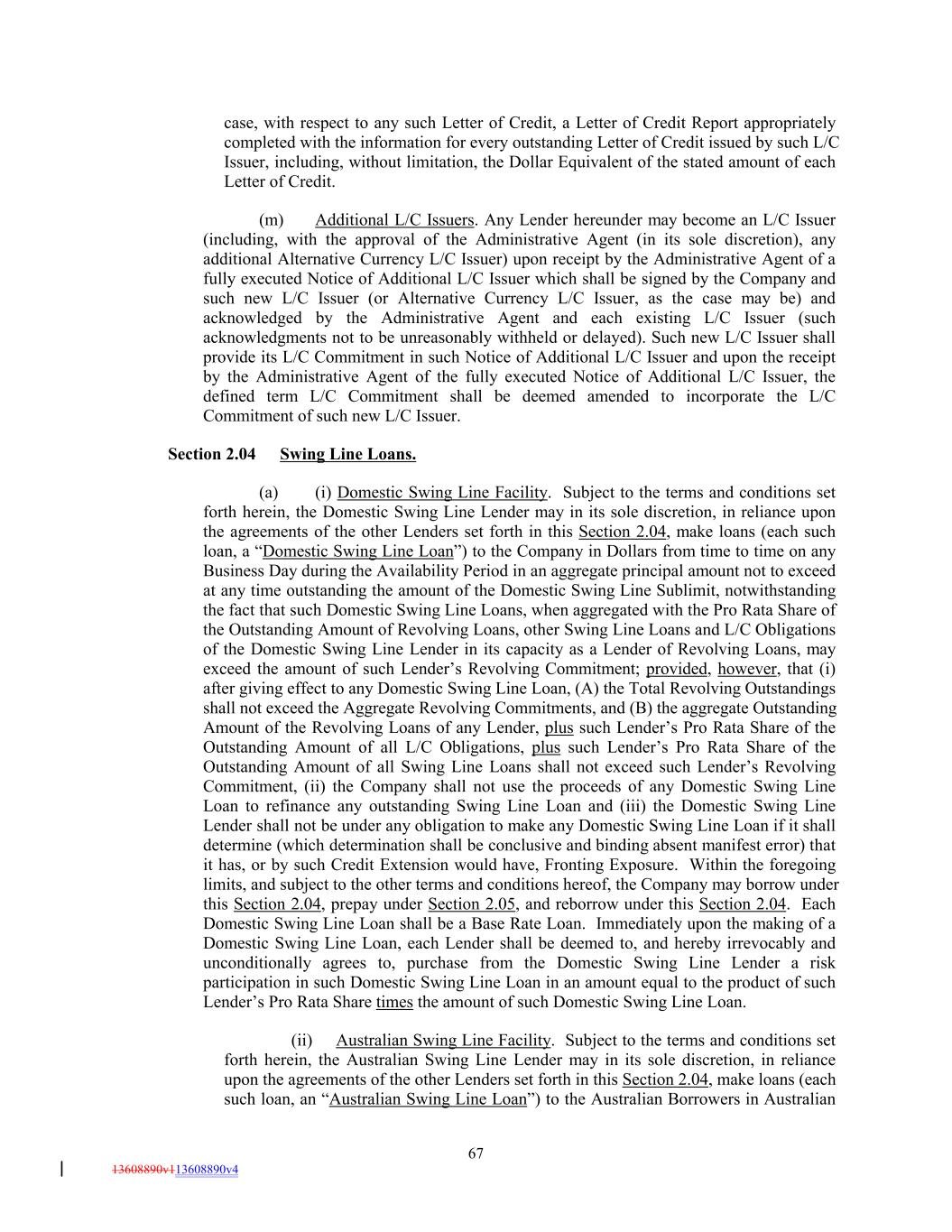case, with respect to any such Letter of Credit, a Letter of Credit Report appropriately completed with the information for every outstanding Letter of Credit issued by such L/C Issuer, including, without limitation, the Dollar Equivalent of the stated amount of each Letter of Credit. (m) Additional L/C Issuers. Any Lender hereunder may become an L/C Issuer (including, with the approval of the Administrative Agent (in its sole discretion), any additional Alternative Currency L/C Issuer) upon receipt by the Administrative Agent of a fully executed Notice of Additional L/C Issuer which shall be signed by the Company and such new L/C Issuer (or Alternative Currency L/C Issuer, as the case may be) and acknowledged by the Administrative Agent and each existing L/C Issuer (such acknowledgments not to be unreasonably withheld or delayed). Such new L/C Issuer shall provide its L/C Commitment in such Notice of Additional L/C Issuer and upon the receipt by the Administrative Agent of the fully executed Notice of Additional L/C Issuer, the defined term L/C Commitment shall be deemed amended to incorporate the L/C Commitment of such new L/C Issuer. Section 2.04 Swing Line Loans. (a) (i) Domestic Swing Line Facility. Subject to the terms and conditions set forth herein, the Domestic Swing Line Lender may in its sole discretion, in reliance upon the agreements of the other Lenders set forth in this Section 2.04, make loans (each such loan, a “Domestic Swing Line Loan”) to the Company in Dollars from time to time on any Business Day during the Availability Period in an aggregate principal amount not to exceed at any time outstanding the amount of the Domestic Swing Line Sublimit, notwithstanding the fact that such Domestic Swing Line Loans, when aggregated with the Pro Rata Share of the Outstanding Amount of Revolving Loans, other Swing Line Loans and L/C Obligations of the Domestic Swing Line Lender in its capacity as a Lender of Revolving Loans, may exceed the amount of such Lender’s Revolving Commitment; provided, however, that (i) after giving effect to any Domestic Swing Line Loan, (A) the Total Revolving Outstandings shall not exceed the Aggregate Revolving Commitments, and (B) the aggregate Outstanding Amount of the Revolving Loans of any Lender, plus such Lender’s Pro Rata Share of the Outstanding Amount of all L/C Obligations, plus such Lender’s Pro Rata Share of the Outstanding Amount of all Swing Line Loans shall not exceed such Lender’s Revolving Commitment, (ii) the Company shall not use the proceeds of any Domestic Swing Line Loan to refinance any outstanding Swing Line Loan and (iii) the Domestic Swing Line Lender shall not be under any obligation to make any Domestic Swing Line Loan if it shall determine (which determination shall be conclusive and binding absent manifest error) that it has, or by such Credit Extension would have, Fronting Exposure. Within the foregoing limits, and subject to the other terms and conditions hereof, the Company may borrow under this Section 2.04, prepay under Section 2.05, and reborrow under this Section 2.04. Each Domestic Swing Line Loan shall be a Base Rate Loan. Immediately upon the making of a Domestic Swing Line Loan, each Lender shall be deemed to, and hereby irrevocably and unconditionally agrees to, purchase from the Domestic Swing Line Lender a risk participation in such Domestic Swing Line Loan in an amount equal to the product of such Lender’s Pro Rata Share times the amount of such Domestic Swing Line Loan. (ii) Australian Swing Line Facility. Subject to the terms and conditions set forth herein, the Australian Swing Line Lender may in its sole discretion, in reliance upon the agreements of the other Lenders set forth in this Section 2.04, make loans (each such loan, an “Australian Swing Line Loan”) to the Australian Borrowers in Australian 67 13608890v113608890v4