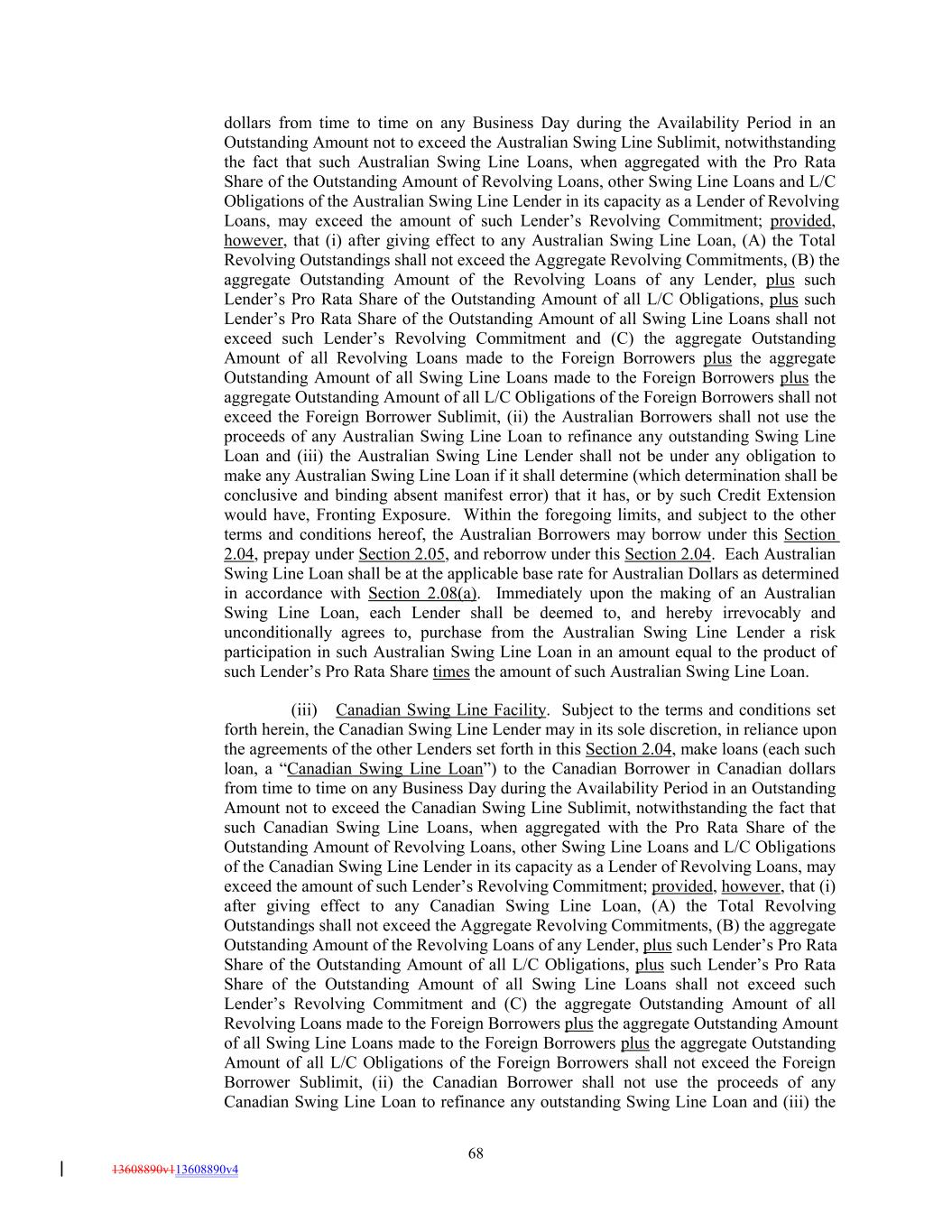 dollars from time to time on any Business Day during the Availability Period in an Outstanding Amount not to exceed the Australian Swing Line Sublimit, notwithstanding the fact that such Australian Swing Line Loans, when aggregated with the Pro Rata Share of the Outstanding Amount of Revolving Loans, other Swing Line Loans and L/C Obligations of the Australian Swing Line Lender in its capacity as a Lender of Revolving Loans, may exceed the amount of such Lender’s Revolving Commitment; provided, however, that (i) after giving effect to any Australian Swing Line Loan, (A) the Total Revolving Outstandings shall not exceed the Aggregate Revolving Commitments, (B) the aggregate Outstanding Amount of the Revolving Loans of any Lender, plus such Lender’s Pro Rata Share of the Outstanding Amount of all L/C Obligations, plus such Lender’s Pro Rata Share of the Outstanding Amount of all Swing Line Loans shall not exceed such Lender’s Revolving Commitment and (C) the aggregate Outstanding Amount of all Revolving Loans made to the Foreign Borrowers plus the aggregate Outstanding Amount of all Swing Line Loans made to the Foreign Borrowers plus the aggregate Outstanding Amount of all L/C Obligations of the Foreign Borrowers shall not exceed the Foreign Borrower Sublimit, (ii) the Australian Borrowers shall not use the proceeds of any Australian Swing Line Loan to refinance any outstanding Swing Line Loan and (iii) the Australian Swing Line Lender shall not be under any obligation to make any Australian Swing Line Loan if it shall determine (which determination shall be conclusive and binding absent manifest error) that it has, or by such Credit Extension would have, Fronting Exposure. Within the foregoing limits, and subject to the other terms and conditions hereof, the Australian Borrowers may borrow under this Section 2.04, prepay under Section 2.05, and reborrow under this Section 2.04. Each Australian Swing Line Loan shall be at the applicable base rate for Australian Dollars as determined in accordance with Section 2.08(a). Immediately upon the making of an Australian Swing Line Loan, each Lender shall be deemed to, and hereby irrevocably and unconditionally agrees to, purchase from the Australian Swing Line Lender a risk participation in such Australian Swing Line Loan in an amount equal to the product of such Lender’s Pro Rata Share times the amount of such Australian Swing Line Loan. (iii) Canadian Swing Line Facility. Subject to the terms and conditions set forth herein, the Canadian Swing Line Lender may in its sole discretion, in reliance upon the agreements of the other Lenders set forth in this Section 2.04, make loans (each such loan, a “Canadian Swing Line Loan”) to the Canadian Borrower in Canadian dollars from time to time on any Business Day during the Availability Period in an Outstanding Amount not to exceed the Canadian Swing Line Sublimit, notwithstanding the fact that such Canadian Swing Line Loans, when aggregated with the Pro Rata Share of the Outstanding Amount of Revolving Loans, other Swing Line Loans and L/C Obligations of the Canadian Swing Line Lender in its capacity as a Lender of Revolving Loans, may exceed the amount of such Lender’s Revolving Commitment; provided, however, that (i) after giving effect to any Canadian Swing Line Loan, (A) the Total Revolving Outstandings shall not exceed the Aggregate Revolving Commitments, (B) the aggregate Outstanding Amount of the Revolving Loans of any Lender, plus such Lender’s Pro Rata Share of the Outstanding Amount of all L/C Obligations, plus such Lender’s Pro Rata Share of the Outstanding Amount of all Swing Line Loans shall not exceed such Lender’s Revolving Commitment and (C) the aggregate Outstanding Amount of all Revolving Loans made to the Foreign Borrowers plus the aggregate Outstanding Amount of all Swing Line Loans made to the Foreign Borrowers plus the aggregate Outstanding Amount of all L/C Obligations of the Foreign Borrowers shall not exceed the Foreign Borrower Sublimit, (ii) the Canadian Borrower shall not use the proceeds of any Canadian Swing Line Loan to refinance any outstanding Swing Line Loan and (iii) the 68 13608890v113608890v4