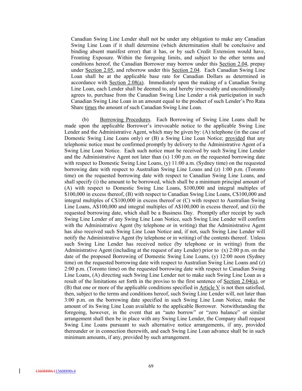 Canadian Swing Line Lender shall not be under any obligation to make any Canadian Swing Line Loan if it shall determine (which determination shall be conclusive and binding absent manifest error) that it has, or by such Credit Extension would have, Fronting Exposure. Within the foregoing limits, and subject to the other terms and conditions hereof, the Canadian Borrower may borrow under this Section 2.04, prepay under Section 2.05, and reborrow under this Section 2.04. Each Canadian Swing Line Loan shall be at the applicable base rate for Canadian Dollars as determined in accordance with Section 2.08(a). Immediately upon the making of a Canadian Swing Line Loan, each Lender shall be deemed to, and hereby irrevocably and unconditionally agrees to, purchase from the Canadian Swing Line Lender a risk participation in such Canadian Swing Line Loan in an amount equal to the product of such Lender’s Pro Rata Share times the amount of such Canadian Swing Line Loan. (b) Borrowing Procedures. Each Borrowing of Swing Line Loans shall be made upon the applicable Borrower’s irrevocable notice to the applicable Swing Line Lender and the Administrative Agent, which may be given by: (A) telephone (in the case of Domestic Swing Line Loans only) or (B) a Swing Line Loan Notice; provided that any telephonic notice must be confirmed promptly by delivery to the Administrative Agent of a Swing Line Loan Notice. Each such notice must be received by such Swing Line Lender and the Administrative Agent not later than (x) 1:00 p.m. on the requested borrowing date with respect to Domestic Swing Line Loans, (y) 11:00 a.m. (Sydney time) on the requested borrowing date with respect to Australian Swing Line Loans and (z) 1:00 p.m. (Toronto time) on the requested borrowing date with respect to Canadian Swing Line Loans, and shall specify (i) the amount to be borrowed, which shall be a minimum principal amount of (A) with respect to Domestic Swing Line Loans, $100,000 and integral multiples of $100,000 in excess thereof, (B) with respect to Canadian Swing Line Loans, C$100,000 and integral multiples of C$100,000 in excess thereof or (C) with respect to Australian Swing Line Loans, A$100,000 and integral multiples of A$100,000 in excess thereof, and (ii) the requested borrowing date, which shall be a Business Day. Promptly after receipt by such Swing Line Lender of any Swing Line Loan Notice, such Swing Line Lender will confirm with the Administrative Agent (by telephone or in writing) that the Administrative Agent has also received such Swing Line Loan Notice and, if not, such Swing Line Lender will notify the Administrative Agent (by telephone or in writing) of the contents thereof. Unless such Swing Line Lender has received notice (by telephone or in writing) from the Administrative Agent (including at the request of any Lender) prior to (x) 2:00 p.m. on the date of the proposed Borrowing of Domestic Swing Line Loans, (y) 12:00 noon (Sydney time) on the requested borrowing date with respect to Australian Swing Line Loans and (z) 2:00 p.m. (Toronto time) on the requested borrowing date with respect to Canadian Swing Line Loans, (A) directing such Swing Line Lender not to make such Swing Line Loan as a result of the limitations set forth in the proviso to the first sentence of Section 2.04(a), or (B) that one or more of the applicable conditions specified in Article V is not then satisfied, then, subject to the terms and conditions hereof, such Swing Line Lender will, not later than 3:00 p.m. on the borrowing date specified in such Swing Line Loan Notice, make the amount of its Swing Line Loan available to the applicable Borrower. Notwithstanding the foregoing, however, in the event that an “auto borrow” or “zero balance” or similar arrangement shall then be in place with any Swing Line Lender, the Company shall request Swing Line Loans pursuant to such alternative notice arrangements, if any, provided thereunder or in connection therewith, and each Swing Line Loan advance shall be in such minimum amounts, if any, provided by such arrangement. 69 13608890v113608890v4