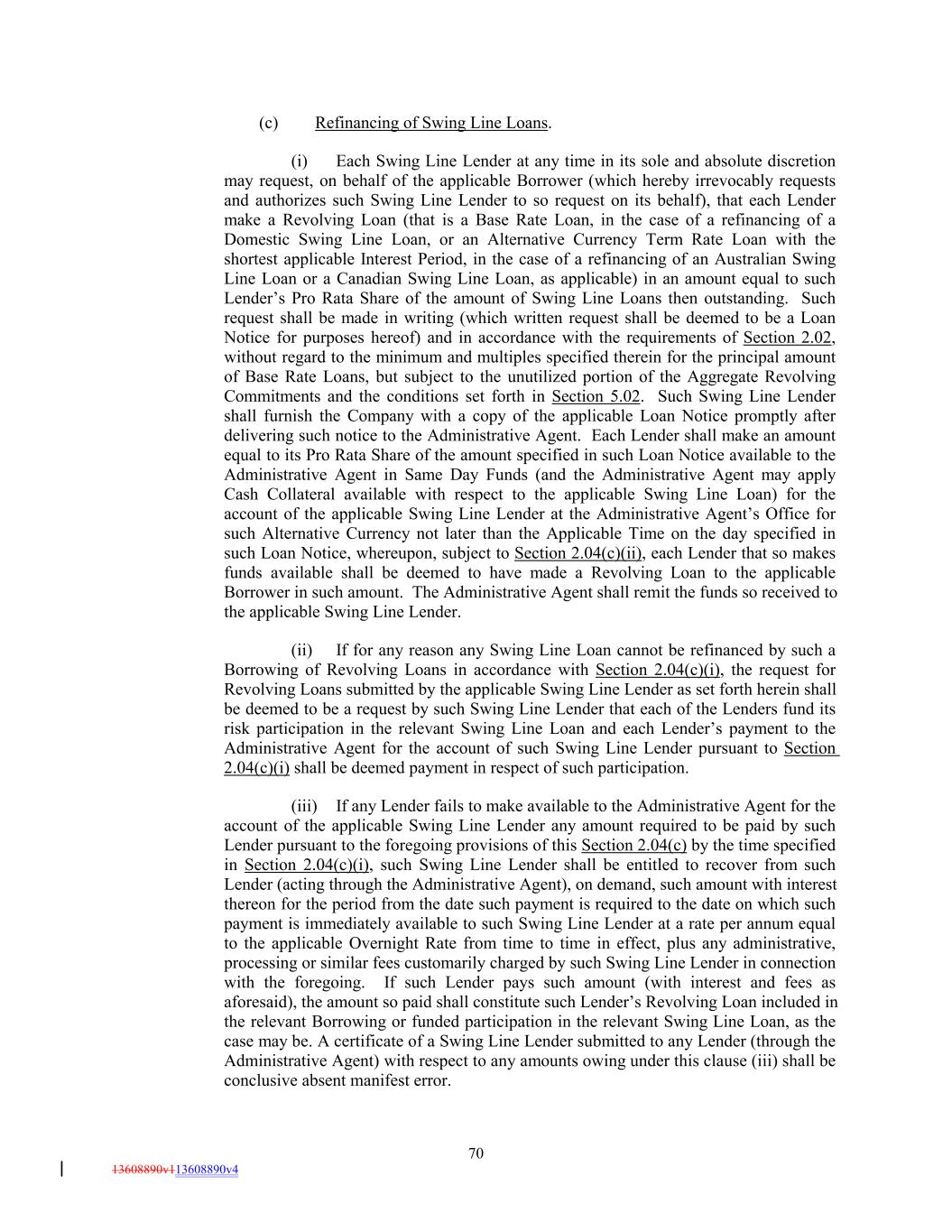 (c) Refinancing of Swing Line Loans. (i) Each Swing Line Lender at any time in its sole and absolute discretion may request, on behalf of the applicable Borrower (which hereby irrevocably requests and authorizes such Swing Line Lender to so request on its behalf), that each Lender make a Revolving Loan (that is a Base Rate Loan, in the case of a refinancing of a Domestic Swing Line Loan, or an Alternative Currency Term Rate Loan with the shortest applicable Interest Period, in the case of a refinancing of an Australian Swing Line Loan or a Canadian Swing Line Loan, as applicable) in an amount equal to such Lender’s Pro Rata Share of the amount of Swing Line Loans then outstanding. Such request shall be made in writing (which written request shall be deemed to be a Loan Notice for purposes hereof) and in accordance with the requirements of Section 2.02, without regard to the minimum and multiples specified therein for the principal amount of Base Rate Loans, but subject to the unutilized portion of the Aggregate Revolving Commitments and the conditions set forth in Section 5.02. Such Swing Line Lender shall furnish the Company with a copy of the applicable Loan Notice promptly after delivering such notice to the Administrative Agent. Each Lender shall make an amount equal to its Pro Rata Share of the amount specified in such Loan Notice available to the Administrative Agent in Same Day Funds (and the Administrative Agent may apply Cash Collateral available with respect to the applicable Swing Line Loan) for the account of the applicable Swing Line Lender at the Administrative Agent’s Office for such Alternative Currency not later than the Applicable Time on the day specified in such Loan Notice, whereupon, subject to Section 2.04(c)(ii), each Lender that so makes funds available shall be deemed to have made a Revolving Loan to the applicable Borrower in such amount. The Administrative Agent shall remit the funds so received to the applicable Swing Line Lender. (ii) If for any reason any Swing Line Loan cannot be refinanced by such a Borrowing of Revolving Loans in accordance with Section 2.04(c)(i), the request for Revolving Loans submitted by the applicable Swing Line Lender as set forth herein shall be deemed to be a request by such Swing Line Lender that each of the Lenders fund its risk participation in the relevant Swing Line Loan and each Lender’s payment to the Administrative Agent for the account of such Swing Line Lender pursuant to Section 2.04(c)(i) shall be deemed payment in respect of such participation. (iii) If any Lender fails to make available to the Administrative Agent for the account of the applicable Swing Line Lender any amount required to be paid by such Lender pursuant to the foregoing provisions of this Section 2.04(c) by the time specified in Section 2.04(c)(i), such Swing Line Lender shall be entitled to recover from such Lender (acting through the Administrative Agent), on demand, such amount with interest thereon for the period from the date such payment is required to the date on which such payment is immediately available to such Swing Line Lender at a rate per annum equal to the applicable Overnight Rate from time to time in effect, plus any administrative, processing or similar fees customarily charged by such Swing Line Lender in connection with the foregoing. If such Lender pays such amount (with interest and fees as aforesaid), the amount so paid shall constitute such Lender’s Revolving Loan included in the relevant Borrowing or funded participation in the relevant Swing Line Loan, as the case may be. A certificate of a Swing Line Lender submitted to any Lender (through the Administrative Agent) with respect to any amounts owing under this clause (iii) shall be conclusive absent manifest error. 70 13608890v113608890v4
