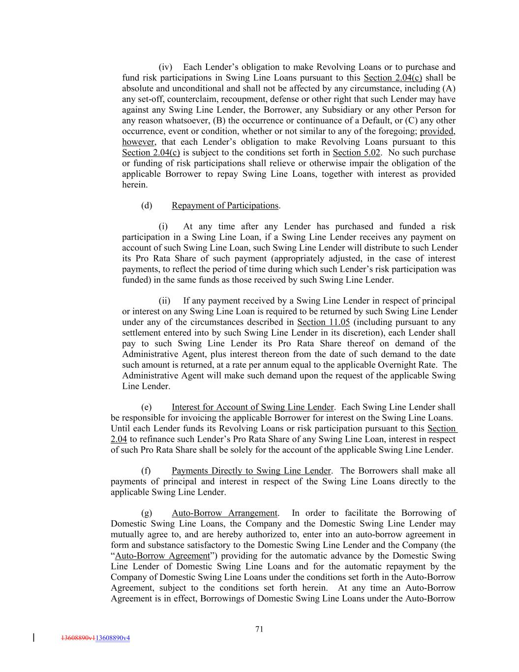 (iv) Each Lender’s obligation to make Revolving Loans or to purchase and fund risk participations in Swing Line Loans pursuant to this Section 2.04(c) shall be absolute and unconditional and shall not be affected by any circumstance, including (A) any set-off, counterclaim, recoupment, defense or other right that such Lender may have against any Swing Line Lender, the Borrower, any Subsidiary or any other Person for any reason whatsoever, (B) the occurrence or continuance of a Default, or (C) any other occurrence, event or condition, whether or not similar to any of the foregoing; provided, however, that each Lender’s obligation to make Revolving Loans pursuant to this Section 2.04(c) is subject to the conditions set forth in Section 5.02. No such purchase or funding of risk participations shall relieve or otherwise impair the obligation of the applicable Borrower to repay Swing Line Loans, together with interest as provided herein. (d) Repayment of Participations. (i) At any time after any Lender has purchased and funded a risk participation in a Swing Line Loan, if a Swing Line Lender receives any payment on account of such Swing Line Loan, such Swing Line Lender will distribute to such Lender its Pro Rata Share of such payment (appropriately adjusted, in the case of interest payments, to reflect the period of time during which such Lender’s risk participation was funded) in the same funds as those received by such Swing Line Lender. (ii) If any payment received by a Swing Line Lender in respect of principal or interest on any Swing Line Loan is required to be returned by such Swing Line Lender under any of the circumstances described in Section 11.05 (including pursuant to any settlement entered into by such Swing Line Lender in its discretion), each Lender shall pay to such Swing Line Lender its Pro Rata Share thereof on demand of the Administrative Agent, plus interest thereon from the date of such demand to the date such amount is returned, at a rate per annum equal to the applicable Overnight Rate. The Administrative Agent will make such demand upon the request of the applicable Swing Line Lender. (e) Interest for Account of Swing Line Lender. Each Swing Line Lender shall be responsible for invoicing the applicable Borrower for interest on the Swing Line Loans. Until each Lender funds its Revolving Loans or risk participation pursuant to this Section 2.04 to refinance such Lender’s Pro Rata Share of any Swing Line Loan, interest in respect of such Pro Rata Share shall be solely for the account of the applicable Swing Line Lender. (f) Payments Directly to Swing Line Lender. The Borrowers shall make all payments of principal and interest in respect of the Swing Line Loans directly to the applicable Swing Line Lender. (g) Auto-Borrow Arrangement. In order to facilitate the Borrowing of Domestic Swing Line Loans, the Company and the Domestic Swing Line Lender may mutually agree to, and are hereby authorized to, enter into an auto-borrow agreement in form and substance satisfactory to the Domestic Swing Line Lender and the Company (the “Auto-Borrow Agreement”) providing for the automatic advance by the Domestic Swing Line Lender of Domestic Swing Line Loans and for the automatic repayment by the Company of Domestic Swing Line Loans under the conditions set forth in the Auto-Borrow Agreement, subject to the conditions set forth herein. At any time an Auto-Borrow Agreement is in effect, Borrowings of Domestic Swing Line Loans under the Auto-Borrow 71 13608890v113608890v4