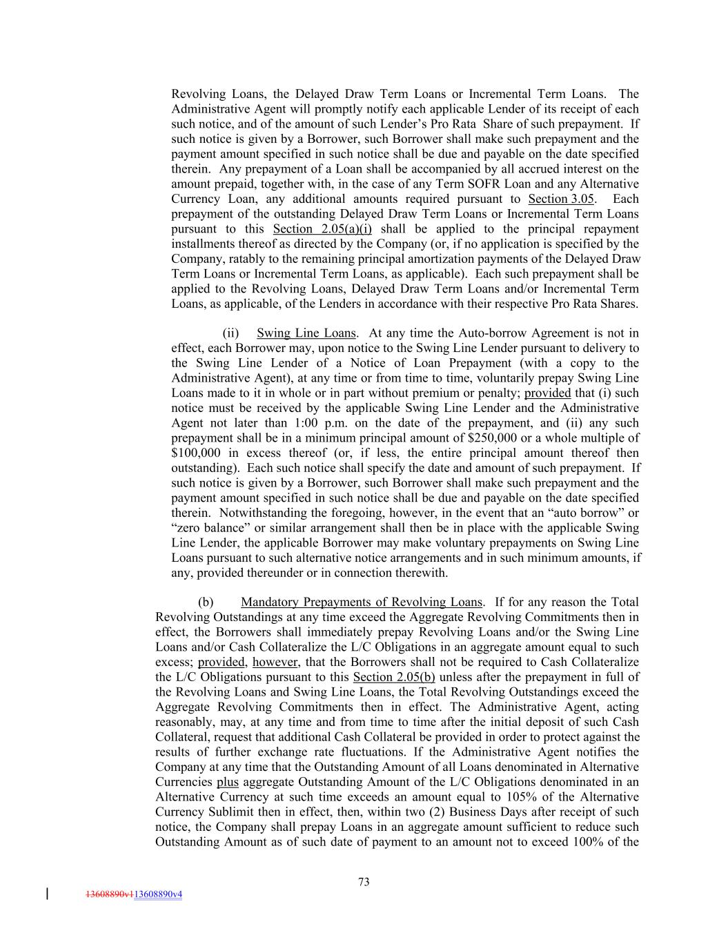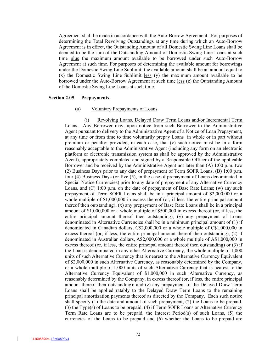 Agreement shall be made in accordance with the Auto-Borrow Agreement. For purposes of determining the Total Revolving Outstandings at any time during which an Auto-Borrow Agreement is in effect, the Outstanding Amount of all Domestic Swing Line Loans shall be deemed to be the sum of the Outstanding Amount of Domestic Swing Line Loans at such time plus the maximum amount available to be borrowed under such Auto-Borrow Agreement at such time. For purposes of determining the available amount for borrowings under the Domestic Swing Line Sublimit, the available amount shall be an amount equal to (x) the Domestic Swing Line Sublimit less (y) the maximum amount available to be borrowed under the Auto-Borrow Agreement at such time less (z) the Outstanding Amount of the Domestic Swing Line Loans at such time. Section 2.05 Prepayments. (a) Voluntary Prepayments of Loans. (i) Revolving Loans, Delayed Draw Term Loans and/or Incremental Term Loans. Any Borrower may, upon notice from such Borrower to the Administrative Agent pursuant to delivery to the Administrative Agent of a Notice of Loan Prepayment, at any time or from time to time voluntarily prepay Loans in whole or in part without premium or penalty; provided, in each case, that (v) such notice must be in a form reasonably acceptable to the Administrative Agent (including any form on an electronic platform or electronic transmission system as shall be approved by the Administrative Agent), appropriately completed and signed by a Responsible Officer of the applicable Borrower and be received by the Administrative Agent not later than (A) 1:00 p.m. two (2) Business Days prior to any date of prepayment of Term SOFR Loans, (B) 1:00 p.m. four (4) Business Days (or five (5), in the case of prepayment of Loans denominated in Special Notice Currencies) prior to any date of prepayment of any Alternative Currency Loans, and (C) 1:00 p.m. on the date of prepayment of Base Rate Loans; (w) any such prepayment of Term SOFR Loans shall be in a principal amount of $2,000,000 or a whole multiple of $1,000,000 in excess thereof (or, if less, the entire principal amount thereof then outstanding), (x) any prepayment of Base Rate Loans shall be in a principal amount of $1,000,000 or a whole multiple of $500,000 in excess thereof (or, if less, the entire principal amount thereof then outstanding), (y) any prepayment of Loans denominated in Alternative Currencies shall be in a minimum principal amount of (1) if denominated in Canadian dollars, C$2,000,000 or a whole multiple of C$1,000,000 in excess thereof (or, if less, the entire principal amount thereof then outstanding), (2) if denominated in Australian dollars, A$2,000,000 or a whole multiple of A$1,000,000 in excess thereof (or, if less, the entire principal amount thereof then outstanding) or (3) if the Loan is denominated in any other Alternative Currency, the whole multiple of 1,000 units of such Alternative Currency that is nearest to the Alternative Currency Equivalent of $2,000,000 in such Alternative Currency, as reasonably determined by the Company, or a whole multiple of 1,000 units of such Alternative Currency that is nearest to the Alternative Currency Equivalent of $1,000,000 in such Alternative Currency, as reasonably determined by the Company, in excess thereof (or, if less, the entire principal amount thereof then outstanding); and (z) any prepayment of the Delayed Draw Term Loans shall be applied ratably to the Delayed Draw Term Loans to the remaining principal amortization payments thereof as directed by the Company. Each such notice shall specify (1) the date and amount of such prepayment, (2) the Loans to be prepaid, (3) the Type(s) of Loans to be prepaid, (4) if Term SOFR Loans or Alternative Currency Term Rate Loans are to be prepaid, the Interest Period(s) of such Loans, (5) the currencies of the Loans to be prepaid and (6) whether the Loans to be prepaid are 72 13608890v113608890v4