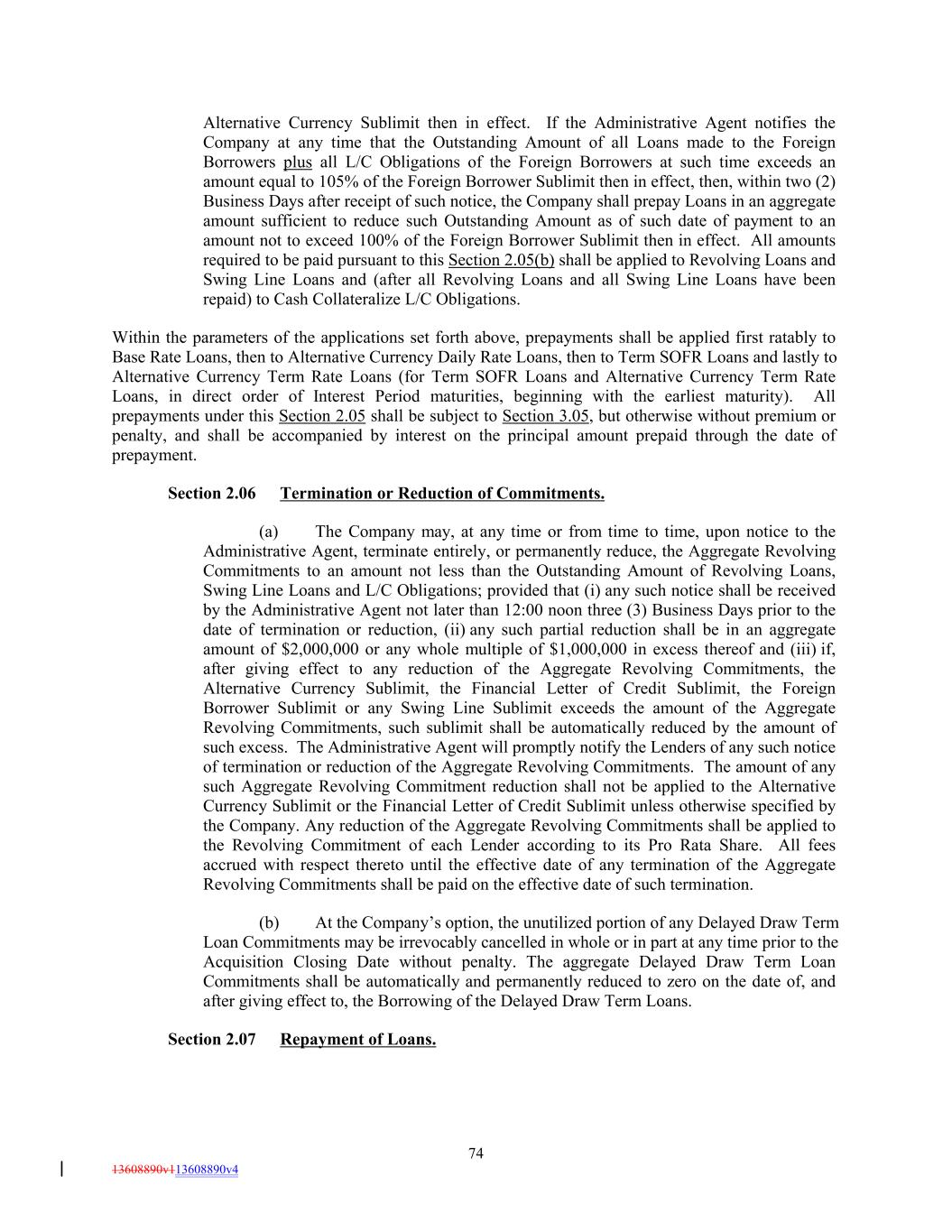 Alternative Currency Sublimit then in effect. If the Administrative Agent notifies the Company at any time that the Outstanding Amount of all Loans made to the Foreign Borrowers plus all L/C Obligations of the Foreign Borrowers at such time exceeds an amount equal to 105% of the Foreign Borrower Sublimit then in effect, then, within two (2) Business Days after receipt of such notice, the Company shall prepay Loans in an aggregate amount sufficient to reduce such Outstanding Amount as of such date of payment to an amount not to exceed 100% of the Foreign Borrower Sublimit then in effect. All amounts required to be paid pursuant to this Section 2.05(b) shall be applied to Revolving Loans and Swing Line Loans and (after all Revolving Loans and all Swing Line Loans have been repaid) to Cash Collateralize L/C Obligations. Within the parameters of the applications set forth above, prepayments shall be applied first ratably to Base Rate Loans, then to Alternative Currency Daily Rate Loans, then to Term SOFR Loans and lastly to Alternative Currency Term Rate Loans (for Term SOFR Loans and Alternative Currency Term Rate Loans, in direct order of Interest Period maturities, beginning with the earliest maturity). All prepayments under this Section 2.05 shall be subject to Section 3.05, but otherwise without premium or penalty, and shall be accompanied by interest on the principal amount prepaid through the date of prepayment. Section 2.06 Termination or Reduction of Commitments. (a) The Company may, at any time or from time to time, upon notice to the Administrative Agent, terminate entirely, or permanently reduce, the Aggregate Revolving Commitments to an amount not less than the Outstanding Amount of Revolving Loans, Swing Line Loans and L/C Obligations; provided that (i) any such notice shall be received by the Administrative Agent not later than 12:00 noon three (3) Business Days prior to the date of termination or reduction, (ii) any such partial reduction shall be in an aggregate amount of $2,000,000 or any whole multiple of $1,000,000 in excess thereof and (iii) if, after giving effect to any reduction of the Aggregate Revolving Commitments, the Alternative Currency Sublimit, the Financial Letter of Credit Sublimit, the Foreign Borrower Sublimit or any Swing Line Sublimit exceeds the amount of the Aggregate Revolving Commitments, such sublimit shall be automatically reduced by the amount of such excess. The Administrative Agent will promptly notify the Lenders of any such notice of termination or reduction of the Aggregate Revolving Commitments. The amount of any such Aggregate Revolving Commitment reduction shall not be applied to the Alternative Currency Sublimit or the Financial Letter of Credit Sublimit unless otherwise specified by the Company. Any reduction of the Aggregate Revolving Commitments shall be applied to the Revolving Commitment of each Lender according to its Pro Rata Share. All fees accrued with respect thereto until the effective date of any termination of the Aggregate Revolving Commitments shall be paid on the effective date of such termination. (b) At the Company’s option, the unutilized portion of any Delayed Draw Term Loan Commitments may be irrevocably cancelled in whole or in part at any time prior to the Acquisition Closing Date without penalty. The aggregate Delayed Draw Term Loan Commitments shall be automatically and permanently reduced to zero on the date of, and after giving effect to, the Borrowing of the Delayed Draw Term Loans. Section 2.07 Repayment of Loans. 74 13608890v113608890v4