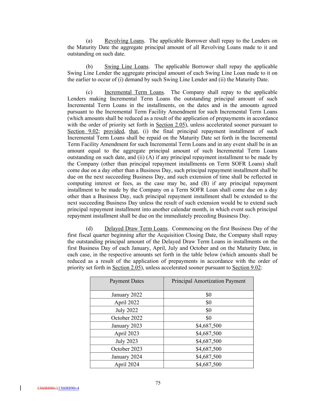 75 13608890v113608890v4 January 2023 $4,687,500 April 2022 Principal Amortization Payment April 2023 $0 $4,687,500 (a) Revolving Loans. The applicable Borrower shall repay to the Lenders on the Maturity Date the aggregate principal amount of all Revolving Loans made to it and outstanding on such date. (b) Swing Line Loans. The applicable Borrower shall repay the applicable Swing Line Lender the aggregate principal amount of each Swing Line Loan made to it on the earlier to occur of (i) demand by such Swing Line Lender and (ii) the Maturity Date. (c) Incremental Term Loans. The Company shall repay to the applicable Lenders making Incremental Term Loans the outstanding principal amount of such Incremental Term Loans in the installments, on the dates and in the amounts agreed pursuant to the Incremental Term Facility Amendment for such Incremental Term Loans (which amounts shall be reduced as a result of the application of prepayments in accordance with the order of priority set forth in Section 2.05), unless accelerated sooner pursuant to Section 9.02; provided, that, (i) the final principal repayment installment of such Incremental Term Loans shall be repaid on the Maturity Date set forth in the Incremental Term Facility Amendment for such Incremental Term Loans and in any event shall be in an amount equal to the aggregate principal amount of such Incremental Term Loans outstanding on such date, and (ii) (A) if any principal repayment installment to be made by the Company (other than principal repayment installments on Term SOFR Loans) shall come due on a day other than a Business Day, such principal repayment installment shall be due on the next succeeding Business Day, and such extension of time shall be reflected in computing interest or fees, as the case may be, and (B) if any principal repayment installment to be made by the Company on a Term SOFR Loan shall come due on a day other than a Business Day, such principal repayment installment shall be extended to the next succeeding Business Day unless the result of such extension would be to extend such principal repayment installment into another calendar month, in which event such principal repayment installment shall be due on the immediately preceding Business Day. (d) Delayed Draw Term Loans. Commencing on the first Business Day of the first fiscal quarter beginning after the Acquisition Closing Date, the Company shall repay the outstanding principal amount of the Delayed Draw Term Loans in installments on the first Business Day of each January, April, July and October and on the Maturity Date, in each case, in the respective amounts set forth in the table below (which amounts shall be reduced as a result of the application of prepayments in accordance with the order of priority set forth in Section 2.05), unless accelerated sooner pursuant to Section 9.02: July 2023 $4,687,500 July 2022 October 2023 $0 $4,687,500 January 2022 January 2024 $4,687,500 October 2022 $0 April 2024 $0 $4,687,500 Payment Dates