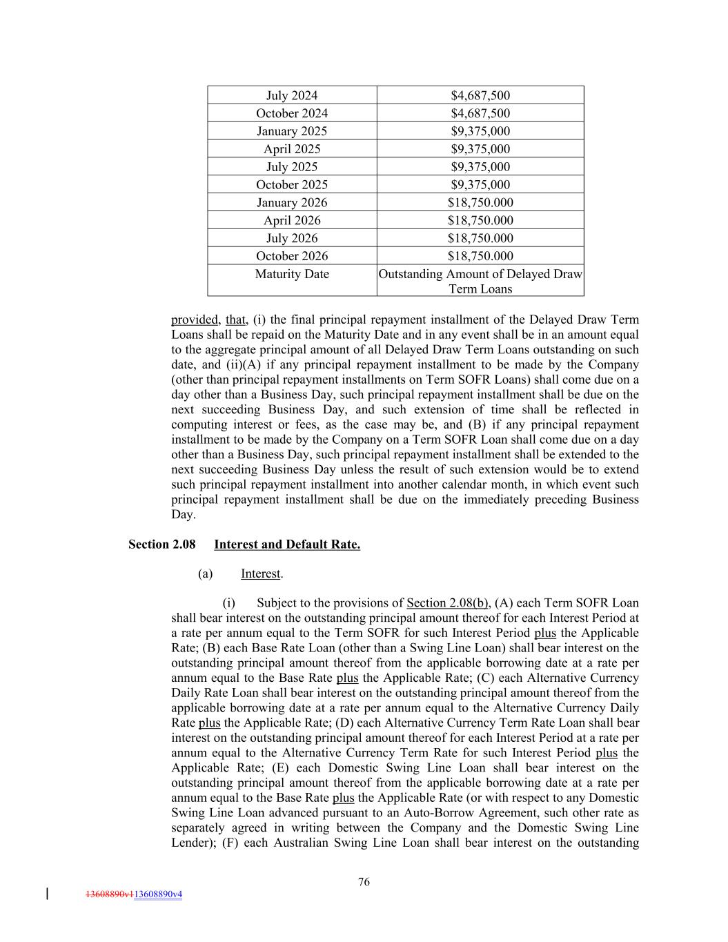 76 13608890v113608890v4 October 2025 January 2025 $9,375,000 $9,375,000 January 2026 $18,750.000 April 2026 April 2025 $18,750.000 October 2024 $9,375,000 July 2026 July 2024 $18,750.000 $4,687,500 October 2026 July 2025 $18,750.000 $9,375,000 Maturity Date Outstanding Amount of Delayed Draw Term Loans provided, that, (i) the final principal repayment installment of the Delayed Draw Term Loans shall be repaid on the Maturity Date and in any event shall be in an amount equal to the aggregate principal amount of all Delayed Draw Term Loans outstanding on such date, and (ii)(A) if any principal repayment installment to be made by the Company (other than principal repayment installments on Term SOFR Loans) shall come due on a day other than a Business Day, such principal repayment installment shall be due on the next succeeding Business Day, and such extension of time shall be reflected in computing interest or fees, as the case may be, and (B) if any principal repayment installment to be made by the Company on a Term SOFR Loan shall come due on a day other than a Business Day, such principal repayment installment shall be extended to the next succeeding Business Day unless the result of such extension would be to extend such principal repayment installment into another calendar month, in which event such principal repayment installment shall be due on the immediately preceding Business Day. Section 2.08 Interest and Default Rate. (a) Interest. (i) Subject to the provisions of Section 2.08(b), (A) each Term SOFR Loan shall bear interest on the outstanding principal amount thereof for each Interest Period at a rate per annum equal to the Term SOFR for such Interest Period plus the Applicable Rate; (B) each Base Rate Loan (other than a Swing Line Loan) shall bear interest on the outstanding principal amount thereof from the applicable borrowing date at a rate per annum equal to the Base Rate plus the Applicable Rate; (C) each Alternative Currency Daily Rate Loan shall bear interest on the outstanding principal amount thereof from the applicable borrowing date at a rate per annum equal to the Alternative Currency Daily Rate plus the Applicable Rate; (D) each Alternative Currency Term Rate Loan shall bear interest on the outstanding principal amount thereof for each Interest Period at a rate per annum equal to the Alternative Currency Term Rate for such Interest Period plus the Applicable Rate; (E) each Domestic Swing Line Loan shall bear interest on the outstanding principal amount thereof from the applicable borrowing date at a rate per annum equal to the Base Rate plus the Applicable Rate (or with respect to any Domestic Swing Line Loan advanced pursuant to an Auto-Borrow Agreement, such other rate as separately agreed in writing between the Company and the Domestic Swing Line Lender); (F) each Australian Swing Line Loan shall bear interest on the outstanding $4,687,500