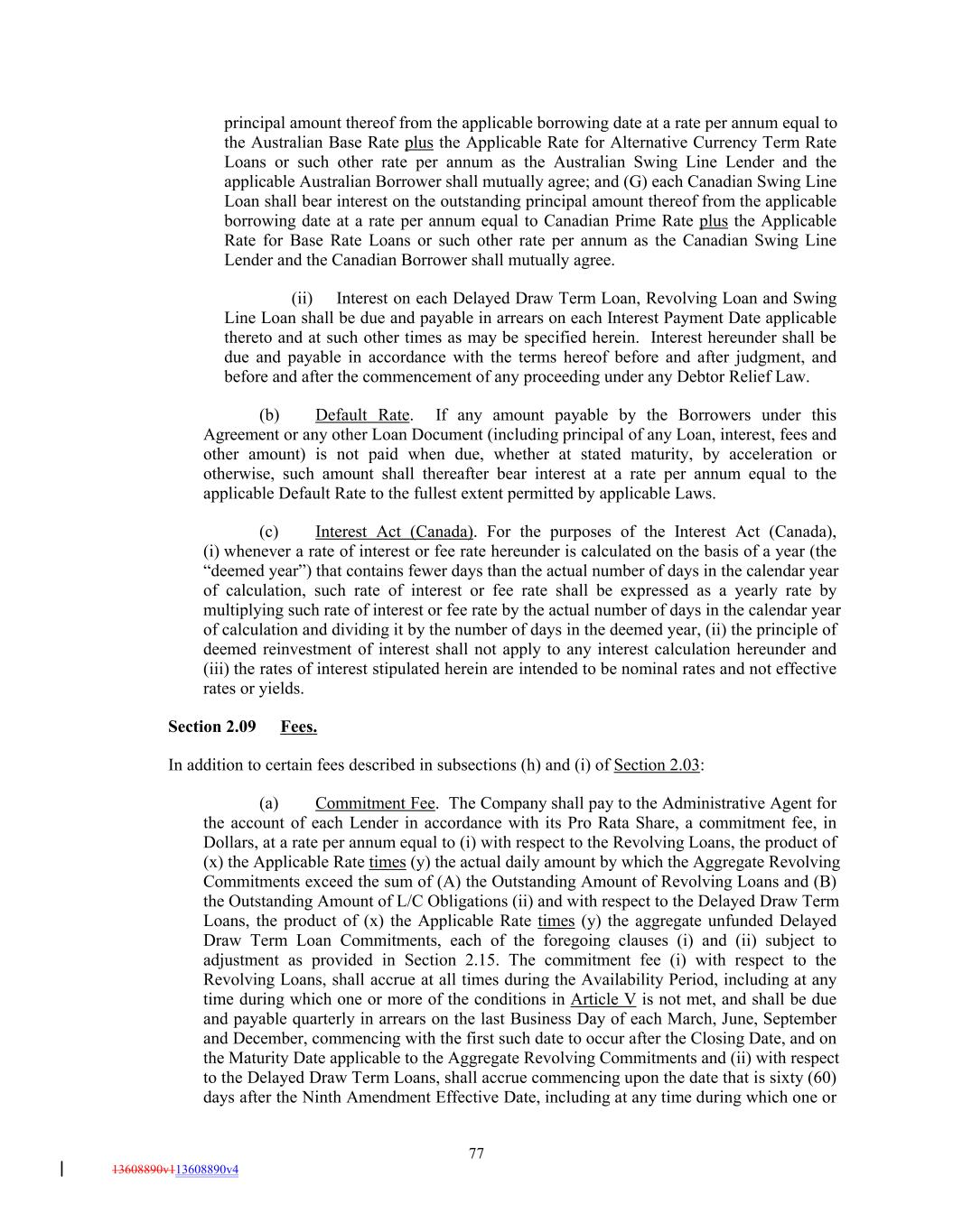 principal amount thereof from the applicable borrowing date at a rate per annum equal to the Australian Base Rate plus the Applicable Rate for Alternative Currency Term Rate Loans or such other rate per annum as the Australian Swing Line Lender and the applicable Australian Borrower shall mutually agree; and (G) each Canadian Swing Line Loan shall bear interest on the outstanding principal amount thereof from the applicable borrowing date at a rate per annum equal to Canadian Prime Rate plus the Applicable Rate for Base Rate Loans or such other rate per annum as the Canadian Swing Line Lender and the Canadian Borrower shall mutually agree. (ii) Interest on each Delayed Draw Term Loan, Revolving Loan and Swing Line Loan shall be due and payable in arrears on each Interest Payment Date applicable thereto and at such other times as may be specified herein. Interest hereunder shall be due and payable in accordance with the terms hereof before and after judgment, and before and after the commencement of any proceeding under any Debtor Relief Law. (b) Default Rate. If any amount payable by the Borrowers under this Agreement or any other Loan Document (including principal of any Loan, interest, fees and other amount) is not paid when due, whether at stated maturity, by acceleration or otherwise, such amount shall thereafter bear interest at a rate per annum equal to the applicable Default Rate to the fullest extent permitted by applicable Laws. (c) Interest Act (Canada). For the purposes of the Interest Act (Canada), (i) whenever a rate of interest or fee rate hereunder is calculated on the basis of a year (the “deemed year”) that contains fewer days than the actual number of days in the calendar year of calculation, such rate of interest or fee rate shall be expressed as a yearly rate by multiplying such rate of interest or fee rate by the actual number of days in the calendar year of calculation and dividing it by the number of days in the deemed year, (ii) the principle of deemed reinvestment of interest shall not apply to any interest calculation hereunder and (iii) the rates of interest stipulated herein are intended to be nominal rates and not effective rates or yields. Section 2.09 Fees. In addition to certain fees described in subsections (h) and (i) of Section 2.03: (a) Commitment Fee. The Company shall pay to the Administrative Agent for the account of each Lender in accordance with its Pro Rata Share, a commitment fee, in Dollars, at a rate per annum equal to (i) with respect to the Revolving Loans, the product of (x) the Applicable Rate times (y) the actual daily amount by which the Aggregate Revolving Commitments exceed the sum of (A) the Outstanding Amount of Revolving Loans and (B) the Outstanding Amount of L/C Obligations (ii) and with respect to the Delayed Draw Term Loans, the product of (x) the Applicable Rate times (y) the aggregate unfunded Delayed Draw Term Loan Commitments, each of the foregoing clauses (i) and (ii) subject to adjustment as provided in Section 2.15. The commitment fee (i) with respect to the Revolving Loans, shall accrue at all times during the Availability Period, including at any time during which one or more of the conditions in Article V is not met, and shall be due and payable quarterly in arrears on the last Business Day of each March, June, September and December, commencing with the first such date to occur after the Closing Date, and on the Maturity Date applicable to the Aggregate Revolving Commitments and (ii) with respect to the Delayed Draw Term Loans, shall accrue commencing upon the date that is sixty (60) days after the Ninth Amendment Effective Date, including at any time during which one or 77 13608890v113608890v4
