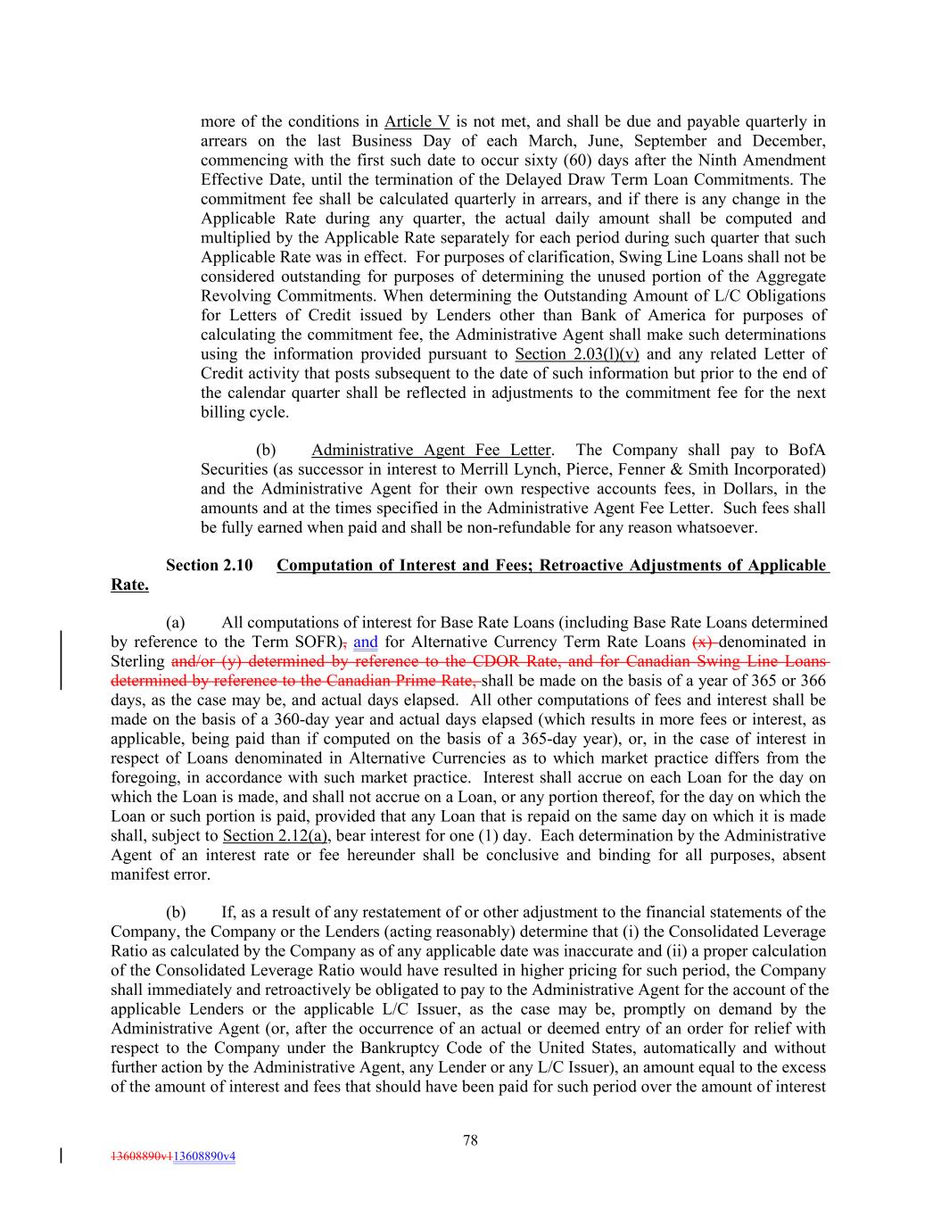 more of the conditions in Article V is not met, and shall be due and payable quarterly in arrears on the last Business Day of each March, June, September and December, commencing with the first such date to occur sixty (60) days after the Ninth Amendment Effective Date, until the termination of the Delayed Draw Term Loan Commitments. The commitment fee shall be calculated quarterly in arrears, and if there is any change in the Applicable Rate during any quarter, the actual daily amount shall be computed and multiplied by the Applicable Rate separately for each period during such quarter that such Applicable Rate was in effect. For purposes of clarification, Swing Line Loans shall not be considered outstanding for purposes of determining the unused portion of the Aggregate Revolving Commitments. When determining the Outstanding Amount of L/C Obligations for Letters of Credit issued by Lenders other than Bank of America for purposes of calculating the commitment fee, the Administrative Agent shall make such determinations using the information provided pursuant to Section 2.03(l)(v) and any related Letter of Credit activity that posts subsequent to the date of such information but prior to the end of the calendar quarter shall be reflected in adjustments to the commitment fee for the next billing cycle. (b) Administrative Agent Fee Letter. The Company shall pay to BofA Securities (as successor in interest to Merrill Lynch, Pierce, Fenner & Smith Incorporated) and the Administrative Agent for their own respective accounts fees, in Dollars, in the amounts and at the times specified in the Administrative Agent Fee Letter. Such fees shall be fully earned when paid and shall be non-refundable for any reason whatsoever. Section 2.10 Computation of Interest and Fees; Retroactive Adjustments of Applicable Rate. (a) All computations of interest for Base Rate Loans (including Base Rate Loans determined by reference to the Term SOFR), and for Alternative Currency Term Rate Loans (x) denominated in Sterling and/or (y) determined by reference to the CDOR Rate, and for Canadian Swing Line Loans determined by reference to the Canadian Prime Rate, shall be made on the basis of a year of 365 or 366 days, as the case may be, and actual days elapsed. All other computations of fees and interest shall be made on the basis of a 360-day year and actual days elapsed (which results in more fees or interest, as applicable, being paid than if computed on the basis of a 365-day year), or, in the case of interest in respect of Loans denominated in Alternative Currencies as to which market practice differs from the foregoing, in accordance with such market practice. Interest shall accrue on each Loan for the day on which the Loan is made, and shall not accrue on a Loan, or any portion thereof, for the day on which the Loan or such portion is paid, provided that any Loan that is repaid on the same day on which it is made shall, subject to Section 2.12(a), bear interest for one (1) day. Each determination by the Administrative Agent of an interest rate or fee hereunder shall be conclusive and binding for all purposes, absent manifest error. (b) If, as a result of any restatement of or other adjustment to the financial statements of the Company, the Company or the Lenders (acting reasonably) determine that (i) the Consolidated Leverage Ratio as calculated by the Company as of any applicable date was inaccurate and (ii) a proper calculation of the Consolidated Leverage Ratio would have resulted in higher pricing for such period, the Company shall immediately and retroactively be obligated to pay to the Administrative Agent for the account of the applicable Lenders or the applicable L/C Issuer, as the case may be, promptly on demand by the Administrative Agent (or, after the occurrence of an actual or deemed entry of an order for relief with respect to the Company under the Bankruptcy Code of the United States, automatically and without further action by the Administrative Agent, any Lender or any L/C Issuer), an amount equal to the excess of the amount of interest and fees that should have been paid for such period over the amount of interest 78 13608890v113608890v4