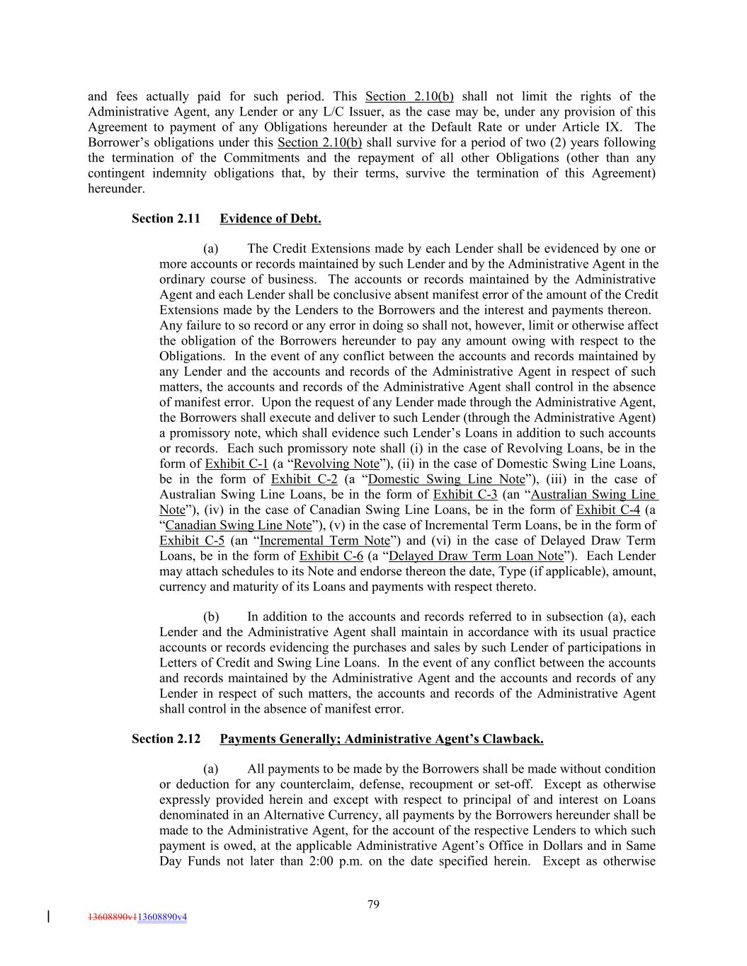 and fees actually paid for such period. This Section 2.10(b) shall not limit the rights of the Administrative Agent, any Lender or any L/C Issuer, as the case may be, under any provision of this Agreement to payment of any Obligations hereunder at the Default Rate or under Article IX. The Borrower’s obligations under this Section 2.10(b) shall survive for a period of two (2) years following the termination of the Commitments and the repayment of all other Obligations (other than any contingent indemnity obligations that, by their terms, survive the termination of this Agreement) hereunder. Section 2.11 Evidence of Debt. (a) The Credit Extensions made by each Lender shall be evidenced by one or more accounts or records maintained by such Lender and by the Administrative Agent in the ordinary course of business. The accounts or records maintained by the Administrative Agent and each Lender shall be conclusive absent manifest error of the amount of the Credit Extensions made by the Lenders to the Borrowers and the interest and payments thereon. Any failure to so record or any error in doing so shall not, however, limit or otherwise affect the obligation of the Borrowers hereunder to pay any amount owing with respect to the Obligations. In the event of any conflict between the accounts and records maintained by any Lender and the accounts and records of the Administrative Agent in respect of such matters, the accounts and records of the Administrative Agent shall control in the absence of manifest error. Upon the request of any Lender made through the Administrative Agent, the Borrowers shall execute and deliver to such Lender (through the Administrative Agent) a promissory note, which shall evidence such Lender’s Loans in addition to such accounts or records. Each such promissory note shall (i) in the case of Revolving Loans, be in the form of Exhibit C-1 (a “Revolving Note”), (ii) in the case of Domestic Swing Line Loans, be in the form of Exhibit C-2 (a “Domestic Swing Line Note”), (iii) in the case of Australian Swing Line Loans, be in the form of Exhibit C-3 (an “Australian Swing Line Note”), (iv) in the case of Canadian Swing Line Loans, be in the form of Exhibit C-4 (a “Canadian Swing Line Note”), (v) in the case of Incremental Term Loans, be in the form of Exhibit C-5 (an “Incremental Term Note”) and (vi) in the case of Delayed Draw Term Loans, be in the form of Exhibit C-6 (a “Delayed Draw Term Loan Note”). Each Lender may attach schedules to its Note and endorse thereon the date, Type (if applicable), amount, currency and maturity of its Loans and payments with respect thereto. (b) In addition to the accounts and records referred to in subsection (a), each Lender and the Administrative Agent shall maintain in accordance with its usual practice accounts or records evidencing the purchases and sales by such Lender of participations in Letters of Credit and Swing Line Loans. In the event of any conflict between the accounts and records maintained by the Administrative Agent and the accounts and records of any Lender in respect of such matters, the accounts and records of the Administrative Agent shall control in the absence of manifest error. Section 2.12 Payments Generally; Administrative Agent’s Clawback. (a) All payments to be made by the Borrowers shall be made without condition or deduction for any counterclaim, defense, recoupment or set-off. Except as otherwise expressly provided herein and except with respect to principal of and interest on Loans denominated in an Alternative Currency, all payments by the Borrowers hereunder shall be made to the Administrative Agent, for the account of the respective Lenders to which such payment is owed, at the applicable Administrative Agent’s Office in Dollars and in Same Day Funds not later than 2:00 p.m. on the date specified herein. Except as otherwise 79 13608890v113608890v4