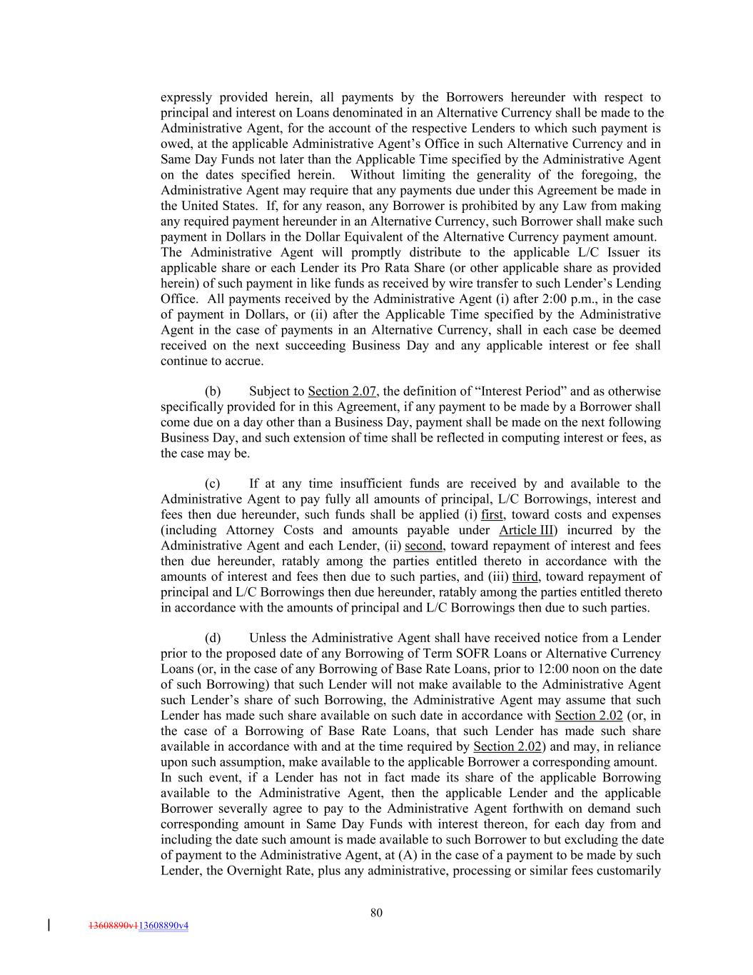 expressly provided herein, all payments by the Borrowers hereunder with respect to principal and interest on Loans denominated in an Alternative Currency shall be made to the Administrative Agent, for the account of the respective Lenders to which such payment is owed, at the applicable Administrative Agent’s Office in such Alternative Currency and in Same Day Funds not later than the Applicable Time specified by the Administrative Agent on the dates specified herein. Without limiting the generality of the foregoing, the Administrative Agent may require that any payments due under this Agreement be made in the United States. If, for any reason, any Borrower is prohibited by any Law from making any required payment hereunder in an Alternative Currency, such Borrower shall make such payment in Dollars in the Dollar Equivalent of the Alternative Currency payment amount. The Administrative Agent will promptly distribute to the applicable L/C Issuer its applicable share or each Lender its Pro Rata Share (or other applicable share as provided herein) of such payment in like funds as received by wire transfer to such Lender’s Lending Office. All payments received by the Administrative Agent (i) after 2:00 p.m., in the case of payment in Dollars, or (ii) after the Applicable Time specified by the Administrative Agent in the case of payments in an Alternative Currency, shall in each case be deemed received on the next succeeding Business Day and any applicable interest or fee shall continue to accrue. (b) Subject to Section 2.07, the definition of “Interest Period” and as otherwise specifically provided for in this Agreement, if any payment to be made by a Borrower shall come due on a day other than a Business Day, payment shall be made on the next following Business Day, and such extension of time shall be reflected in computing interest or fees, as the case may be. (c) If at any time insufficient funds are received by and available to the Administrative Agent to pay fully all amounts of principal, L/C Borrowings, interest and fees then due hereunder, such funds shall be applied (i) first, toward costs and expenses (including Attorney Costs and amounts payable under Article III) incurred by the Administrative Agent and each Lender, (ii) second, toward repayment of interest and fees then due hereunder, ratably among the parties entitled thereto in accordance with the amounts of interest and fees then due to such parties, and (iii) third, toward repayment of principal and L/C Borrowings then due hereunder, ratably among the parties entitled thereto in accordance with the amounts of principal and L/C Borrowings then due to such parties. (d) Unless the Administrative Agent shall have received notice from a Lender prior to the proposed date of any Borrowing of Term SOFR Loans or Alternative Currency Loans (or, in the case of any Borrowing of Base Rate Loans, prior to 12:00 noon on the date of such Borrowing) that such Lender will not make available to the Administrative Agent such Lender’s share of such Borrowing, the Administrative Agent may assume that such Lender has made such share available on such date in accordance with Section 2.02 (or, in the case of a Borrowing of Base Rate Loans, that such Lender has made such share available in accordance with and at the time required by Section 2.02) and may, in reliance upon such assumption, make available to the applicable Borrower a corresponding amount. In such event, if a Lender has not in fact made its share of the applicable Borrowing available to the Administrative Agent, then the applicable Lender and the applicable Borrower severally agree to pay to the Administrative Agent forthwith on demand such corresponding amount in Same Day Funds with interest thereon, for each day from and including the date such amount is made available to such Borrower to but excluding the date of payment to the Administrative Agent, at (A) in the case of a payment to be made by such Lender, the Overnight Rate, plus any administrative, processing or similar fees customarily 80 13608890v113608890v4