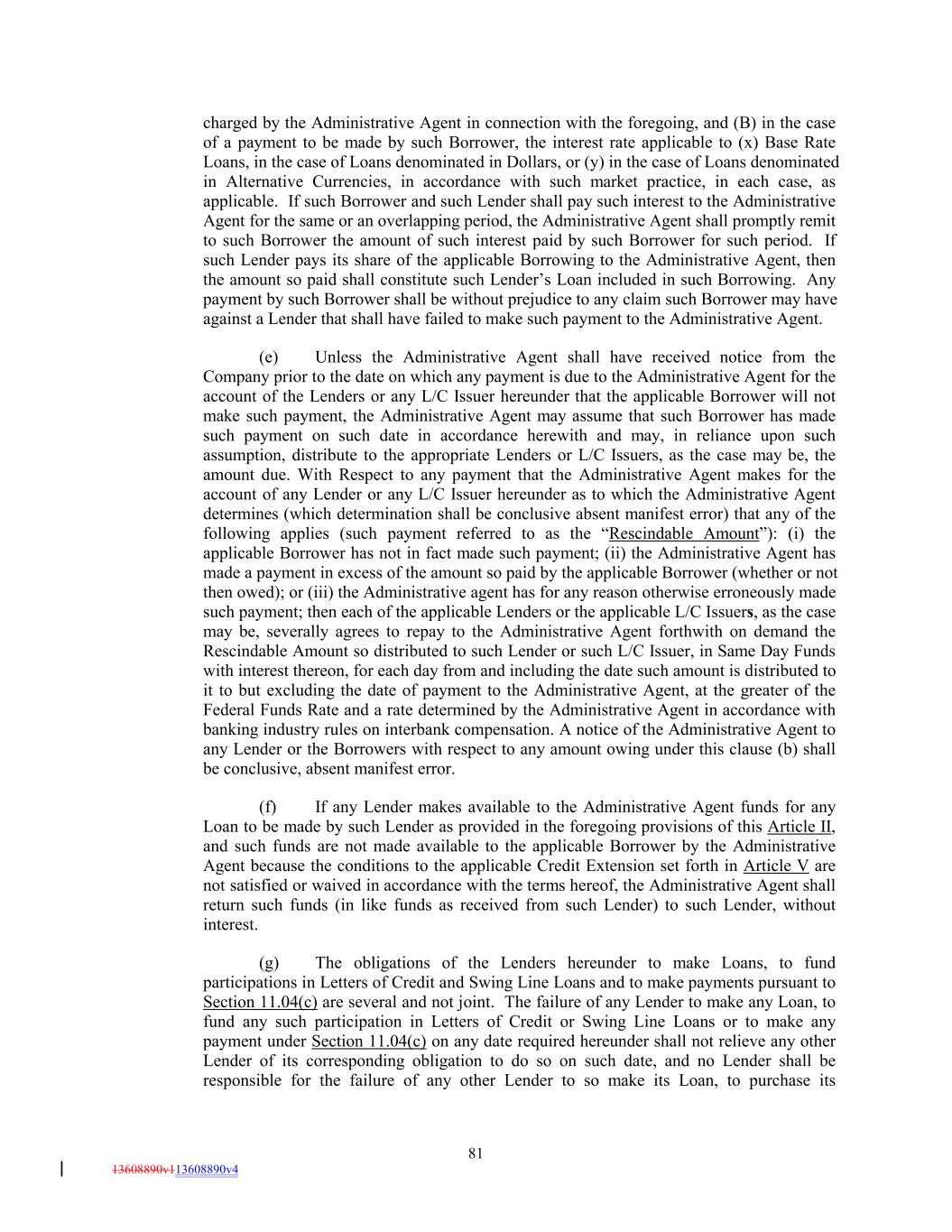 charged by the Administrative Agent in connection with the foregoing, and (B) in the case of a payment to be made by such Borrower, the interest rate applicable to (x) Base Rate Loans, in the case of Loans denominated in Dollars, or (y) in the case of Loans denominated in Alternative Currencies, in accordance with such market practice, in each case, as applicable. If such Borrower and such Lender shall pay such interest to the Administrative Agent for the same or an overlapping period, the Administrative Agent shall promptly remit to such Borrower the amount of such interest paid by such Borrower for such period. If such Lender pays its share of the applicable Borrowing to the Administrative Agent, then the amount so paid shall constitute such Lender’s Loan included in such Borrowing. Any payment by such Borrower shall be without prejudice to any claim such Borrower may have against a Lender that shall have failed to make such payment to the Administrative Agent. (e) Unless the Administrative Agent shall have received notice from the Company prior to the date on which any payment is due to the Administrative Agent for the account of the Lenders or any L/C Issuer hereunder that the applicable Borrower will not make such payment, the Administrative Agent may assume that such Borrower has made such payment on such date in accordance herewith and may, in reliance upon such assumption, distribute to the appropriate Lenders or L/C Issuers, as the case may be, the amount due. With Respect to any payment that the Administrative Agent makes for the account of any Lender or any L/C Issuer hereunder as to which the Administrative Agent determines (which determination shall be conclusive absent manifest error) that any of the following applies (such payment referred to as the “Rescindable Amount”): (i) the applicable Borrower has not in fact made such payment; (ii) the Administrative Agent has made a payment in excess of the amount so paid by the applicable Borrower (whether or not then owed); or (iii) the Administrative agent has for any reason otherwise erroneously made such payment; then each of the applicable Lenders or the applicable L/C Issuers, as the case may be, severally agrees to repay to the Administrative Agent forthwith on demand the Rescindable Amount so distributed to such Lender or such L/C Issuer, in Same Day Funds with interest thereon, for each day from and including the date such amount is distributed to it to but excluding the date of payment to the Administrative Agent, at the greater of the Federal Funds Rate and a rate determined by the Administrative Agent in accordance with banking industry rules on interbank compensation. A notice of the Administrative Agent to any Lender or the Borrowers with respect to any amount owing under this clause (b) shall be conclusive, absent manifest error. (f) If any Lender makes available to the Administrative Agent funds for any Loan to be made by such Lender as provided in the foregoing provisions of this Article II, and such funds are not made available to the applicable Borrower by the Administrative Agent because the conditions to the applicable Credit Extension set forth in Article V are not satisfied or waived in accordance with the terms hereof, the Administrative Agent shall return such funds (in like funds as received from such Lender) to such Lender, without interest. (g) The obligations of the Lenders hereunder to make Loans, to fund participations in Letters of Credit and Swing Line Loans and to make payments pursuant to Section 11.04(c) are several and not joint. The failure of any Lender to make any Loan, to fund any such participation in Letters of Credit or Swing Line Loans or to make any payment under Section 11.04(c) on any date required hereunder shall not relieve any other Lender of its corresponding obligation to do so on such date, and no Lender shall be responsible for the failure of any other Lender to so make its Loan, to purchase its 81 13608890v113608890v4