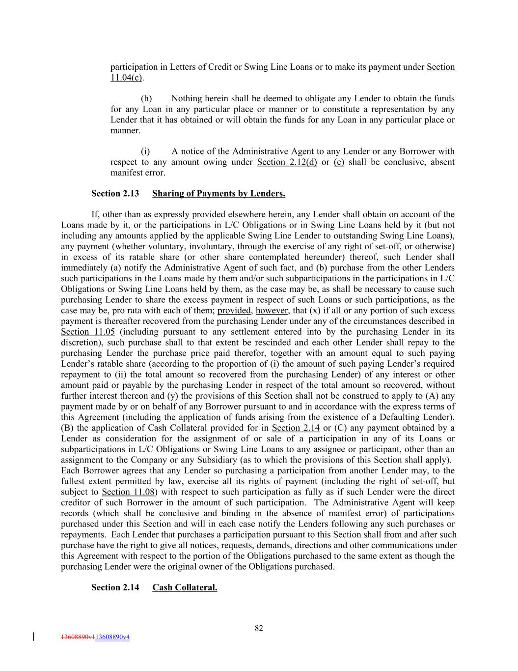 participation in Letters of Credit or Swing Line Loans or to make its payment under Section 11.04(c). (h) Nothing herein shall be deemed to obligate any Lender to obtain the funds for any Loan in any particular place or manner or to constitute a representation by any Lender that it has obtained or will obtain the funds for any Loan in any particular place or manner. (i) A notice of the Administrative Agent to any Lender or any Borrower with respect to any amount owing under Section 2.12(d) or (e) shall be conclusive, absent manifest error. Section 2.13 Sharing of Payments by Lenders. If, other than as expressly provided elsewhere herein, any Lender shall obtain on account of the Loans made by it, or the participations in L/C Obligations or in Swing Line Loans held by it (but not including any amounts applied by the applicable Swing Line Lender to outstanding Swing Line Loans), any payment (whether voluntary, involuntary, through the exercise of any right of set-off, or otherwise) in excess of its ratable share (or other share contemplated hereunder) thereof, such Lender shall immediately (a) notify the Administrative Agent of such fact, and (b) purchase from the other Lenders such participations in the Loans made by them and/or such subparticipations in the participations in L/C Obligations or Swing Line Loans held by them, as the case may be, as shall be necessary to cause such purchasing Lender to share the excess payment in respect of such Loans or such participations, as the case may be, pro rata with each of them; provided, however, that (x) if all or any portion of such excess payment is thereafter recovered from the purchasing Lender under any of the circumstances described in Section 11.05 (including pursuant to any settlement entered into by the purchasing Lender in its discretion), such purchase shall to that extent be rescinded and each other Lender shall repay to the purchasing Lender the purchase price paid therefor, together with an amount equal to such paying Lender’s ratable share (according to the proportion of (i) the amount of such paying Lender’s required repayment to (ii) the total amount so recovered from the purchasing Lender) of any interest or other amount paid or payable by the purchasing Lender in respect of the total amount so recovered, without further interest thereon and (y) the provisions of this Section shall not be construed to apply to (A) any payment made by or on behalf of any Borrower pursuant to and in accordance with the express terms of this Agreement (including the application of funds arising from the existence of a Defaulting Lender), (B) the application of Cash Collateral provided for in Section 2.14 or (C) any payment obtained by a Lender as consideration for the assignment of or sale of a participation in any of its Loans or subparticipations in L/C Obligations or Swing Line Loans to any assignee or participant, other than an assignment to the Company or any Subsidiary (as to which the provisions of this Section shall apply). Each Borrower agrees that any Lender so purchasing a participation from another Lender may, to the fullest extent permitted by law, exercise all its rights of payment (including the right of set-off, but subject to Section 11.08) with respect to such participation as fully as if such Lender were the direct creditor of such Borrower in the amount of such participation. The Administrative Agent will keep records (which shall be conclusive and binding in the absence of manifest error) of participations purchased under this Section and will in each case notify the Lenders following any such purchases or repayments. Each Lender that purchases a participation pursuant to this Section shall from and after such purchase have the right to give all notices, requests, demands, directions and other communications under this Agreement with respect to the portion of the Obligations purchased to the same extent as though the purchasing Lender were the original owner of the Obligations purchased. Section 2.14 Cash Collateral. 82 13608890v113608890v4