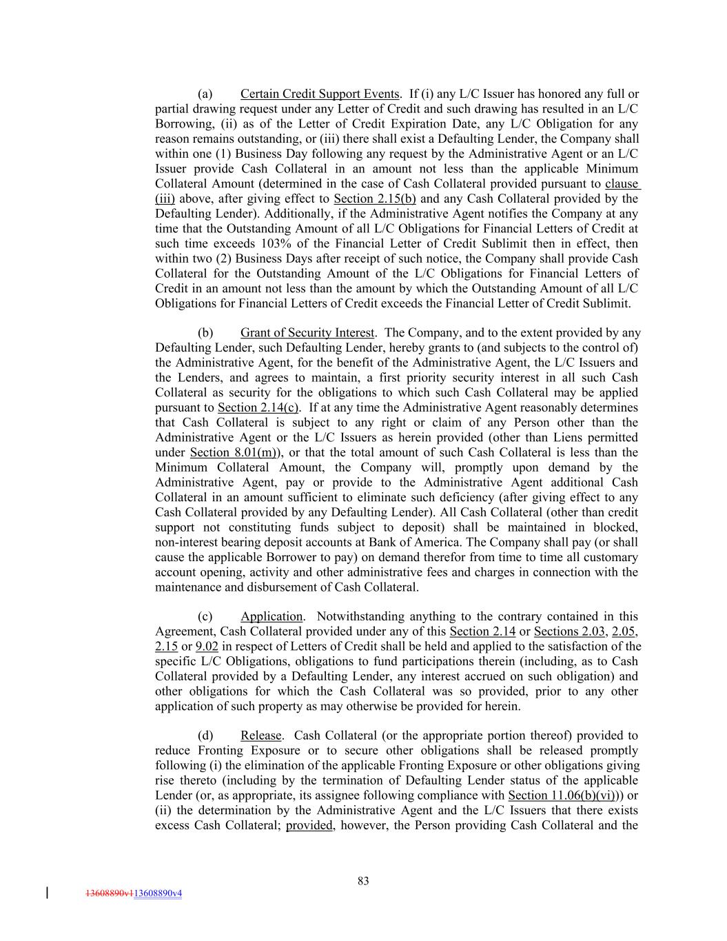 (a) Certain Credit Support Events. If (i) any L/C Issuer has honored any full or partial drawing request under any Letter of Credit and such drawing has resulted in an L/C Borrowing, (ii) as of the Letter of Credit Expiration Date, any L/C Obligation for any reason remains outstanding, or (iii) there shall exist a Defaulting Lender, the Company shall within one (1) Business Day following any request by the Administrative Agent or an L/C Issuer provide Cash Collateral in an amount not less than the applicable Minimum Collateral Amount (determined in the case of Cash Collateral provided pursuant to clause (iii) above, after giving effect to Section 2.15(b) and any Cash Collateral provided by the Defaulting Lender). Additionally, if the Administrative Agent notifies the Company at any time that the Outstanding Amount of all L/C Obligations for Financial Letters of Credit at such time exceeds 103% of the Financial Letter of Credit Sublimit then in effect, then within two (2) Business Days after receipt of such notice, the Company shall provide Cash Collateral for the Outstanding Amount of the L/C Obligations for Financial Letters of Credit in an amount not less than the amount by which the Outstanding Amount of all L/C Obligations for Financial Letters of Credit exceeds the Financial Letter of Credit Sublimit. (b) Grant of Security Interest. The Company, and to the extent provided by any Defaulting Lender, such Defaulting Lender, hereby grants to (and subjects to the control of) the Administrative Agent, for the benefit of the Administrative Agent, the L/C Issuers and the Lenders, and agrees to maintain, a first priority security interest in all such Cash Collateral as security for the obligations to which such Cash Collateral may be applied pursuant to Section 2.14(c). If at any time the Administrative Agent reasonably determines that Cash Collateral is subject to any right or claim of any Person other than the Administrative Agent or the L/C Issuers as herein provided (other than Liens permitted under Section 8.01(m)), or that the total amount of such Cash Collateral is less than the Minimum Collateral Amount, the Company will, promptly upon demand by the Administrative Agent, pay or provide to the Administrative Agent additional Cash Collateral in an amount sufficient to eliminate such deficiency (after giving effect to any Cash Collateral provided by any Defaulting Lender). All Cash Collateral (other than credit support not constituting funds subject to deposit) shall be maintained in blocked, non-interest bearing deposit accounts at Bank of America. The Company shall pay (or shall cause the applicable Borrower to pay) on demand therefor from time to time all customary account opening, activity and other administrative fees and charges in connection with the maintenance and disbursement of Cash Collateral. (c) Application. Notwithstanding anything to the contrary contained in this Agreement, Cash Collateral provided under any of this Section 2.14 or Sections 2.03, 2.05, 2.15 or 9.02 in respect of Letters of Credit shall be held and applied to the satisfaction of the specific L/C Obligations, obligations to fund participations therein (including, as to Cash Collateral provided by a Defaulting Lender, any interest accrued on such obligation) and other obligations for which the Cash Collateral was so provided, prior to any other application of such property as may otherwise be provided for herein. (d) Release. Cash Collateral (or the appropriate portion thereof) provided to reduce Fronting Exposure or to secure other obligations shall be released promptly following (i) the elimination of the applicable Fronting Exposure or other obligations giving rise thereto (including by the termination of Defaulting Lender status of the applicable Lender (or, as appropriate, its assignee following compliance with Section 11.06(b)(vi))) or (ii) the determination by the Administrative Agent and the L/C Issuers that there exists excess Cash Collateral; provided, however, the Person providing Cash Collateral and the 83 13608890v113608890v4