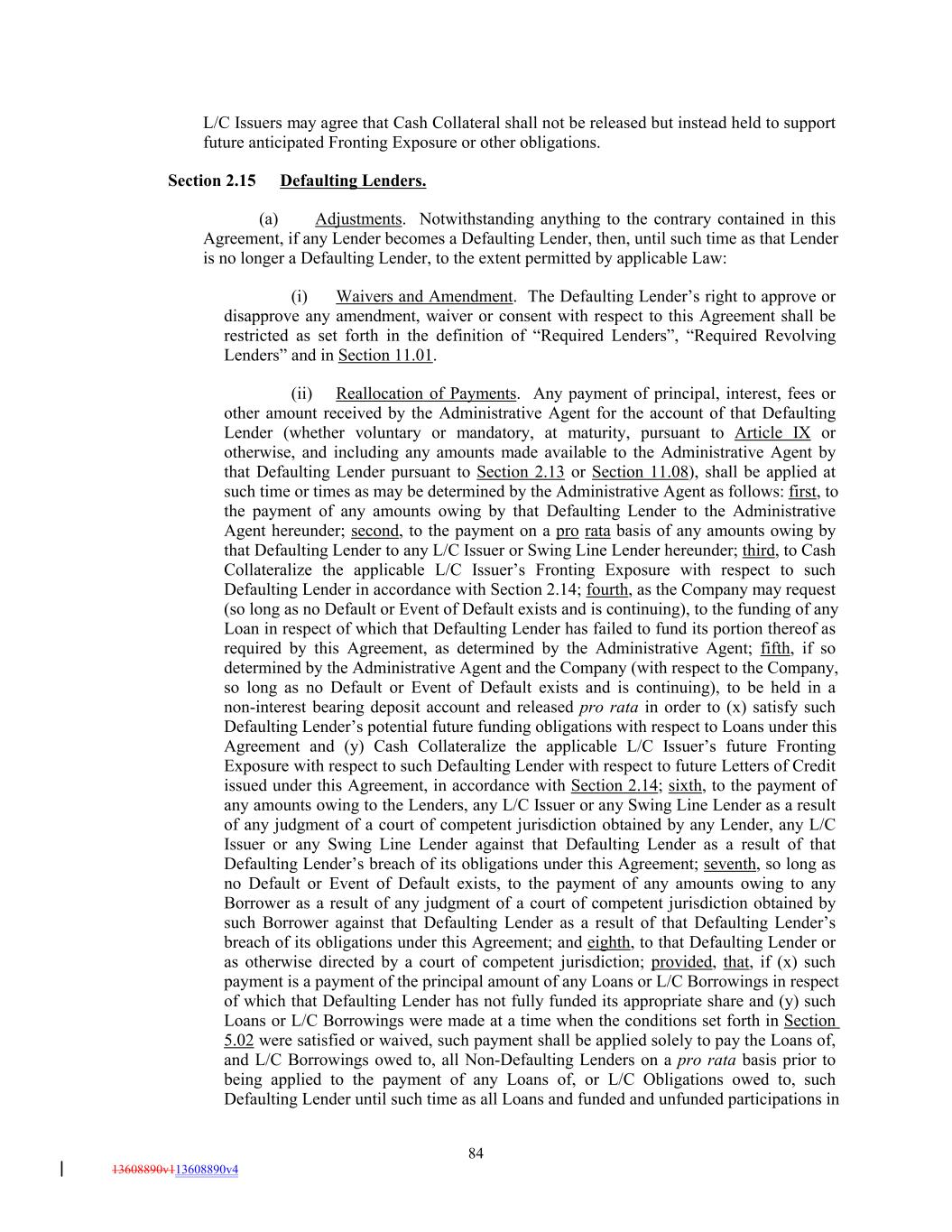 L/C Issuers may agree that Cash Collateral shall not be released but instead held to support future anticipated Fronting Exposure or other obligations. Section 2.15 Defaulting Lenders. (a) Adjustments. Notwithstanding anything to the contrary contained in this Agreement, if any Lender becomes a Defaulting Lender, then, until such time as that Lender is no longer a Defaulting Lender, to the extent permitted by applicable Law: (i) Waivers and Amendment. The Defaulting Lender’s right to approve or disapprove any amendment, waiver or consent with respect to this Agreement shall be restricted as set forth in the definition of “Required Lenders”, “Required Revolving Lenders” and in Section 11.01. (ii) Reallocation of Payments. Any payment of principal, interest, fees or other amount received by the Administrative Agent for the account of that Defaulting Lender (whether voluntary or mandatory, at maturity, pursuant to Article IX or otherwise, and including any amounts made available to the Administrative Agent by that Defaulting Lender pursuant to Section 2.13 or Section 11.08), shall be applied at such time or times as may be determined by the Administrative Agent as follows: first, to the payment of any amounts owing by that Defaulting Lender to the Administrative Agent hereunder; second, to the payment on a pro rata basis of any amounts owing by that Defaulting Lender to any L/C Issuer or Swing Line Lender hereunder; third, to Cash Collateralize the applicable L/C Issuer’s Fronting Exposure with respect to such Defaulting Lender in accordance with Section 2.14; fourth, as the Company may request (so long as no Default or Event of Default exists and is continuing), to the funding of any Loan in respect of which that Defaulting Lender has failed to fund its portion thereof as required by this Agreement, as determined by the Administrative Agent; fifth, if so determined by the Administrative Agent and the Company (with respect to the Company, so long as no Default or Event of Default exists and is continuing), to be held in a non-interest bearing deposit account and released pro rata in order to (x) satisfy such Defaulting Lender’s potential future funding obligations with respect to Loans under this Agreement and (y) Cash Collateralize the applicable L/C Issuer’s future Fronting Exposure with respect to such Defaulting Lender with respect to future Letters of Credit issued under this Agreement, in accordance with Section 2.14; sixth, to the payment of any amounts owing to the Lenders, any L/C Issuer or any Swing Line Lender as a result of any judgment of a court of competent jurisdiction obtained by any Lender, any L/C Issuer or any Swing Line Lender against that Defaulting Lender as a result of that Defaulting Lender’s breach of its obligations under this Agreement; seventh, so long as no Default or Event of Default exists, to the payment of any amounts owing to any Borrower as a result of any judgment of a court of competent jurisdiction obtained by such Borrower against that Defaulting Lender as a result of that Defaulting Lender’s breach of its obligations under this Agreement; and eighth, to that Defaulting Lender or as otherwise directed by a court of competent jurisdiction; provided, that, if (x) such payment is a payment of the principal amount of any Loans or L/C Borrowings in respect of which that Defaulting Lender has not fully funded its appropriate share and (y) such Loans or L/C Borrowings were made at a time when the conditions set forth in Section 5.02 were satisfied or waived, such payment shall be applied solely to pay the Loans of, and L/C Borrowings owed to, all Non-Defaulting Lenders on a pro rata basis prior to being applied to the payment of any Loans of, or L/C Obligations owed to, such Defaulting Lender until such time as all Loans and funded and unfunded participations in 84 13608890v113608890v4