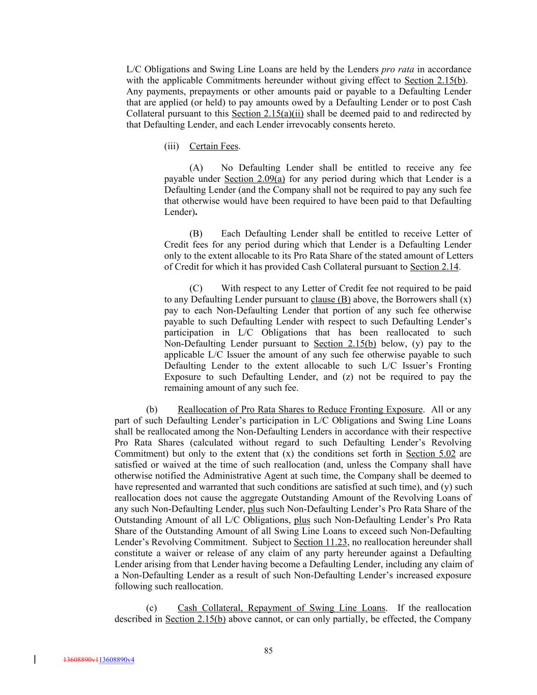 L/C Obligations and Swing Line Loans are held by the Lenders pro rata in accordance with the applicable Commitments hereunder without giving effect to Section 2.15(b). Any payments, prepayments or other amounts paid or payable to a Defaulting Lender that are applied (or held) to pay amounts owed by a Defaulting Lender or to post Cash Collateral pursuant to this Section 2.15(a)(ii) shall be deemed paid to and redirected by that Defaulting Lender, and each Lender irrevocably consents hereto. (iii) Certain Fees. (A) No Defaulting Lender shall be entitled to receive any fee payable under Section 2.09(a) for any period during which that Lender is a Defaulting Lender (and the Company shall not be required to pay any such fee that otherwise would have been required to have been paid to that Defaulting Lender). (B) Each Defaulting Lender shall be entitled to receive Letter of Credit fees for any period during which that Lender is a Defaulting Lender only to the extent allocable to its Pro Rata Share of the stated amount of Letters of Credit for which it has provided Cash Collateral pursuant to Section 2.14. (C) With respect to any Letter of Credit fee not required to be paid to any Defaulting Lender pursuant to clause (B) above, the Borrowers shall (x) pay to each Non-Defaulting Lender that portion of any such fee otherwise payable to such Defaulting Lender with respect to such Defaulting Lender’s participation in L/C Obligations that has been reallocated to such Non-Defaulting Lender pursuant to Section 2.15(b) below, (y) pay to the applicable L/C Issuer the amount of any such fee otherwise payable to such Defaulting Lender to the extent allocable to such L/C Issuer’s Fronting Exposure to such Defaulting Lender, and (z) not be required to pay the remaining amount of any such fee. (b) Reallocation of Pro Rata Shares to Reduce Fronting Exposure. All or any part of such Defaulting Lender’s participation in L/C Obligations and Swing Line Loans shall be reallocated among the Non-Defaulting Lenders in accordance with their respective Pro Rata Shares (calculated without regard to such Defaulting Lender’s Revolving Commitment) but only to the extent that (x) the conditions set forth in Section 5.02 are satisfied or waived at the time of such reallocation (and, unless the Company shall have otherwise notified the Administrative Agent at such time, the Company shall be deemed to have represented and warranted that such conditions are satisfied at such time), and (y) such reallocation does not cause the aggregate Outstanding Amount of the Revolving Loans of any such Non-Defaulting Lender, plus such Non-Defaulting Lender’s Pro Rata Share of the Outstanding Amount of all L/C Obligations, plus such Non-Defaulting Lender’s Pro Rata Share of the Outstanding Amount of all Swing Line Loans to exceed such Non-Defaulting Lender’s Revolving Commitment. Subject to Section 11.23, no reallocation hereunder shall constitute a waiver or release of any claim of any party hereunder against a Defaulting Lender arising from that Lender having become a Defaulting Lender, including any claim of a Non-Defaulting Lender as a result of such Non-Defaulting Lender’s increased exposure following such reallocation. (c) Cash Collateral, Repayment of Swing Line Loans. If the reallocation described in Section 2.15(b) above cannot, or can only partially, be effected, the Company 85 13608890v113608890v4