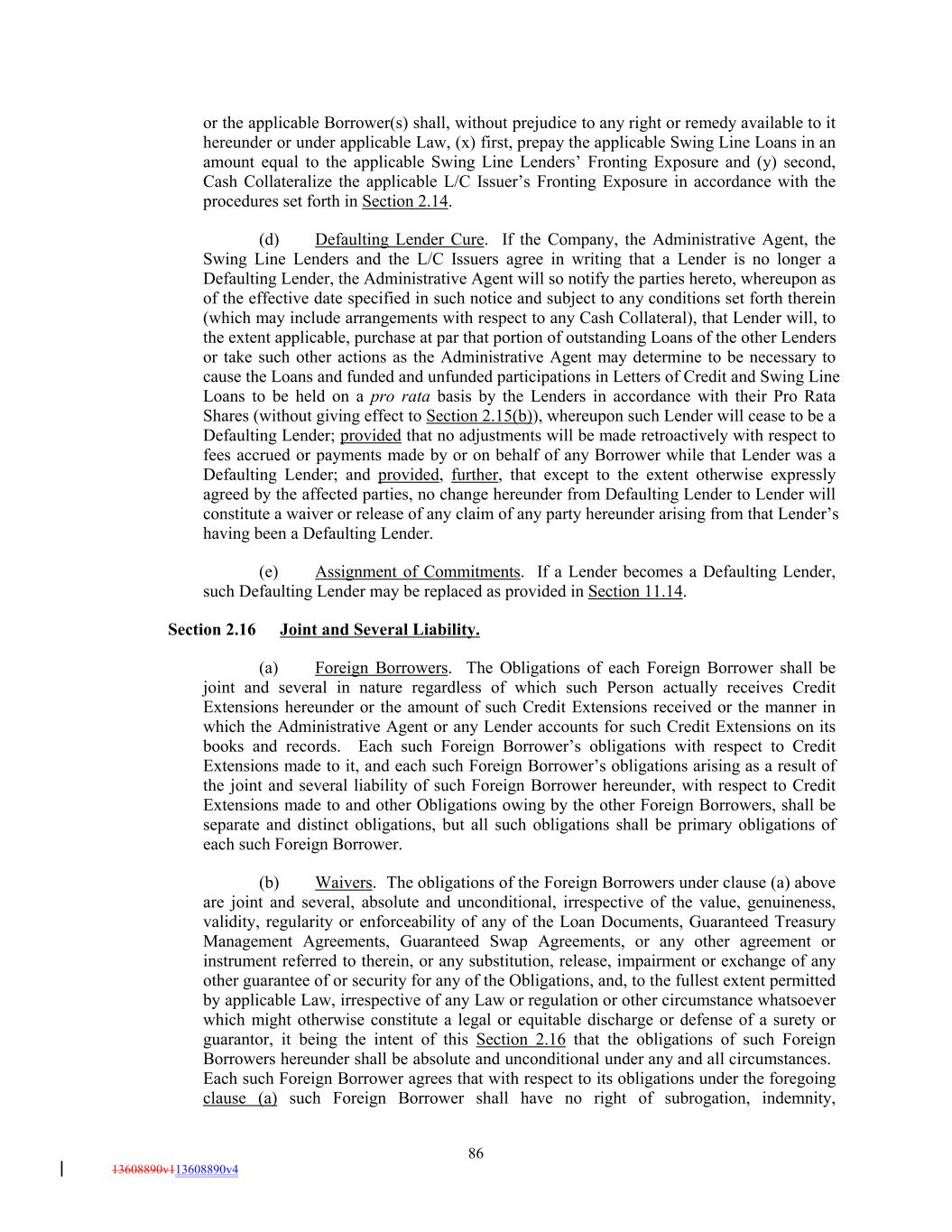 or the applicable Borrower(s) shall, without prejudice to any right or remedy available to it hereunder or under applicable Law, (x) first, prepay the applicable Swing Line Loans in an amount equal to the applicable Swing Line Lenders’ Fronting Exposure and (y) second, Cash Collateralize the applicable L/C Issuer’s Fronting Exposure in accordance with the procedures set forth in Section 2.14. (d) Defaulting Lender Cure. If the Company, the Administrative Agent, the Swing Line Lenders and the L/C Issuers agree in writing that a Lender is no longer a Defaulting Lender, the Administrative Agent will so notify the parties hereto, whereupon as of the effective date specified in such notice and subject to any conditions set forth therein (which may include arrangements with respect to any Cash Collateral), that Lender will, to the extent applicable, purchase at par that portion of outstanding Loans of the other Lenders or take such other actions as the Administrative Agent may determine to be necessary to cause the Loans and funded and unfunded participations in Letters of Credit and Swing Line Loans to be held on a pro rata basis by the Lenders in accordance with their Pro Rata Shares (without giving effect to Section 2.15(b)), whereupon such Lender will cease to be a Defaulting Lender; provided that no adjustments will be made retroactively with respect to fees accrued or payments made by or on behalf of any Borrower while that Lender was a Defaulting Lender; and provided, further, that except to the extent otherwise expressly agreed by the affected parties, no change hereunder from Defaulting Lender to Lender will constitute a waiver or release of any claim of any party hereunder arising from that Lender’s having been a Defaulting Lender. (e) Assignment of Commitments. If a Lender becomes a Defaulting Lender, such Defaulting Lender may be replaced as provided in Section 11.14. Section 2.16 Joint and Several Liability. (a) Foreign Borrowers. The Obligations of each Foreign Borrower shall be joint and several in nature regardless of which such Person actually receives Credit Extensions hereunder or the amount of such Credit Extensions received or the manner in which the Administrative Agent or any Lender accounts for such Credit Extensions on its books and records. Each such Foreign Borrower’s obligations with respect to Credit Extensions made to it, and each such Foreign Borrower’s obligations arising as a result of the joint and several liability of such Foreign Borrower hereunder, with respect to Credit Extensions made to and other Obligations owing by the other Foreign Borrowers, shall be separate and distinct obligations, but all such obligations shall be primary obligations of each such Foreign Borrower. (b) Waivers. The obligations of the Foreign Borrowers under clause (a) above are joint and several, absolute and unconditional, irrespective of the value, genuineness, validity, regularity or enforceability of any of the Loan Documents, Guaranteed Treasury Management Agreements, Guaranteed Swap Agreements, or any other agreement or instrument referred to therein, or any substitution, release, impairment or exchange of any other guarantee of or security for any of the Obligations, and, to the fullest extent permitted by applicable Law, irrespective of any Law or regulation or other circumstance whatsoever which might otherwise constitute a legal or equitable discharge or defense of a surety or guarantor, it being the intent of this Section 2.16 that the obligations of such Foreign Borrowers hereunder shall be absolute and unconditional under any and all circumstances. Each such Foreign Borrower agrees that with respect to its obligations under the foregoing clause (a) such Foreign Borrower shall have no right of subrogation, indemnity, 86 13608890v113608890v4