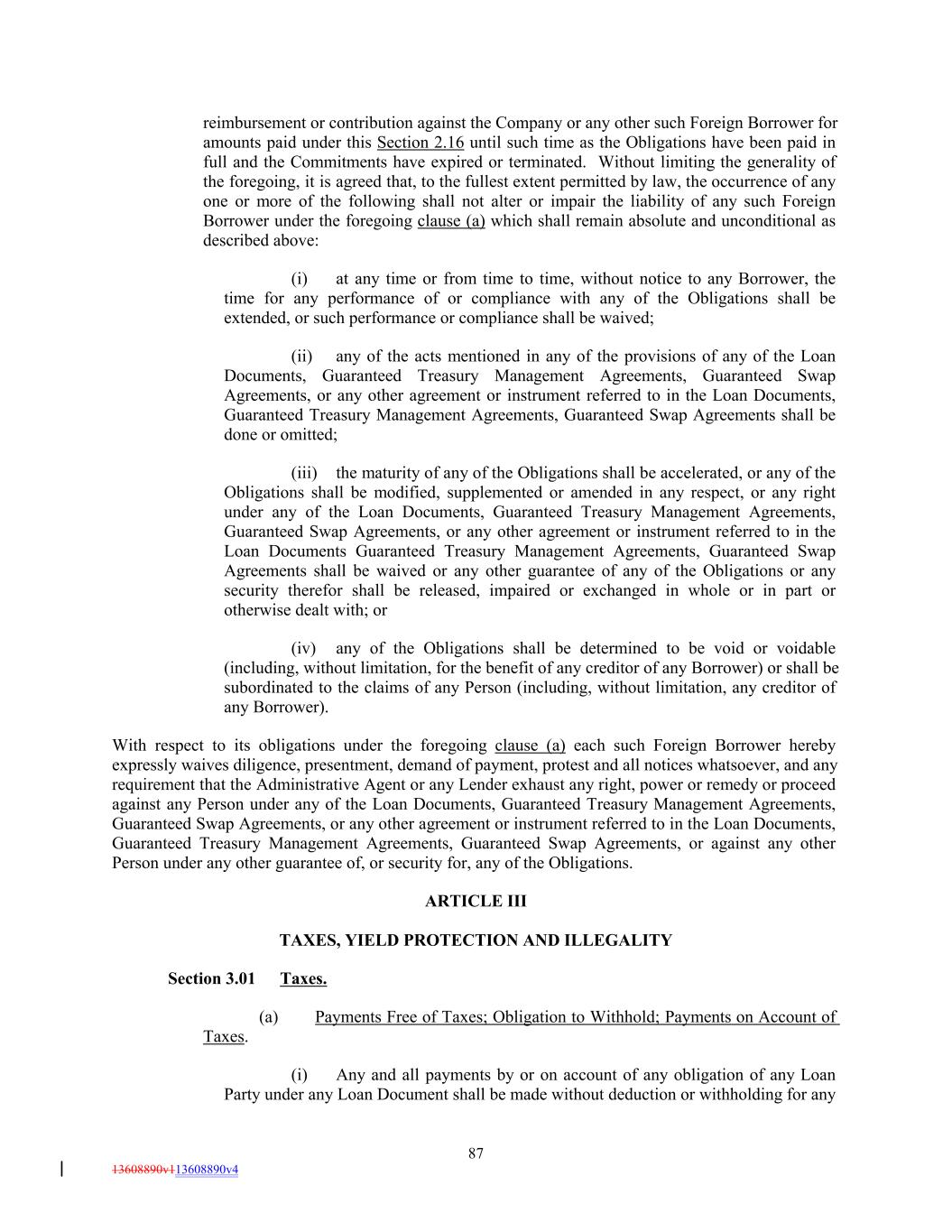 reimbursement or contribution against the Company or any other such Foreign Borrower for amounts paid under this Section 2.16 until such time as the Obligations have been paid in full and the Commitments have expired or terminated. Without limiting the generality of the foregoing, it is agreed that, to the fullest extent permitted by law, the occurrence of any one or more of the following shall not alter or impair the liability of any such Foreign Borrower under the foregoing clause (a) which shall remain absolute and unconditional as described above: (i) at any time or from time to time, without notice to any Borrower, the time for any performance of or compliance with any of the Obligations shall be extended, or such performance or compliance shall be waived; (ii) any of the acts mentioned in any of the provisions of any of the Loan Documents, Guaranteed Treasury Management Agreements, Guaranteed Swap Agreements, or any other agreement or instrument referred to in the Loan Documents, Guaranteed Treasury Management Agreements, Guaranteed Swap Agreements shall be done or omitted; (iii) the maturity of any of the Obligations shall be accelerated, or any of the Obligations shall be modified, supplemented or amended in any respect, or any right under any of the Loan Documents, Guaranteed Treasury Management Agreements, Guaranteed Swap Agreements, or any other agreement or instrument referred to in the Loan Documents Guaranteed Treasury Management Agreements, Guaranteed Swap Agreements shall be waived or any other guarantee of any of the Obligations or any security therefor shall be released, impaired or exchanged in whole or in part or otherwise dealt with; or (iv) any of the Obligations shall be determined to be void or voidable (including, without limitation, for the benefit of any creditor of any Borrower) or shall be subordinated to the claims of any Person (including, without limitation, any creditor of any Borrower). With respect to its obligations under the foregoing clause (a) each such Foreign Borrower hereby expressly waives diligence, presentment, demand of payment, protest and all notices whatsoever, and any requirement that the Administrative Agent or any Lender exhaust any right, power or remedy or proceed against any Person under any of the Loan Documents, Guaranteed Treasury Management Agreements, Guaranteed Swap Agreements, or any other agreement or instrument referred to in the Loan Documents, Guaranteed Treasury Management Agreements, Guaranteed Swap Agreements, or against any other Person under any other guarantee of, or security for, any of the Obligations. ARTICLE III TAXES, YIELD PROTECTION AND ILLEGALITY Section 3.01 Taxes. (a) Payments Free of Taxes; Obligation to Withhold; Payments on Account of Taxes. (i) Any and all payments by or on account of any obligation of any Loan Party under any Loan Document shall be made without deduction or withholding for any 87 13608890v113608890v4