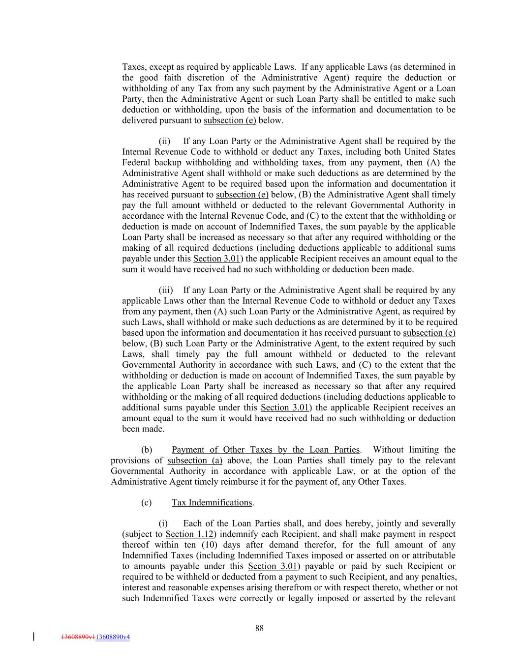 Taxes, except as required by applicable Laws. If any applicable Laws (as determined in the good faith discretion of the Administrative Agent) require the deduction or withholding of any Tax from any such payment by the Administrative Agent or a Loan Party, then the Administrative Agent or such Loan Party shall be entitled to make such deduction or withholding, upon the basis of the information and documentation to be delivered pursuant to subsection (e) below. (ii) If any Loan Party or the Administrative Agent shall be required by the Internal Revenue Code to withhold or deduct any Taxes, including both United States Federal backup withholding and withholding taxes, from any payment, then (A) the Administrative Agent shall withhold or make such deductions as are determined by the Administrative Agent to be required based upon the information and documentation it has received pursuant to subsection (e) below, (B) the Administrative Agent shall timely pay the full amount withheld or deducted to the relevant Governmental Authority in accordance with the Internal Revenue Code, and (C) to the extent that the withholding or deduction is made on account of Indemnified Taxes, the sum payable by the applicable Loan Party shall be increased as necessary so that after any required withholding or the making of all required deductions (including deductions applicable to additional sums payable under this Section 3.01) the applicable Recipient receives an amount equal to the sum it would have received had no such withholding or deduction been made. (iii) If any Loan Party or the Administrative Agent shall be required by any applicable Laws other than the Internal Revenue Code to withhold or deduct any Taxes from any payment, then (A) such Loan Party or the Administrative Agent, as required by such Laws, shall withhold or make such deductions as are determined by it to be required based upon the information and documentation it has received pursuant to subsection (e) below, (B) such Loan Party or the Administrative Agent, to the extent required by such Laws, shall timely pay the full amount withheld or deducted to the relevant Governmental Authority in accordance with such Laws, and (C) to the extent that the withholding or deduction is made on account of Indemnified Taxes, the sum payable by the applicable Loan Party shall be increased as necessary so that after any required withholding or the making of all required deductions (including deductions applicable to additional sums payable under this Section 3.01) the applicable Recipient receives an amount equal to the sum it would have received had no such withholding or deduction been made. (b) Payment of Other Taxes by the Loan Parties. Without limiting the provisions of subsection (a) above, the Loan Parties shall timely pay to the relevant Governmental Authority in accordance with applicable Law, or at the option of the Administrative Agent timely reimburse it for the payment of, any Other Taxes. (c) Tax Indemnifications. (i) Each of the Loan Parties shall, and does hereby, jointly and severally (subject to Section 1.12) indemnify each Recipient, and shall make payment in respect thereof within ten (10) days after demand therefor, for the full amount of any Indemnified Taxes (including Indemnified Taxes imposed or asserted on or attributable to amounts payable under this Section 3.01) payable or paid by such Recipient or required to be withheld or deducted from a payment to such Recipient, and any penalties, interest and reasonable expenses arising therefrom or with respect thereto, whether or not such Indemnified Taxes were correctly or legally imposed or asserted by the relevant 88 13608890v113608890v4