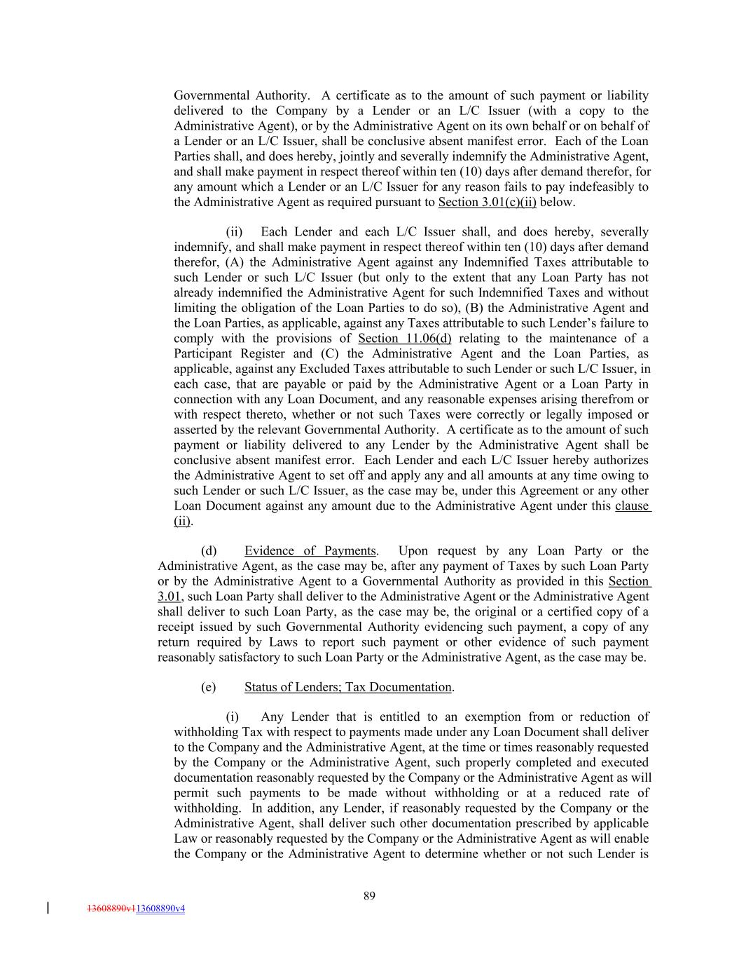 Governmental Authority. A certificate as to the amount of such payment or liability delivered to the Company by a Lender or an L/C Issuer (with a copy to the Administrative Agent), or by the Administrative Agent on its own behalf or on behalf of a Lender or an L/C Issuer, shall be conclusive absent manifest error. Each of the Loan Parties shall, and does hereby, jointly and severally indemnify the Administrative Agent, and shall make payment in respect thereof within ten (10) days after demand therefor, for any amount which a Lender or an L/C Issuer for any reason fails to pay indefeasibly to the Administrative Agent as required pursuant to Section 3.01(c)(ii) below. (ii) Each Lender and each L/C Issuer shall, and does hereby, severally indemnify, and shall make payment in respect thereof within ten (10) days after demand therefor, (A) the Administrative Agent against any Indemnified Taxes attributable to such Lender or such L/C Issuer (but only to the extent that any Loan Party has not already indemnified the Administrative Agent for such Indemnified Taxes and without limiting the obligation of the Loan Parties to do so), (B) the Administrative Agent and the Loan Parties, as applicable, against any Taxes attributable to such Lender’s failure to comply with the provisions of Section 11.06(d) relating to the maintenance of a Participant Register and (C) the Administrative Agent and the Loan Parties, as applicable, against any Excluded Taxes attributable to such Lender or such L/C Issuer, in each case, that are payable or paid by the Administrative Agent or a Loan Party in connection with any Loan Document, and any reasonable expenses arising therefrom or with respect thereto, whether or not such Taxes were correctly or legally imposed or asserted by the relevant Governmental Authority. A certificate as to the amount of such payment or liability delivered to any Lender by the Administrative Agent shall be conclusive absent manifest error. Each Lender and each L/C Issuer hereby authorizes the Administrative Agent to set off and apply any and all amounts at any time owing to such Lender or such L/C Issuer, as the case may be, under this Agreement or any other Loan Document against any amount due to the Administrative Agent under this clause (ii). (d) Evidence of Payments. Upon request by any Loan Party or the Administrative Agent, as the case may be, after any payment of Taxes by such Loan Party or by the Administrative Agent to a Governmental Authority as provided in this Section 3.01, such Loan Party shall deliver to the Administrative Agent or the Administrative Agent shall deliver to such Loan Party, as the case may be, the original or a certified copy of a receipt issued by such Governmental Authority evidencing such payment, a copy of any return required by Laws to report such payment or other evidence of such payment reasonably satisfactory to such Loan Party or the Administrative Agent, as the case may be. (e) Status of Lenders; Tax Documentation. (i) Any Lender that is entitled to an exemption from or reduction of withholding Tax with respect to payments made under any Loan Document shall deliver to the Company and the Administrative Agent, at the time or times reasonably requested by the Company or the Administrative Agent, such properly completed and executed documentation reasonably requested by the Company or the Administrative Agent as will permit such payments to be made without withholding or at a reduced rate of withholding. In addition, any Lender, if reasonably requested by the Company or the Administrative Agent, shall deliver such other documentation prescribed by applicable Law or reasonably requested by the Company or the Administrative Agent as will enable the Company or the Administrative Agent to determine whether or not such Lender is 89 13608890v113608890v4