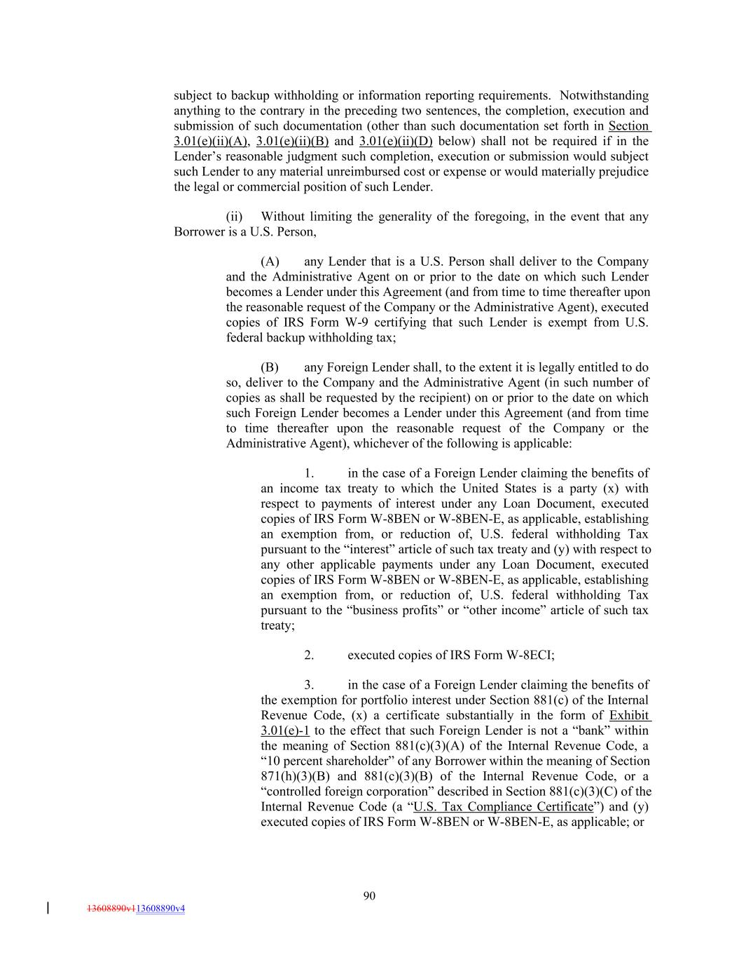 subject to backup withholding or information reporting requirements. Notwithstanding anything to the contrary in the preceding two sentences, the completion, execution and submission of such documentation (other than such documentation set forth in Section 3.01(e)(ii)(A), 3.01(e)(ii)(B) and 3.01(e)(ii)(D) below) shall not be required if in the Lender’s reasonable judgment such completion, execution or submission would subject such Lender to any material unreimbursed cost or expense or would materially prejudice the legal or commercial position of such Lender. (ii) Without limiting the generality of the foregoing, in the event that any Borrower is a U.S. Person, (A) any Lender that is a U.S. Person shall deliver to the Company and the Administrative Agent on or prior to the date on which such Lender becomes a Lender under this Agreement (and from time to time thereafter upon the reasonable request of the Company or the Administrative Agent), executed copies of IRS Form W-9 certifying that such Lender is exempt from U.S. federal backup withholding tax; (B) any Foreign Lender shall, to the extent it is legally entitled to do so, deliver to the Company and the Administrative Agent (in such number of copies as shall be requested by the recipient) on or prior to the date on which such Foreign Lender becomes a Lender under this Agreement (and from time to time thereafter upon the reasonable request of the Company or the Administrative Agent), whichever of the following is applicable: 1. in the case of a Foreign Lender claiming the benefits of an income tax treaty to which the United States is a party (x) with respect to payments of interest under any Loan Document, executed copies of IRS Form W-8BEN or W-8BEN-E, as applicable, establishing an exemption from, or reduction of, U.S. federal withholding Tax pursuant to the “interest” article of such tax treaty and (y) with respect to any other applicable payments under any Loan Document, executed copies of IRS Form W-8BEN or W-8BEN-E, as applicable, establishing an exemption from, or reduction of, U.S. federal withholding Tax pursuant to the “business profits” or “other income” article of such tax treaty; 2. executed copies of IRS Form W-8ECI; 3. in the case of a Foreign Lender claiming the benefits of the exemption for portfolio interest under Section 881(c) of the Internal Revenue Code, (x) a certificate substantially in the form of Exhibit 3.01(e)-1 to the effect that such Foreign Lender is not a “bank” within the meaning of Section 881(c)(3)(A) of the Internal Revenue Code, a “10 percent shareholder” of any Borrower within the meaning of Section 871(h)(3)(B) and 881(c)(3)(B) of the Internal Revenue Code, or a “controlled foreign corporation” described in Section 881(c)(3)(C) of the Internal Revenue Code (a “U.S. Tax Compliance Certificate”) and (y) executed copies of IRS Form W-8BEN or W-8BEN-E, as applicable; or 90 13608890v113608890v4