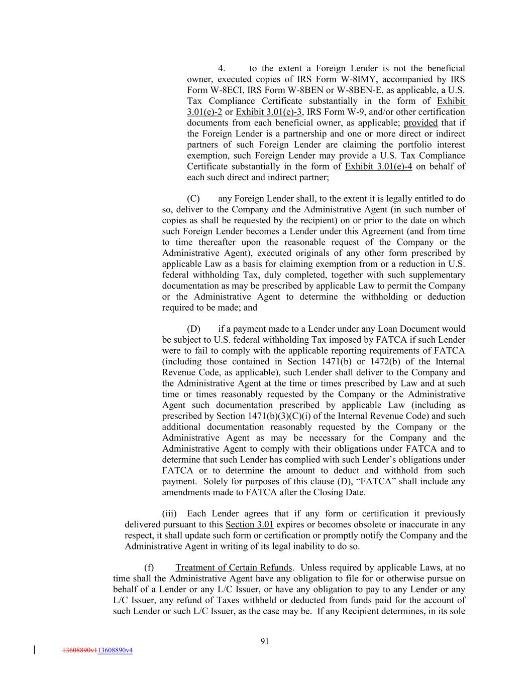 4. to the extent a Foreign Lender is not the beneficial owner, executed copies of IRS Form W-8IMY, accompanied by IRS Form W-8ECI, IRS Form W-8BEN or W-8BEN-E, as applicable, a U.S. Tax Compliance Certificate substantially in the form of Exhibit 3.01(e)-2 or Exhibit 3.01(e)-3, IRS Form W-9, and/or other certification documents from each beneficial owner, as applicable; provided that if the Foreign Lender is a partnership and one or more direct or indirect partners of such Foreign Lender are claiming the portfolio interest exemption, such Foreign Lender may provide a U.S. Tax Compliance Certificate substantially in the form of Exhibit 3.01(e)-4 on behalf of each such direct and indirect partner; (C) any Foreign Lender shall, to the extent it is legally entitled to do so, deliver to the Company and the Administrative Agent (in such number of copies as shall be requested by the recipient) on or prior to the date on which such Foreign Lender becomes a Lender under this Agreement (and from time to time thereafter upon the reasonable request of the Company or the Administrative Agent), executed originals of any other form prescribed by applicable Law as a basis for claiming exemption from or a reduction in U.S. federal withholding Tax, duly completed, together with such supplementary documentation as may be prescribed by applicable Law to permit the Company or the Administrative Agent to determine the withholding or deduction required to be made; and (D) if a payment made to a Lender under any Loan Document would be subject to U.S. federal withholding Tax imposed by FATCA if such Lender were to fail to comply with the applicable reporting requirements of FATCA (including those contained in Section 1471(b) or 1472(b) of the Internal Revenue Code, as applicable), such Lender shall deliver to the Company and the Administrative Agent at the time or times prescribed by Law and at such time or times reasonably requested by the Company or the Administrative Agent such documentation prescribed by applicable Law (including as prescribed by Section 1471(b)(3)(C)(i) of the Internal Revenue Code) and such additional documentation reasonably requested by the Company or the Administrative Agent as may be necessary for the Company and the Administrative Agent to comply with their obligations under FATCA and to determine that such Lender has complied with such Lender’s obligations under FATCA or to determine the amount to deduct and withhold from such payment. Solely for purposes of this clause (D), “FATCA” shall include any amendments made to FATCA after the Closing Date. (iii) Each Lender agrees that if any form or certification it previously delivered pursuant to this Section 3.01 expires or becomes obsolete or inaccurate in any respect, it shall update such form or certification or promptly notify the Company and the Administrative Agent in writing of its legal inability to do so. (f) Treatment of Certain Refunds. Unless required by applicable Laws, at no time shall the Administrative Agent have any obligation to file for or otherwise pursue on behalf of a Lender or any L/C Issuer, or have any obligation to pay to any Lender or any L/C Issuer, any refund of Taxes withheld or deducted from funds paid for the account of such Lender or such L/C Issuer, as the case may be. If any Recipient determines, in its sole 91 13608890v113608890v4