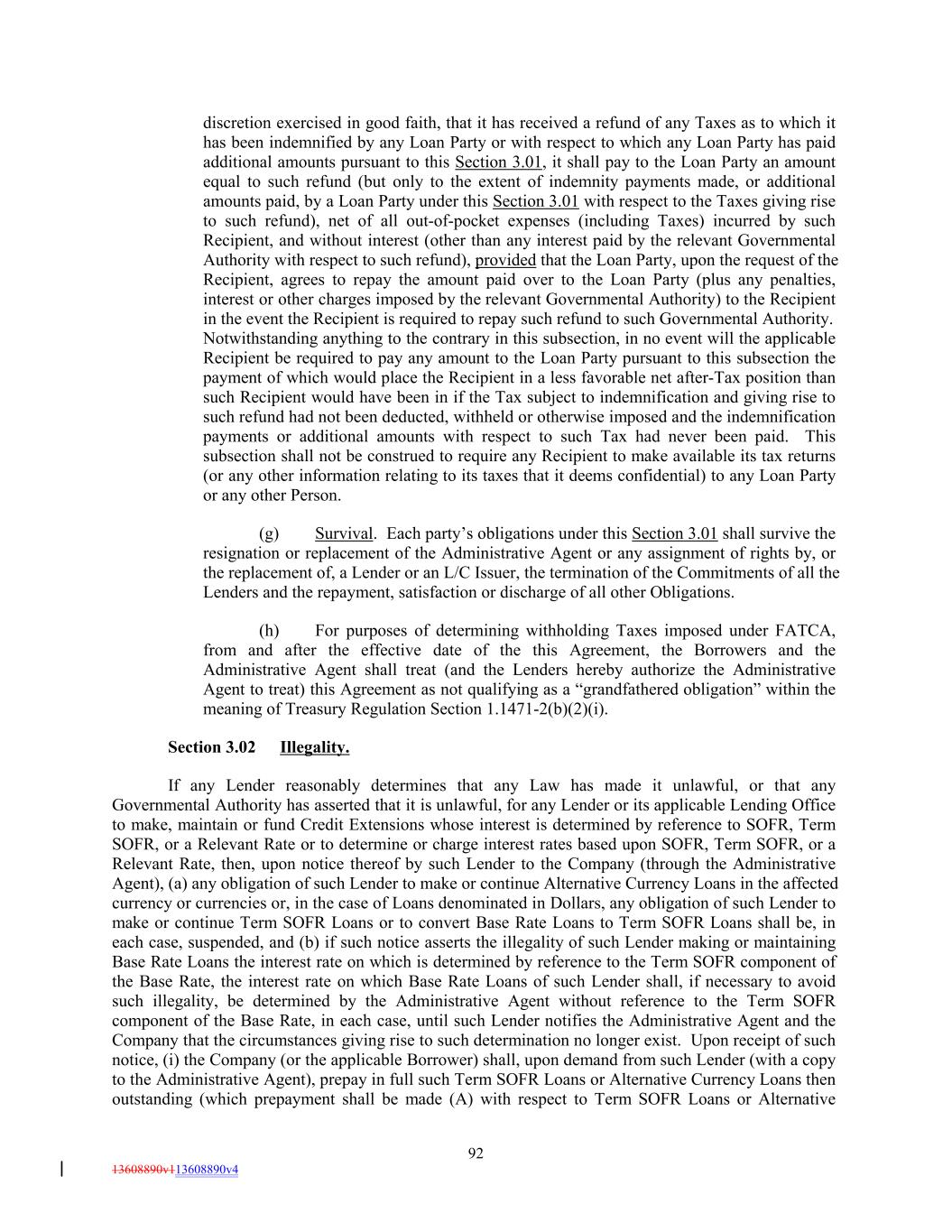 discretion exercised in good faith, that it has received a refund of any Taxes as to which it has been indemnified by any Loan Party or with respect to which any Loan Party has paid additional amounts pursuant to this Section 3.01, it shall pay to the Loan Party an amount equal to such refund (but only to the extent of indemnity payments made, or additional amounts paid, by a Loan Party under this Section 3.01 with respect to the Taxes giving rise to such refund), net of all out-of-pocket expenses (including Taxes) incurred by such Recipient, and without interest (other than any interest paid by the relevant Governmental Authority with respect to such refund), provided that the Loan Party, upon the request of the Recipient, agrees to repay the amount paid over to the Loan Party (plus any penalties, interest or other charges imposed by the relevant Governmental Authority) to the Recipient in the event the Recipient is required to repay such refund to such Governmental Authority. Notwithstanding anything to the contrary in this subsection, in no event will the applicable Recipient be required to pay any amount to the Loan Party pursuant to this subsection the payment of which would place the Recipient in a less favorable net after-Tax position than such Recipient would have been in if the Tax subject to indemnification and giving rise to such refund had not been deducted, withheld or otherwise imposed and the indemnification payments or additional amounts with respect to such Tax had never been paid. This subsection shall not be construed to require any Recipient to make available its tax returns (or any other information relating to its taxes that it deems confidential) to any Loan Party or any other Person. (g) Survival. Each party’s obligations under this Section 3.01 shall survive the resignation or replacement of the Administrative Agent or any assignment of rights by, or the replacement of, a Lender or an L/C Issuer, the termination of the Commitments of all the Lenders and the repayment, satisfaction or discharge of all other Obligations. (h) For purposes of determining withholding Taxes imposed under FATCA, from and after the effective date of the this Agreement, the Borrowers and the Administrative Agent shall treat (and the Lenders hereby authorize the Administrative Agent to treat) this Agreement as not qualifying as a “grandfathered obligation” within the meaning of Treasury Regulation Section 1.1471-2(b)(2)(i). Section 3.02 Illegality. If any Lender reasonably determines that any Law has made it unlawful, or that any Governmental Authority has asserted that it is unlawful, for any Lender or its applicable Lending Office to make, maintain or fund Credit Extensions whose interest is determined by reference to SOFR, Term SOFR, or a Relevant Rate or to determine or charge interest rates based upon SOFR, Term SOFR, or a Relevant Rate, then, upon notice thereof by such Lender to the Company (through the Administrative Agent), (a) any obligation of such Lender to make or continue Alternative Currency Loans in the affected currency or currencies or, in the case of Loans denominated in Dollars, any obligation of such Lender to make or continue Term SOFR Loans or to convert Base Rate Loans to Term SOFR Loans shall be, in each case, suspended, and (b) if such notice asserts the illegality of such Lender making or maintaining Base Rate Loans the interest rate on which is determined by reference to the Term SOFR component of the Base Rate, the interest rate on which Base Rate Loans of such Lender shall, if necessary to avoid such illegality, be determined by the Administrative Agent without reference to the Term SOFR component of the Base Rate, in each case, until such Lender notifies the Administrative Agent and the Company that the circumstances giving rise to such determination no longer exist. Upon receipt of such notice, (i) the Company (or the applicable Borrower) shall, upon demand from such Lender (with a copy to the Administrative Agent), prepay in full such Term SOFR Loans or Alternative Currency Loans then outstanding (which prepayment shall be made (A) with respect to Term SOFR Loans or Alternative 92 13608890v113608890v4