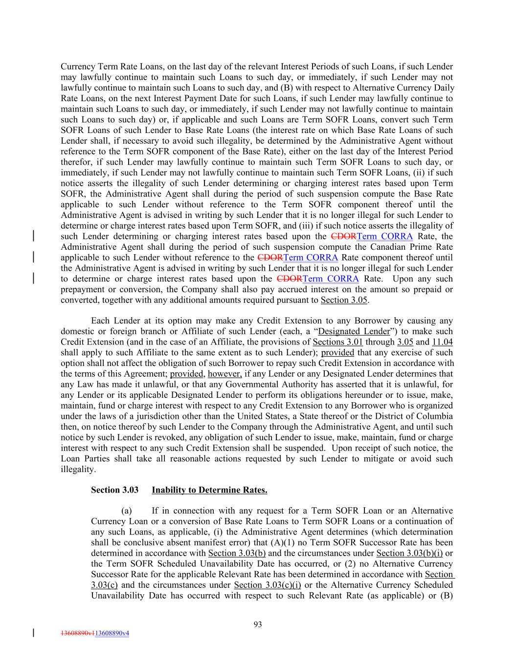 Currency Term Rate Loans, on the last day of the relevant Interest Periods of such Loans, if such Lender may lawfully continue to maintain such Loans to such day, or immediately, if such Lender may not lawfully continue to maintain such Loans to such day, and (B) with respect to Alternative Currency Daily Rate Loans, on the next Interest Payment Date for such Loans, if such Lender may lawfully continue to maintain such Loans to such day, or immediately, if such Lender may not lawfully continue to maintain such Loans to such day) or, if applicable and such Loans are Term SOFR Loans, convert such Term SOFR Loans of such Lender to Base Rate Loans (the interest rate on which Base Rate Loans of such Lender shall, if necessary to avoid such illegality, be determined by the Administrative Agent without reference to the Term SOFR component of the Base Rate), either on the last day of the Interest Period therefor, if such Lender may lawfully continue to maintain such Term SOFR Loans to such day, or immediately, if such Lender may not lawfully continue to maintain such Term SOFR Loans, (ii) if such notice asserts the illegality of such Lender determining or charging interest rates based upon Term SOFR, the Administrative Agent shall during the period of such suspension compute the Base Rate applicable to such Lender without reference to the Term SOFR component thereof until the Administrative Agent is advised in writing by such Lender that it is no longer illegal for such Lender to determine or charge interest rates based upon Term SOFR, and (iii) if such notice asserts the illegality of such Lender determining or charging interest rates based upon the CDORTerm CORRA Rate, the Administrative Agent shall during the period of such suspension compute the Canadian Prime Rate applicable to such Lender without reference to the CDORTerm CORRA Rate component thereof until the Administrative Agent is advised in writing by such Lender that it is no longer illegal for such Lender to determine or charge interest rates based upon the CDORTerm CORRA Rate. Upon any such prepayment or conversion, the Company shall also pay accrued interest on the amount so prepaid or converted, together with any additional amounts required pursuant to Section 3.05. Each Lender at its option may make any Credit Extension to any Borrower by causing any domestic or foreign branch or Affiliate of such Lender (each, a “Designated Lender”) to make such Credit Extension (and in the case of an Affiliate, the provisions of Sections 3.01 through 3.05 and 11.04 shall apply to such Affiliate to the same extent as to such Lender); provided that any exercise of such option shall not affect the obligation of such Borrower to repay such Credit Extension in accordance with the terms of this Agreement; provided, however, if any Lender or any Designated Lender determines that any Law has made it unlawful, or that any Governmental Authority has asserted that it is unlawful, for any Lender or its applicable Designated Lender to perform its obligations hereunder or to issue, make, maintain, fund or charge interest with respect to any Credit Extension to any Borrower who is organized under the laws of a jurisdiction other than the United States, a State thereof or the District of Columbia then, on notice thereof by such Lender to the Company through the Administrative Agent, and until such notice by such Lender is revoked, any obligation of such Lender to issue, make, maintain, fund or charge interest with respect to any such Credit Extension shall be suspended. Upon receipt of such notice, the Loan Parties shall take all reasonable actions requested by such Lender to mitigate or avoid such illegality. Section 3.03 Inability to Determine Rates. (a) If in connection with any request for a Term SOFR Loan or an Alternative Currency Loan or a conversion of Base Rate Loans to Term SOFR Loans or a continuation of any such Loans, as applicable, (i) the Administrative Agent determines (which determination shall be conclusive absent manifest error) that (A)(1) no Term SOFR Successor Rate has been determined in accordance with Section 3.03(b) and the circumstances under Section 3.03(b)(i) or the Term SOFR Scheduled Unavailability Date has occurred, or (2) no Alternative Currency Successor Rate for the applicable Relevant Rate has been determined in accordance with Section 3.03(c) and the circumstances under Section 3.03(c)(i) or the Alternative Currency Scheduled Unavailability Date has occurred with respect to such Relevant Rate (as applicable) or (B) 93 13608890v113608890v4
